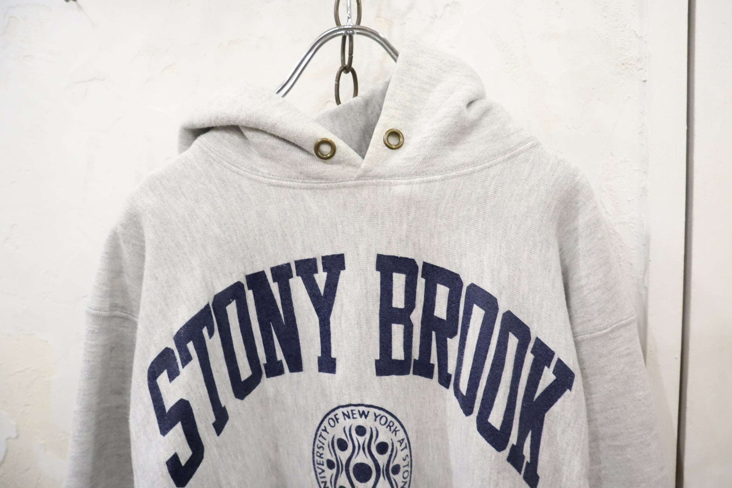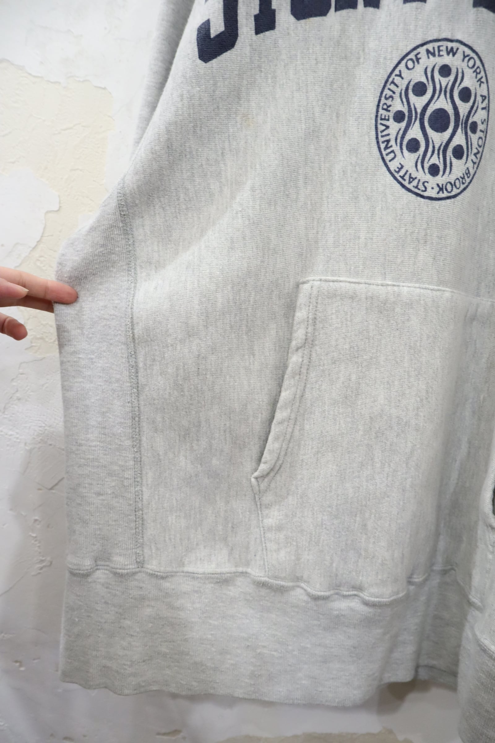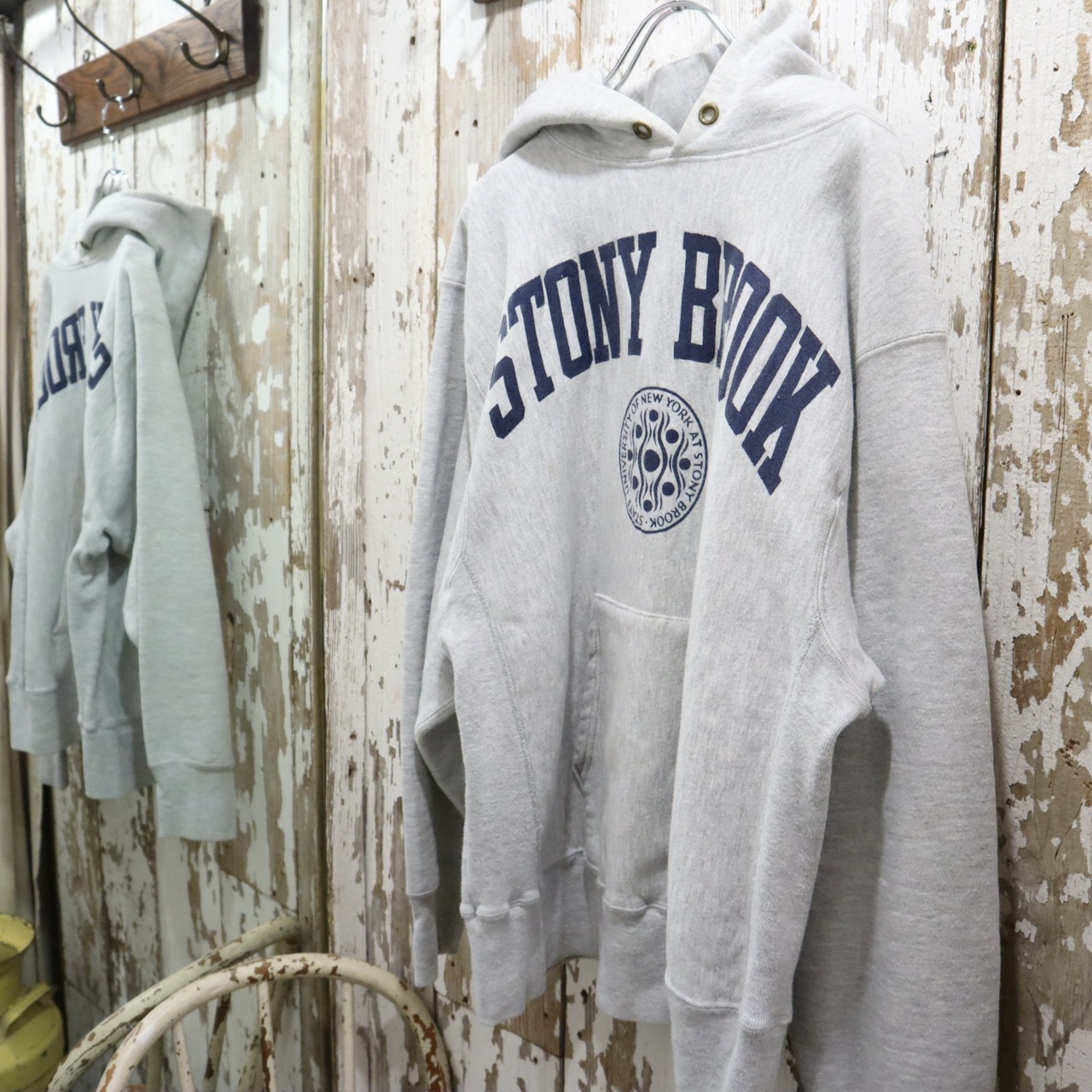 80s champion gray×navy rubber print reverse weave hoodie sweat [k-4667]