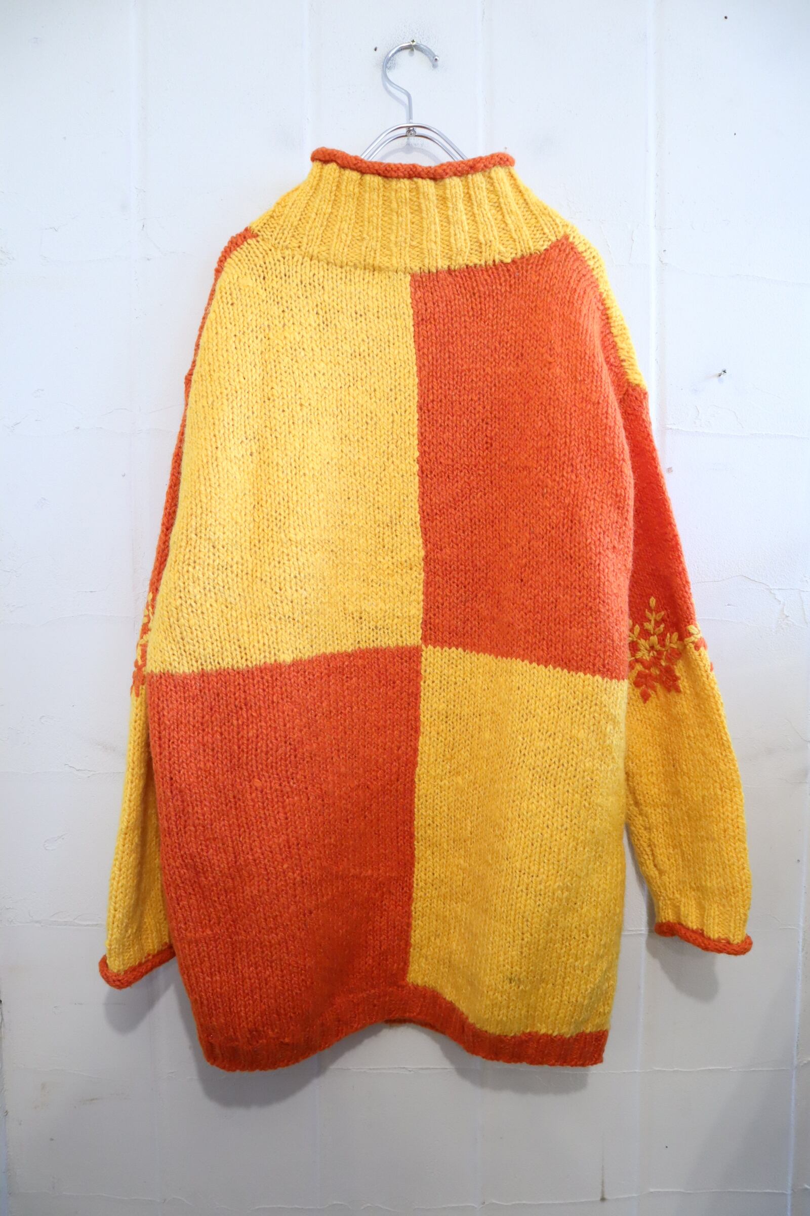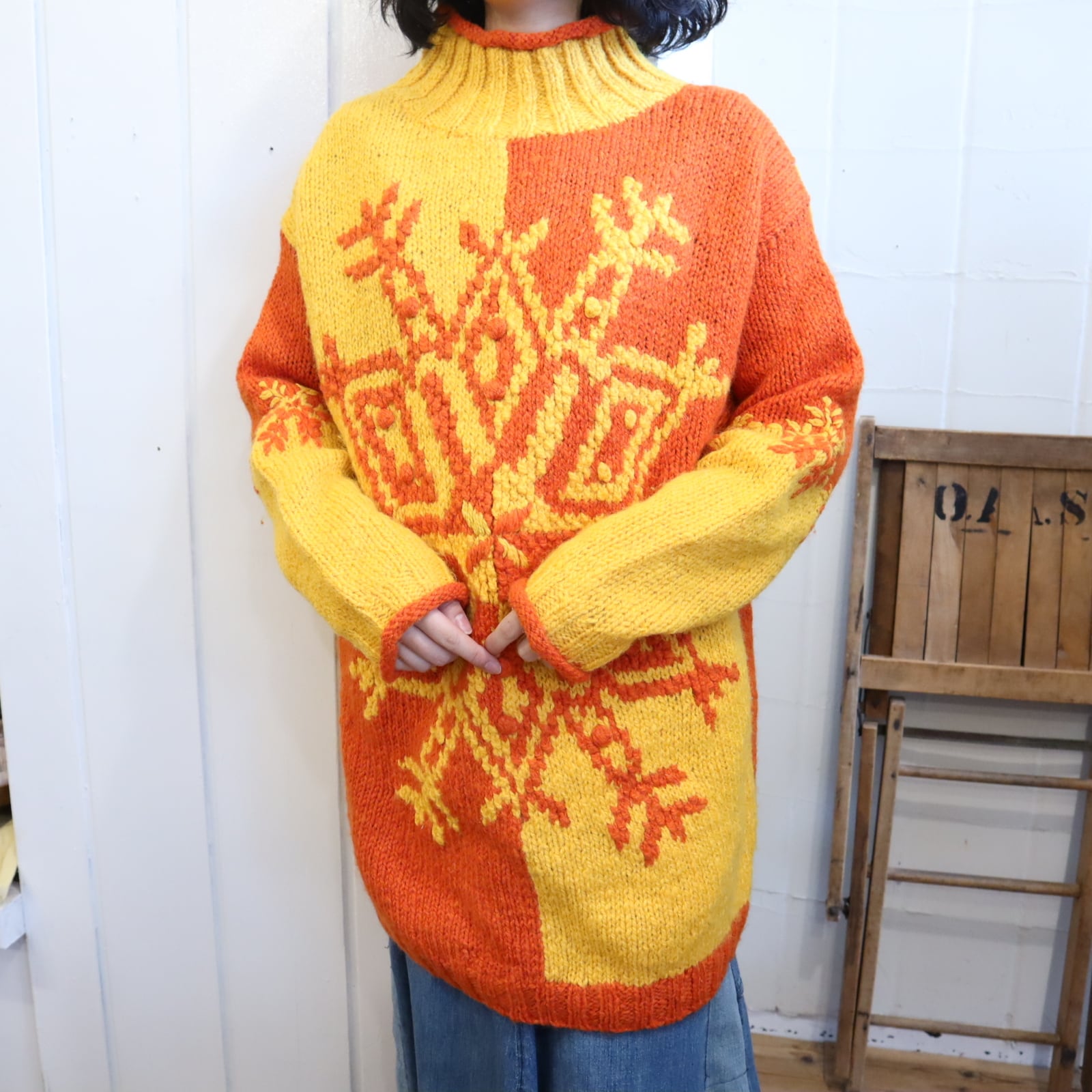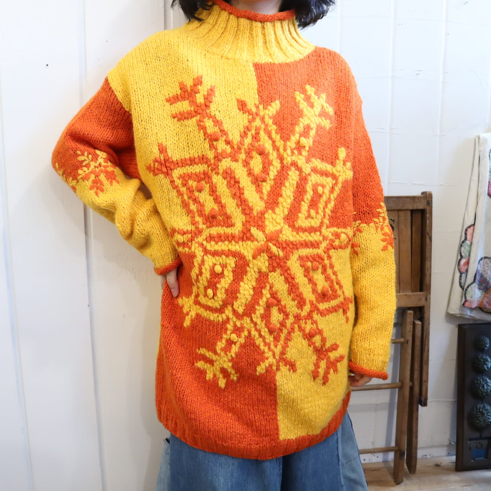 yellow×orange snowflake motif knit pullover [l-4673]