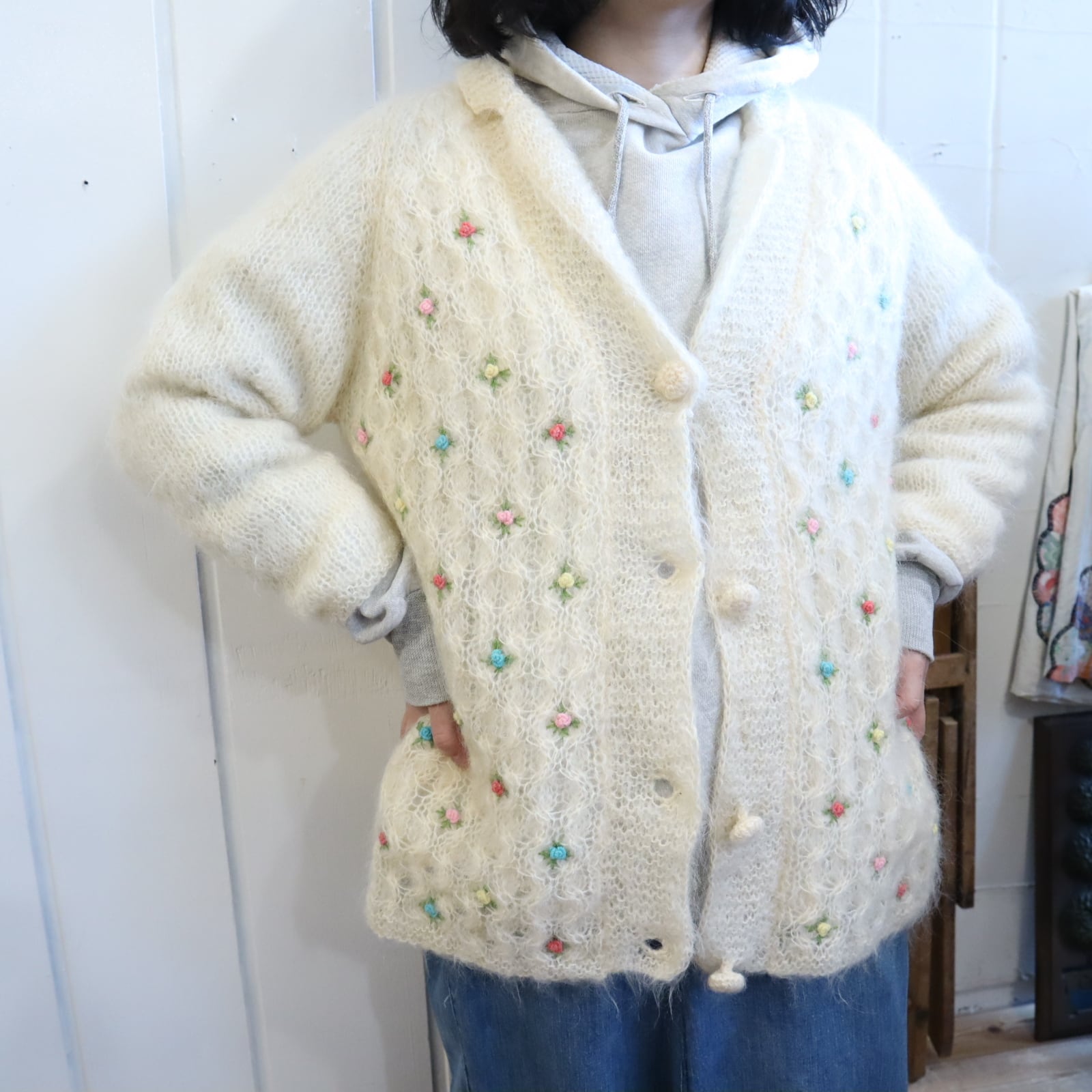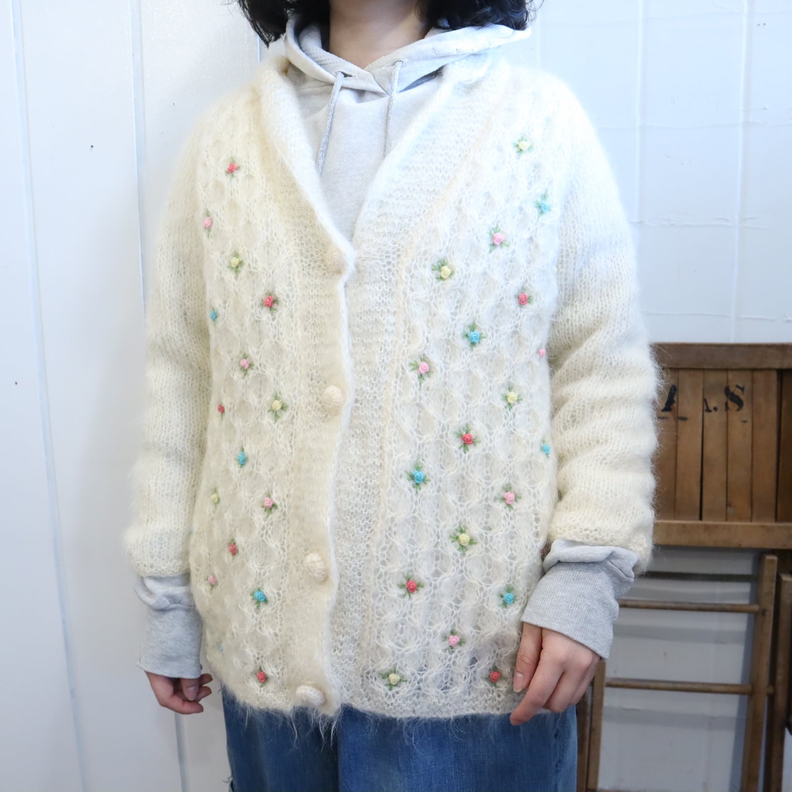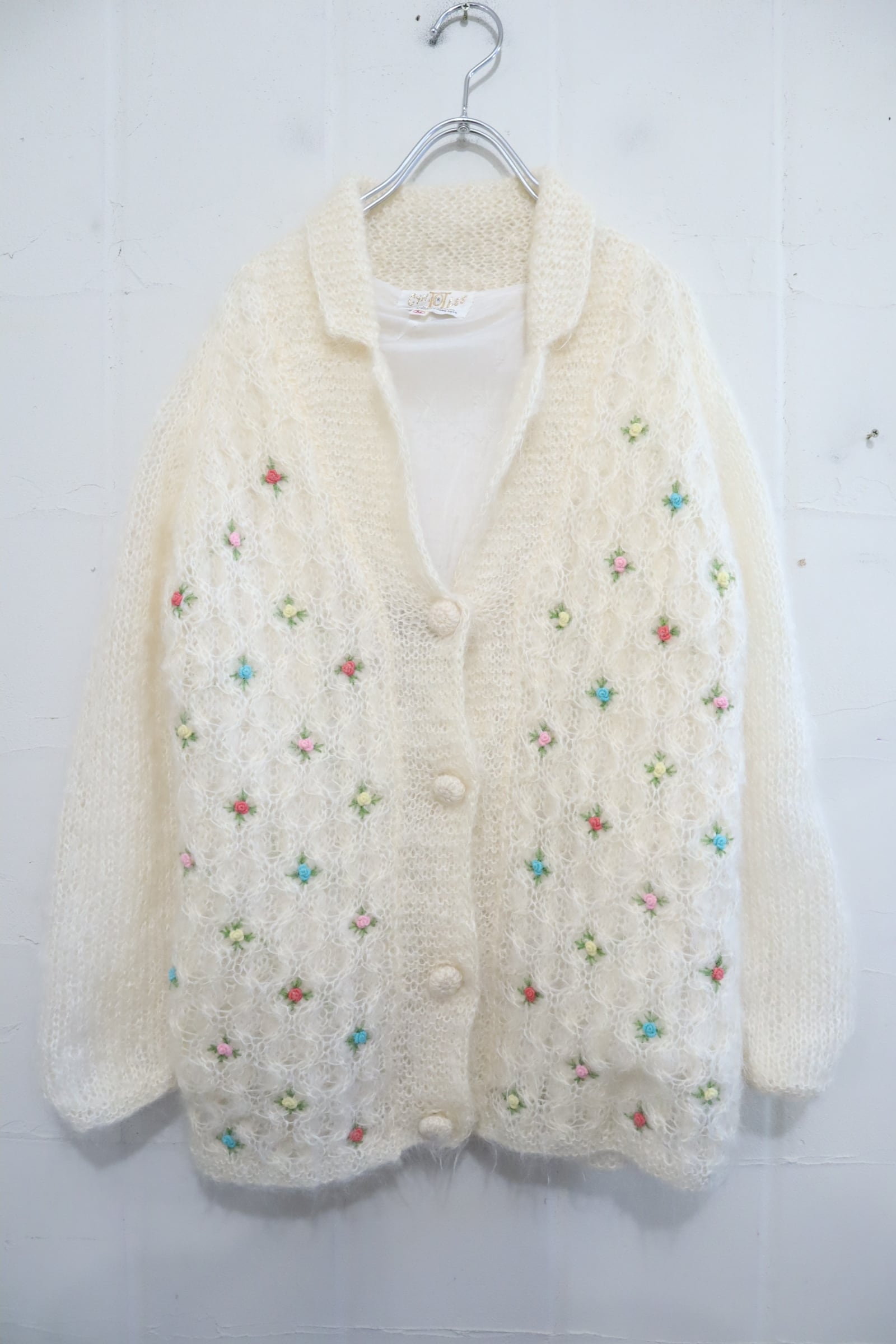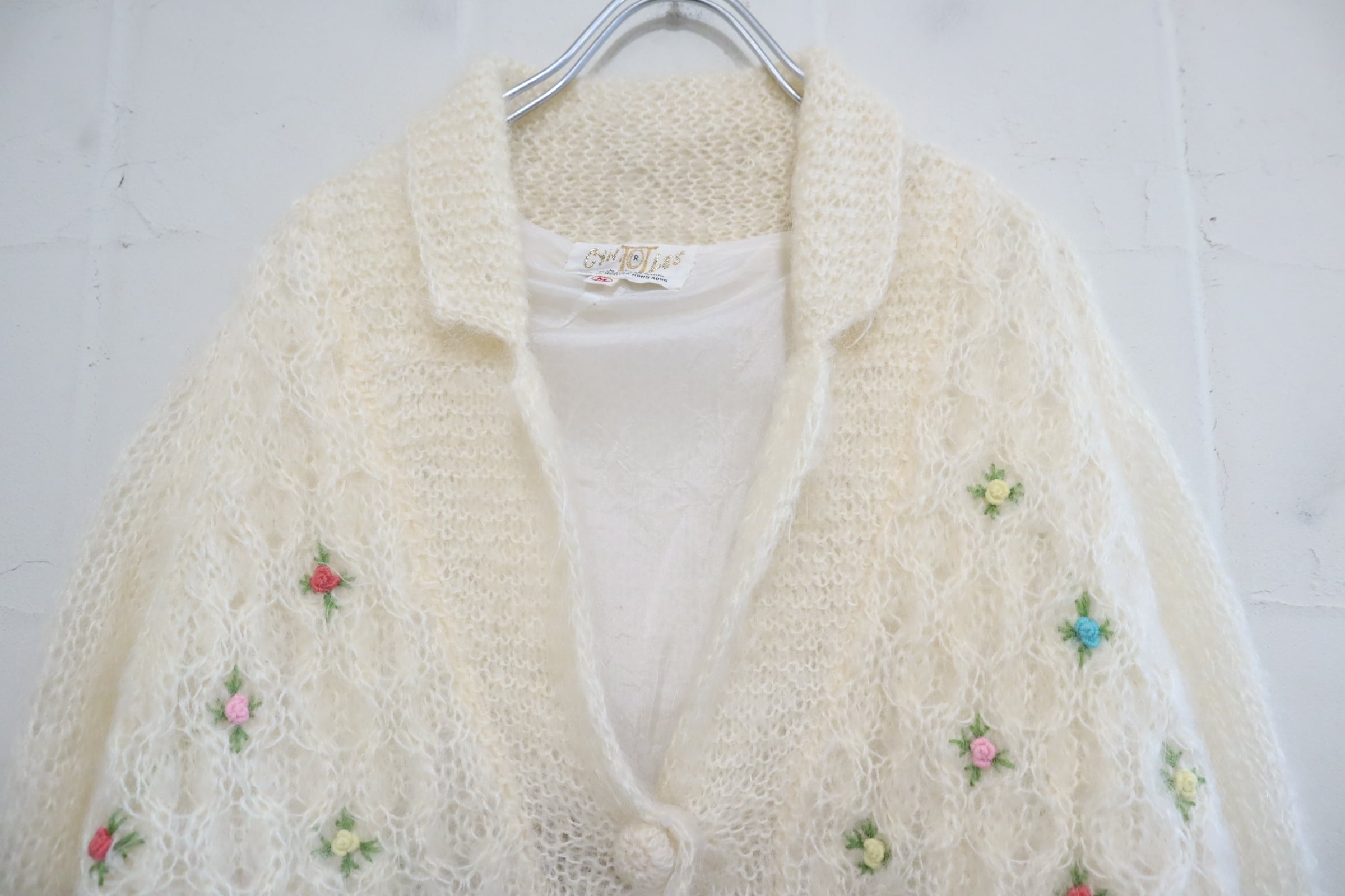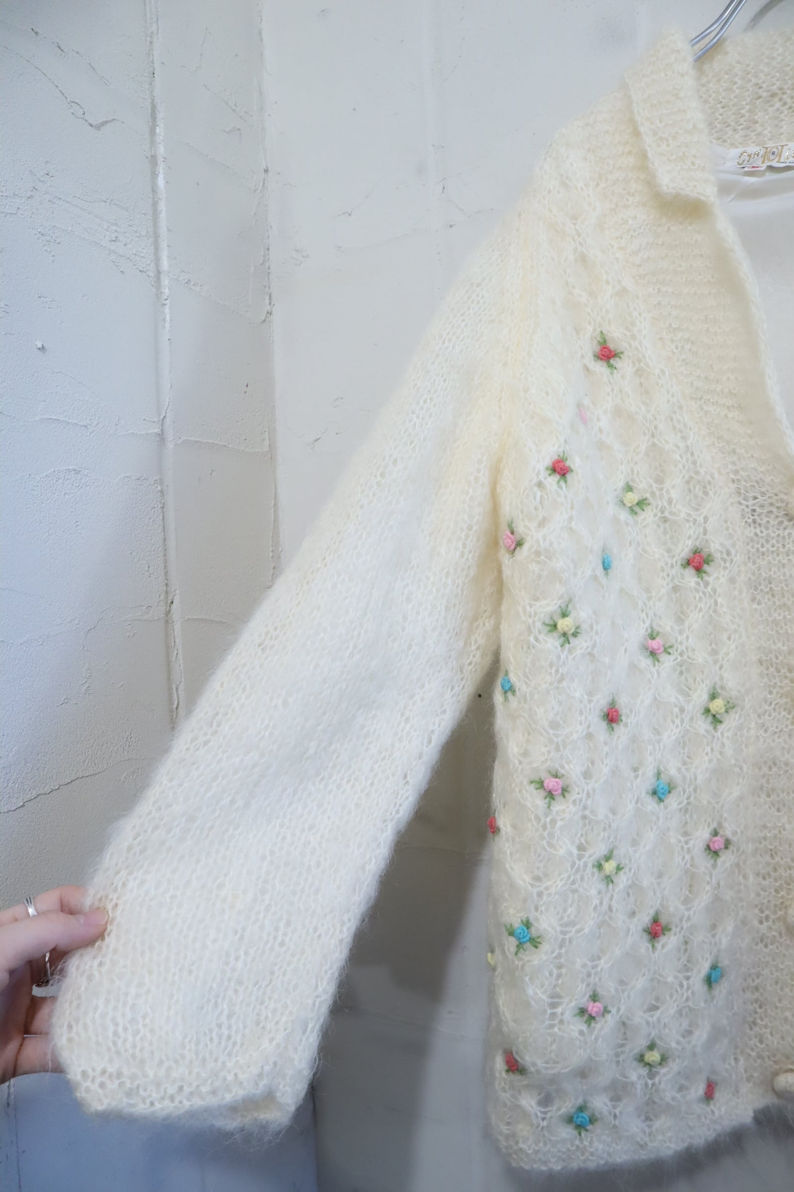 60s creamwhite×colorful flower embroidery mohair knit cardigan [l-4691]