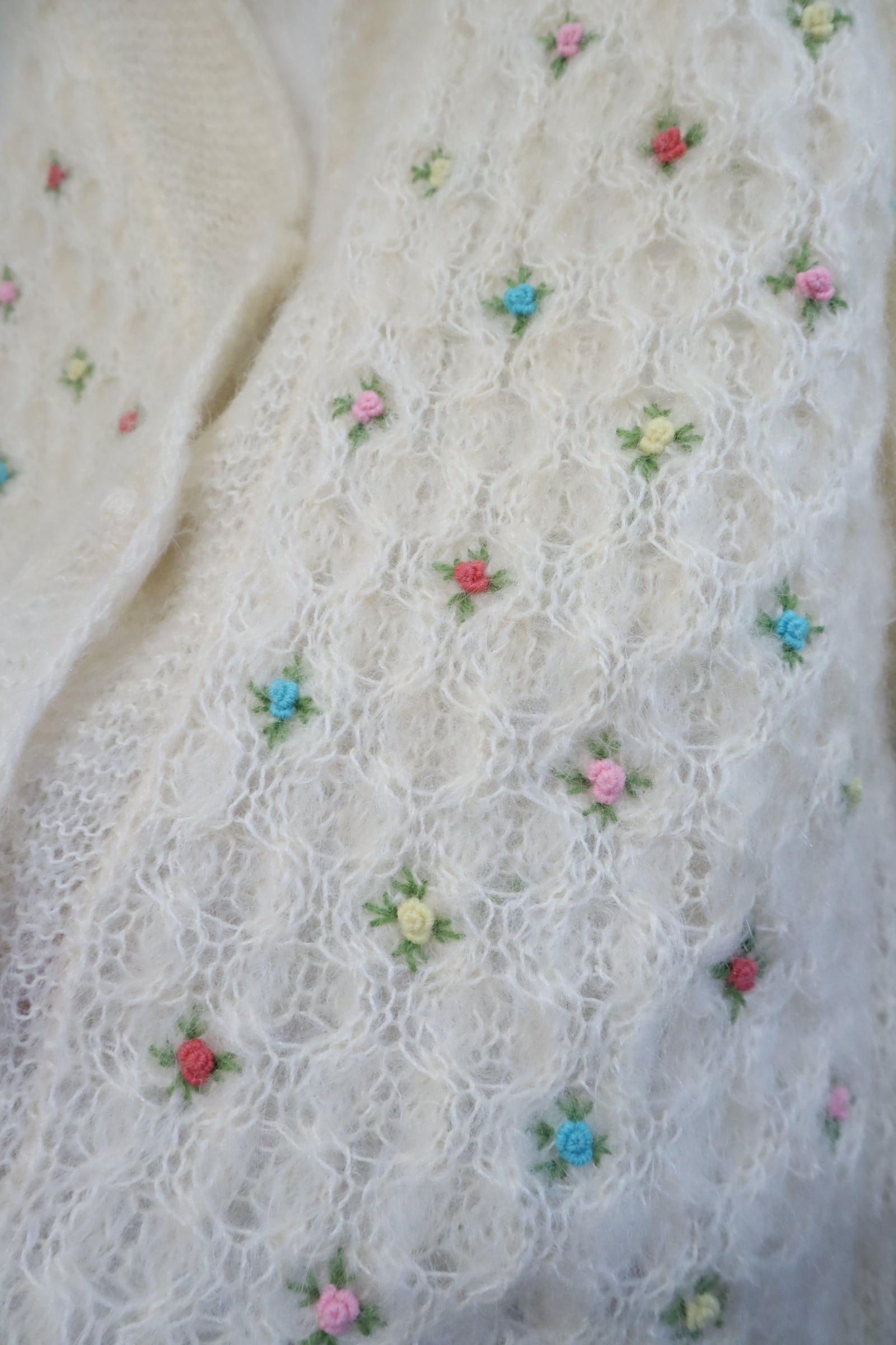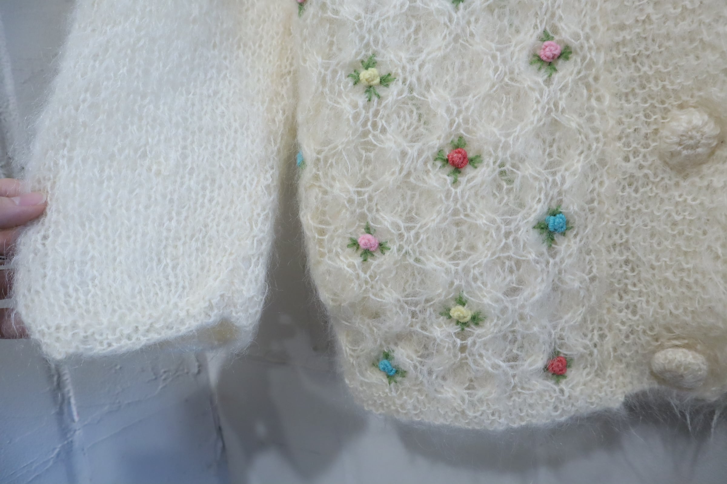 ぷっくりと立体的なバラの刺繍がとても可愛いモヘアニットカーディガン。