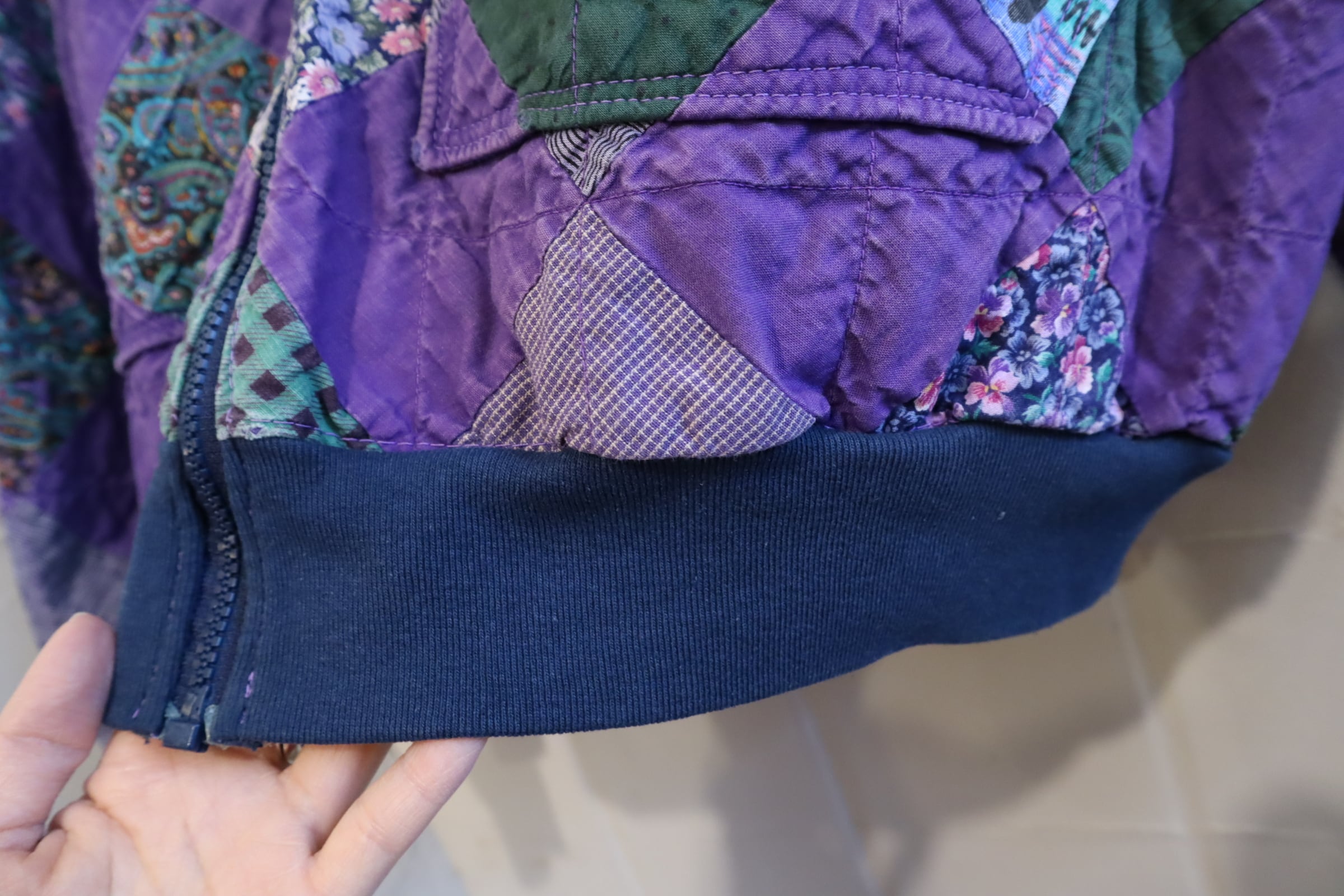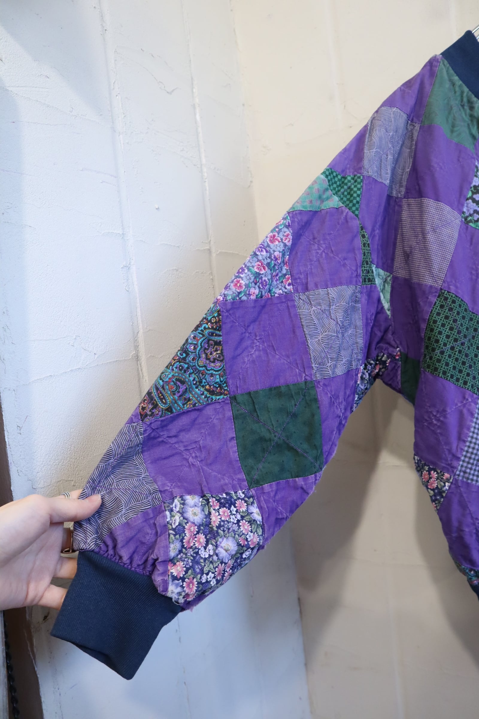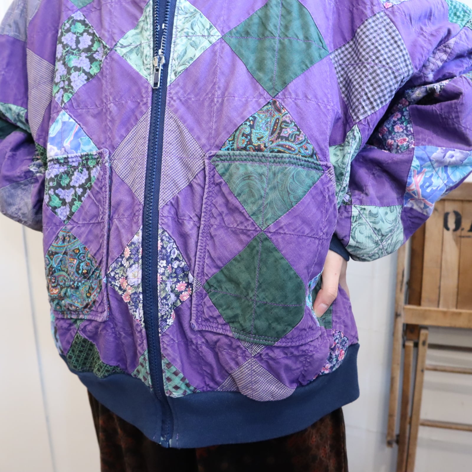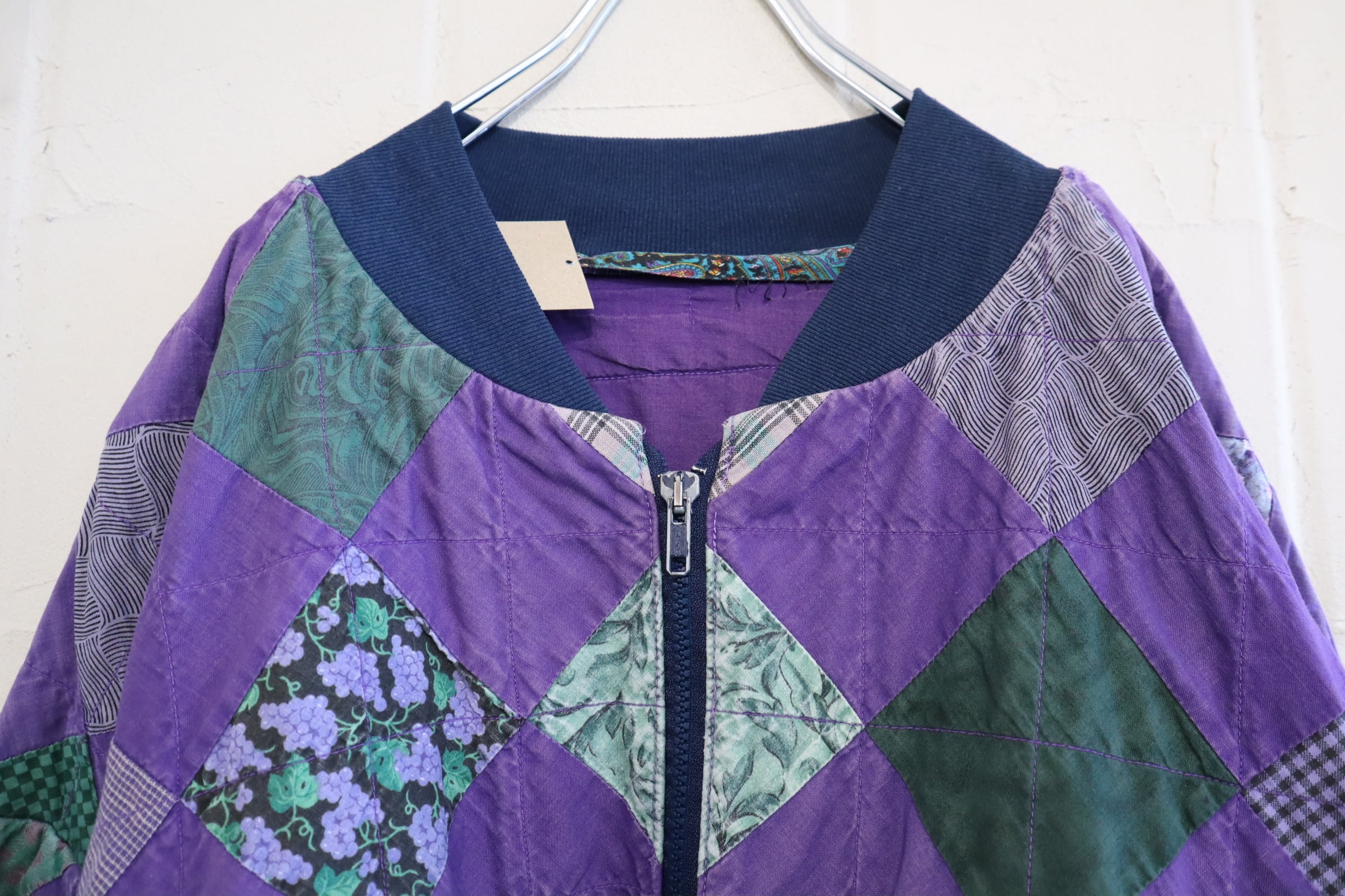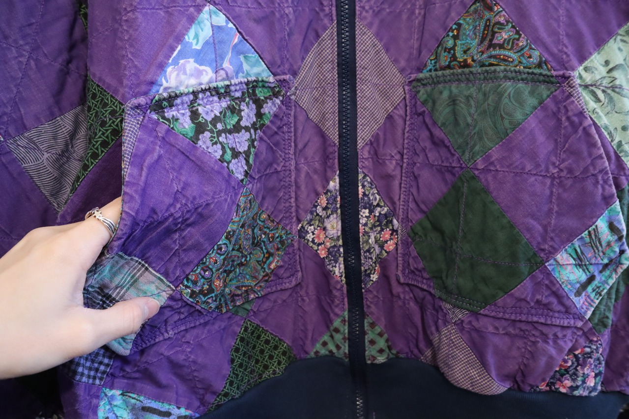無地と柄が均等に組み合わされたパッチワークジャケット。