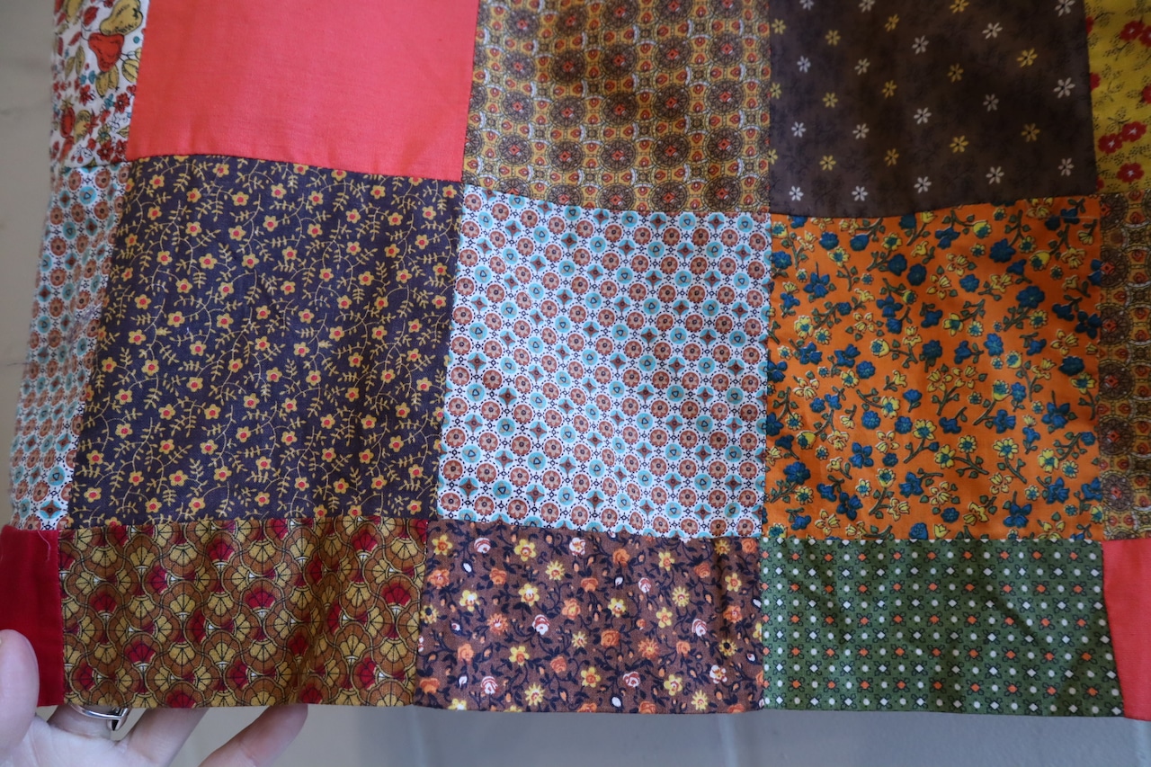 裏地や表地にいくつか汚れ、パッチワーク縫い目に一部ホツレがございますが、古着の味として着て頂けるかと思います。
