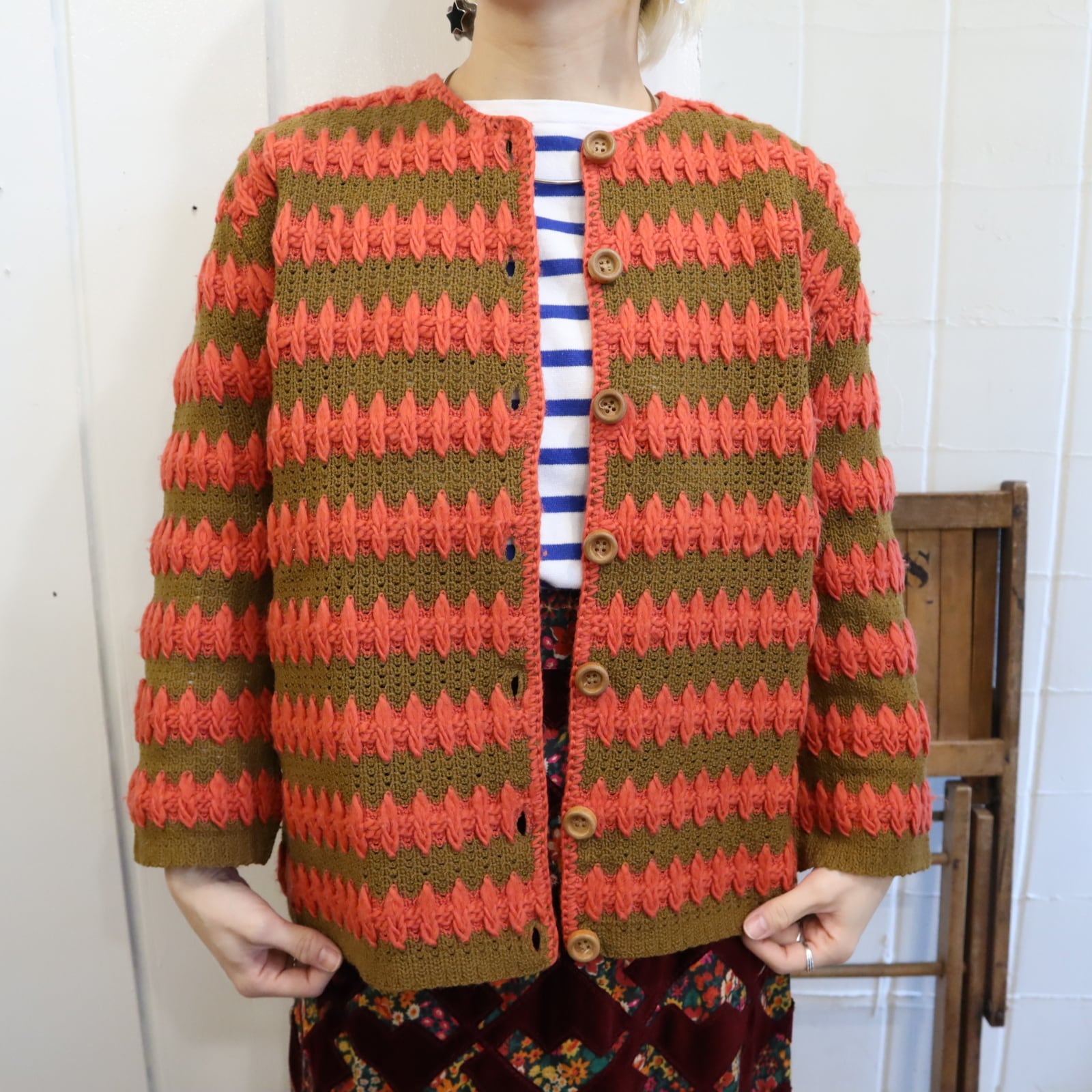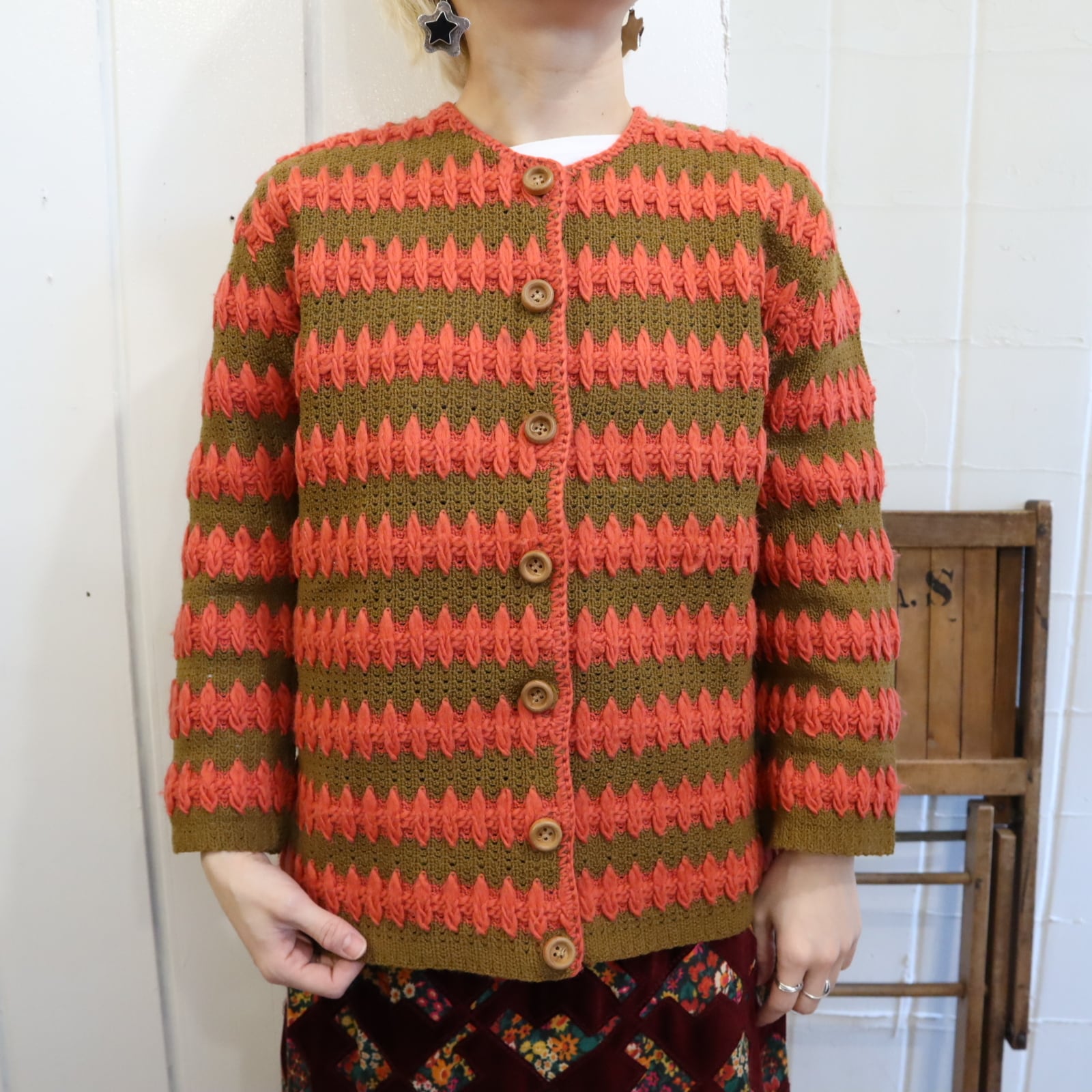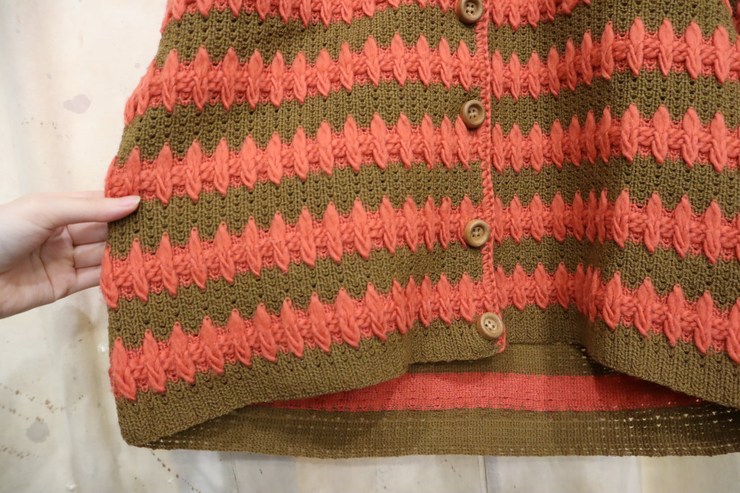 60s- salmonpink×brown border knit cardigan [l-4719]