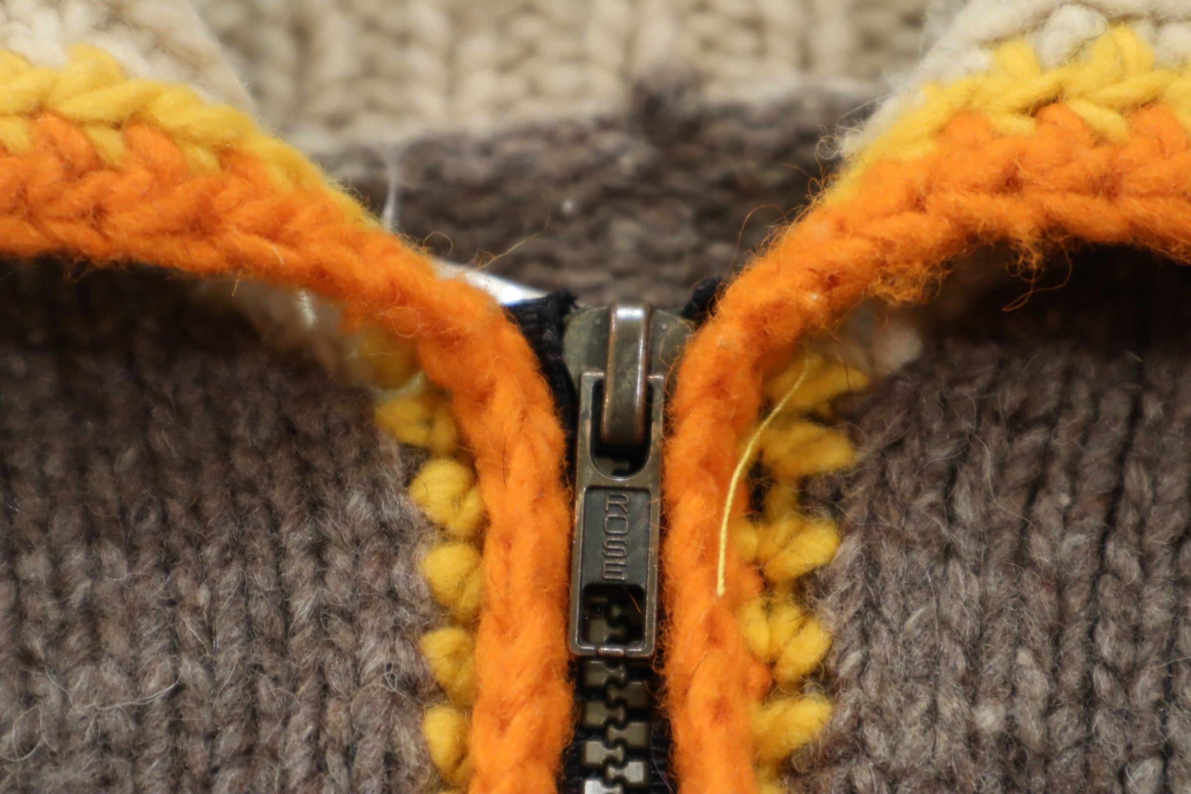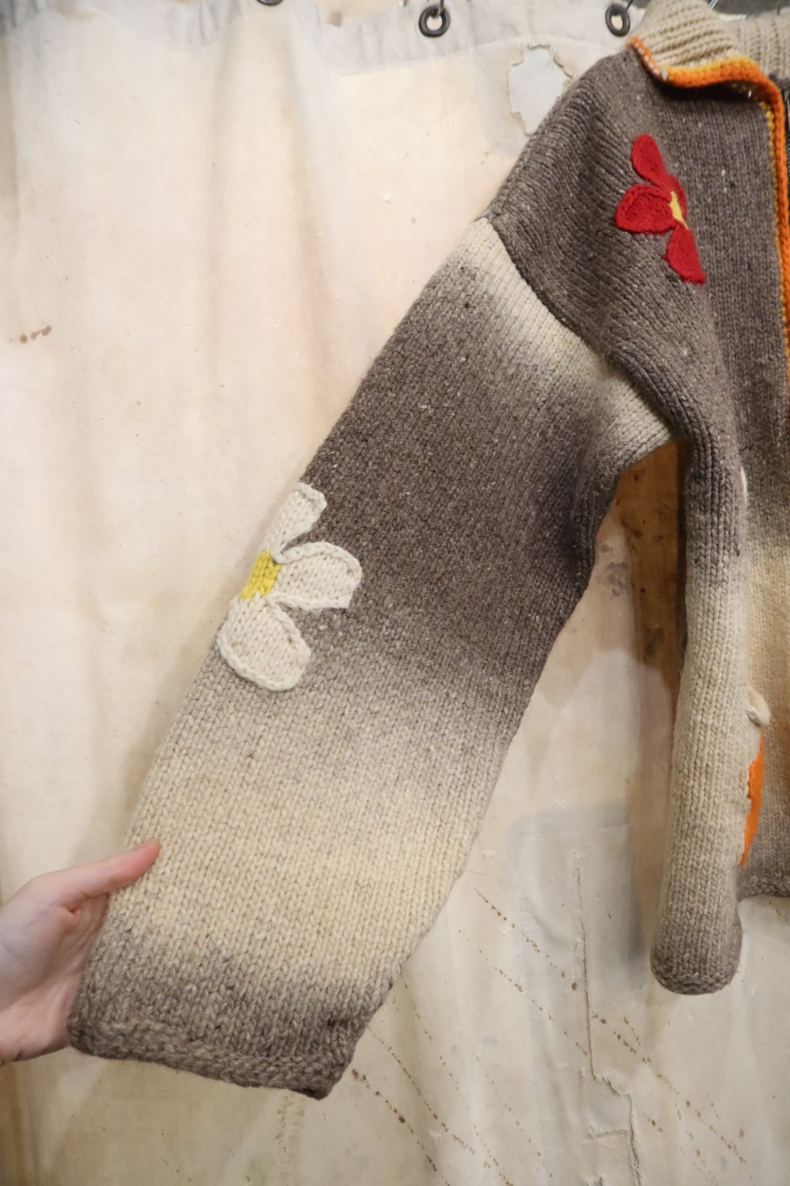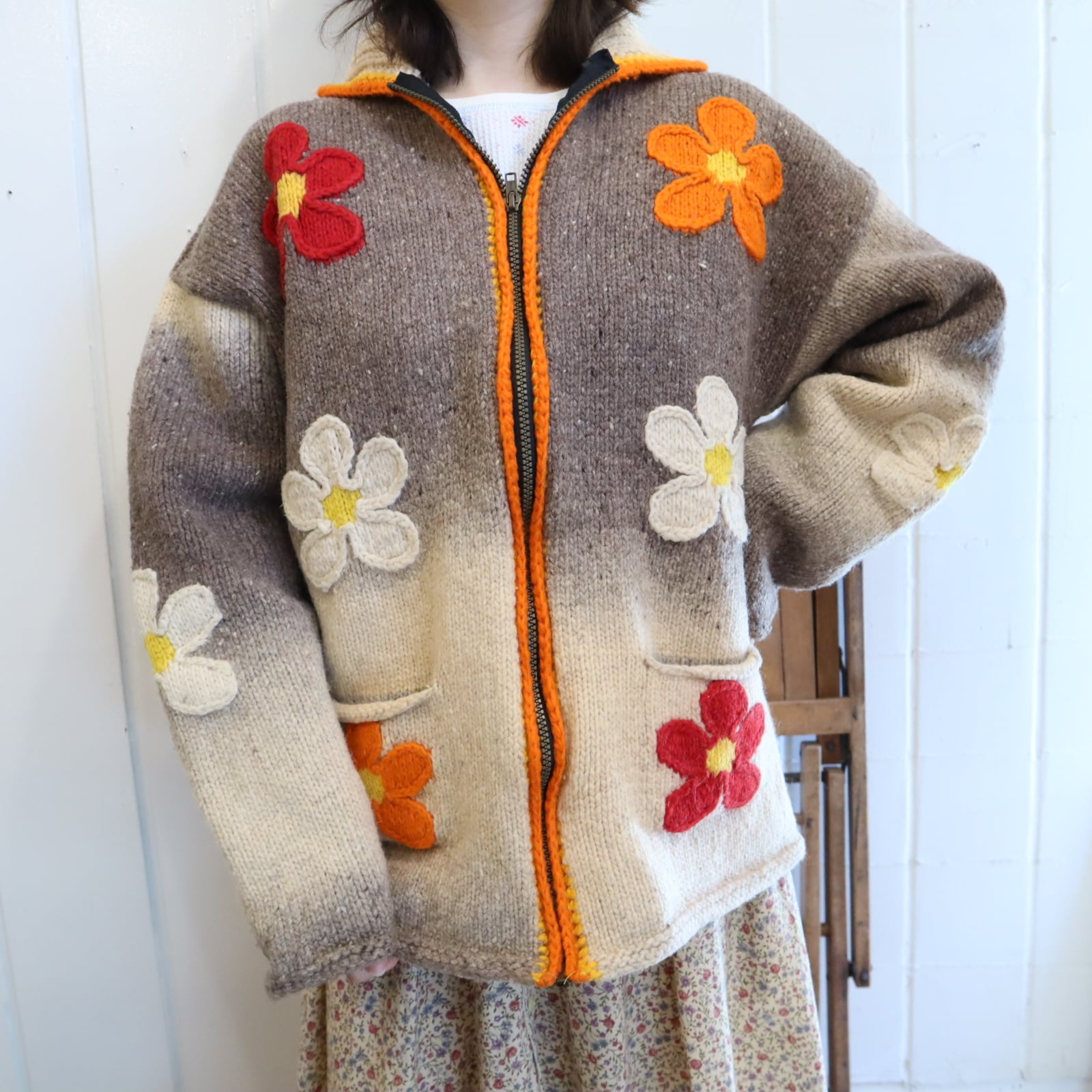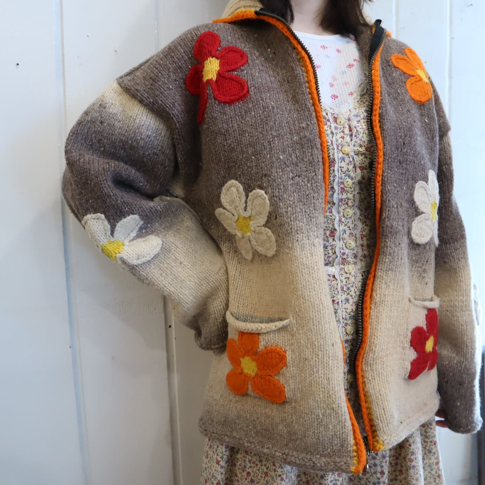 gray×orange×red flower fullzip Ecuador knit jacket [l-4720]