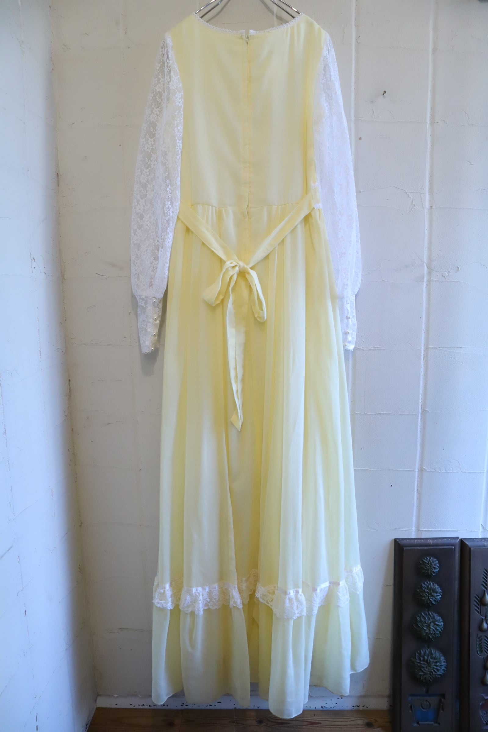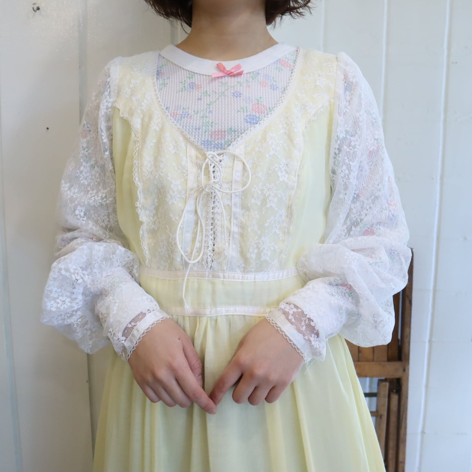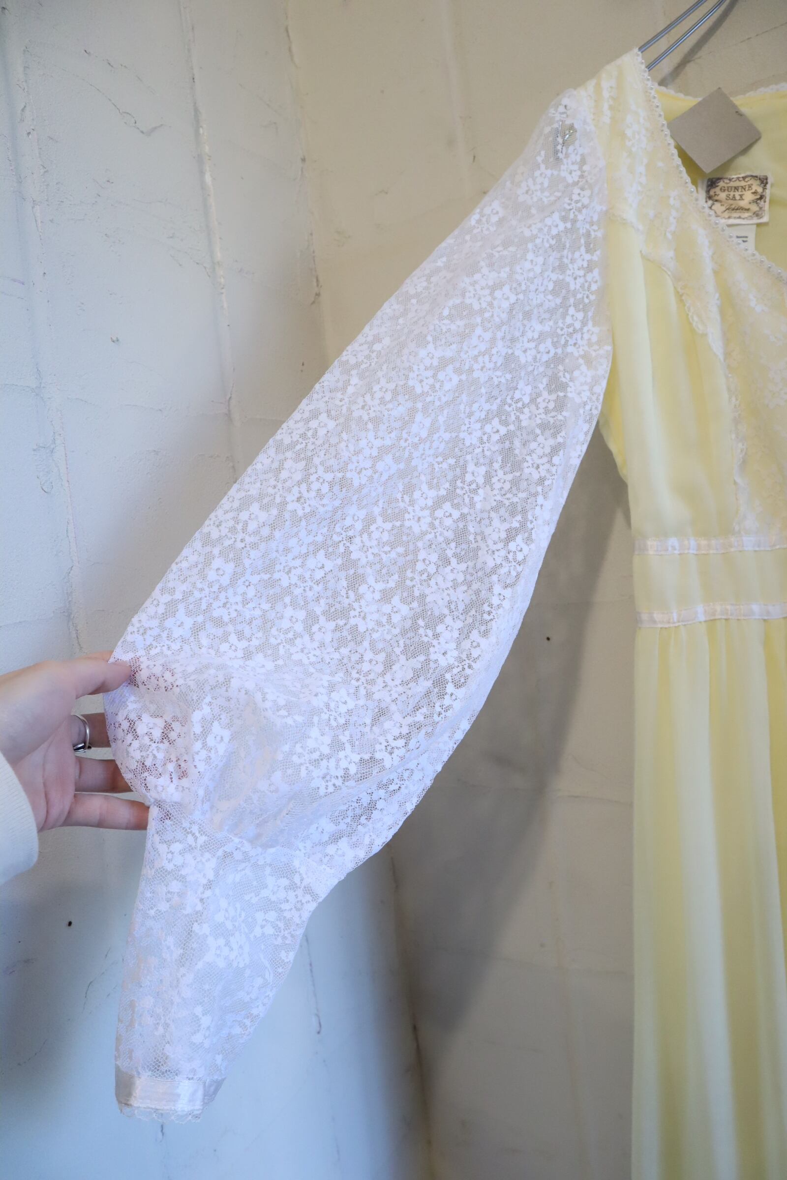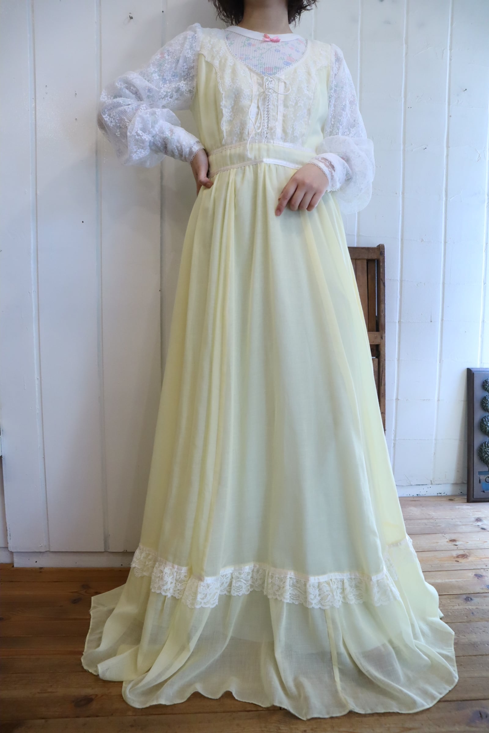 70s GUNNE SAX lightyellow lace sleeve dress [l-4725]