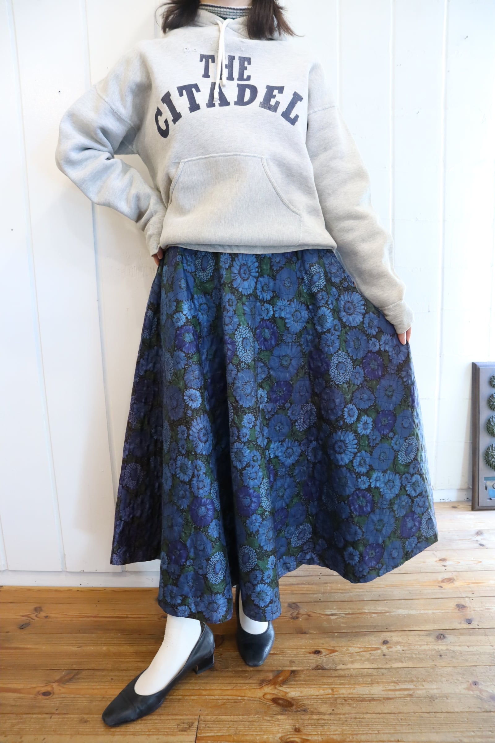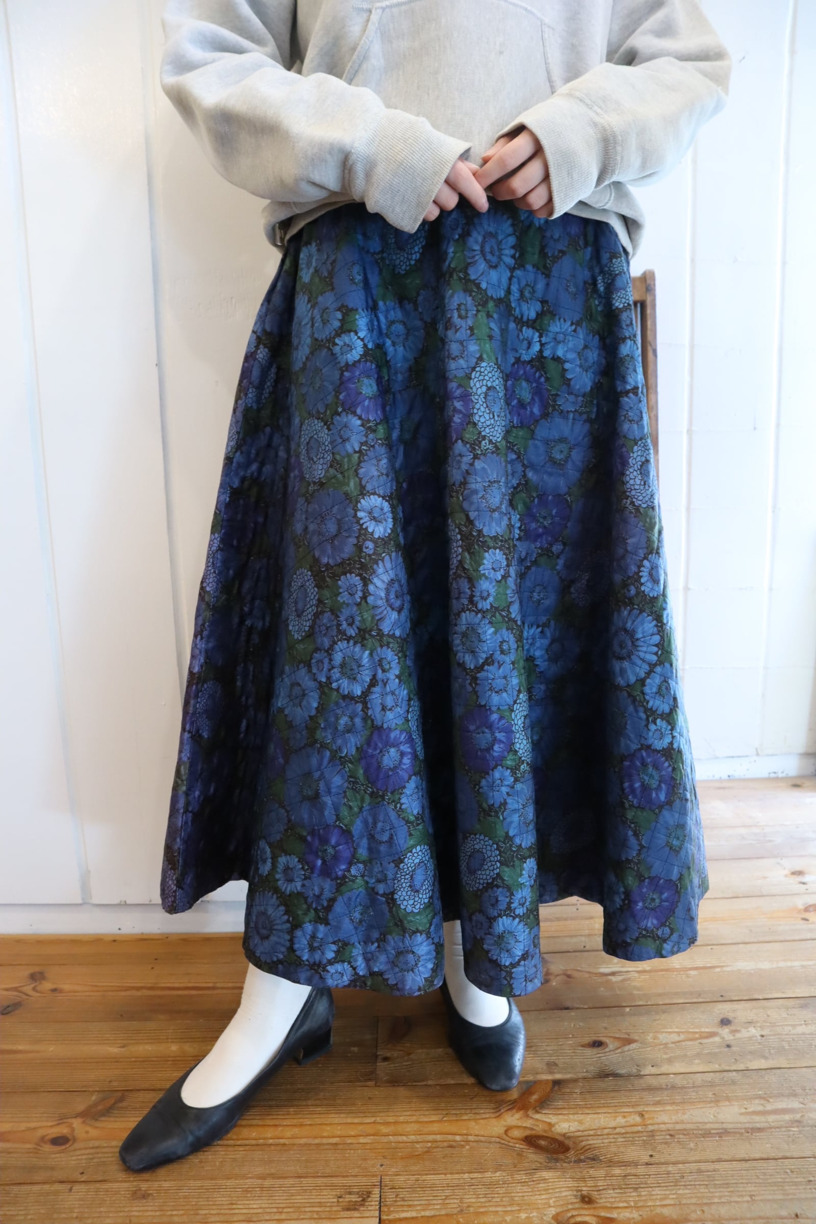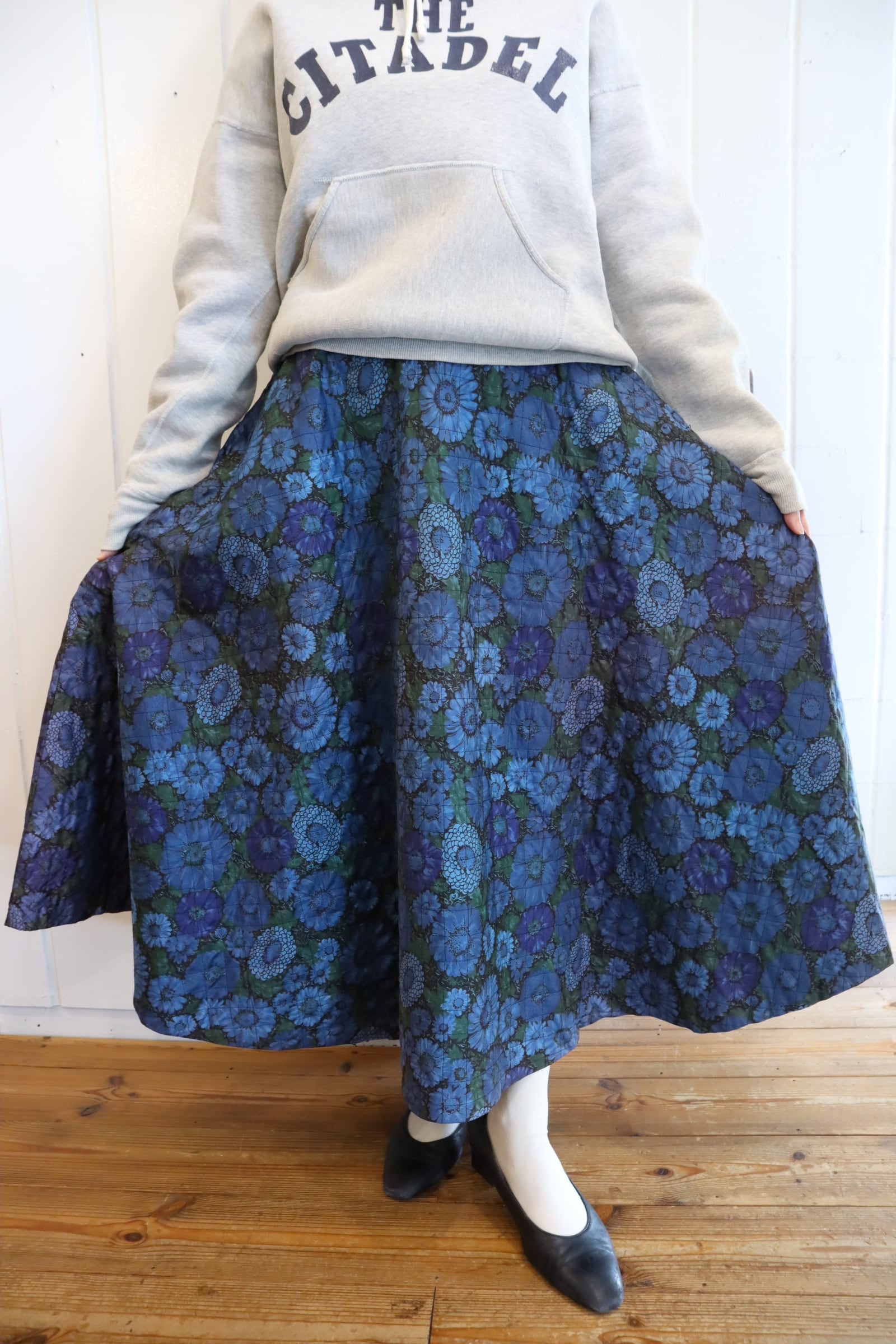 50s-60s blue×black flower pattern quilting circular skirt [l-4730]
