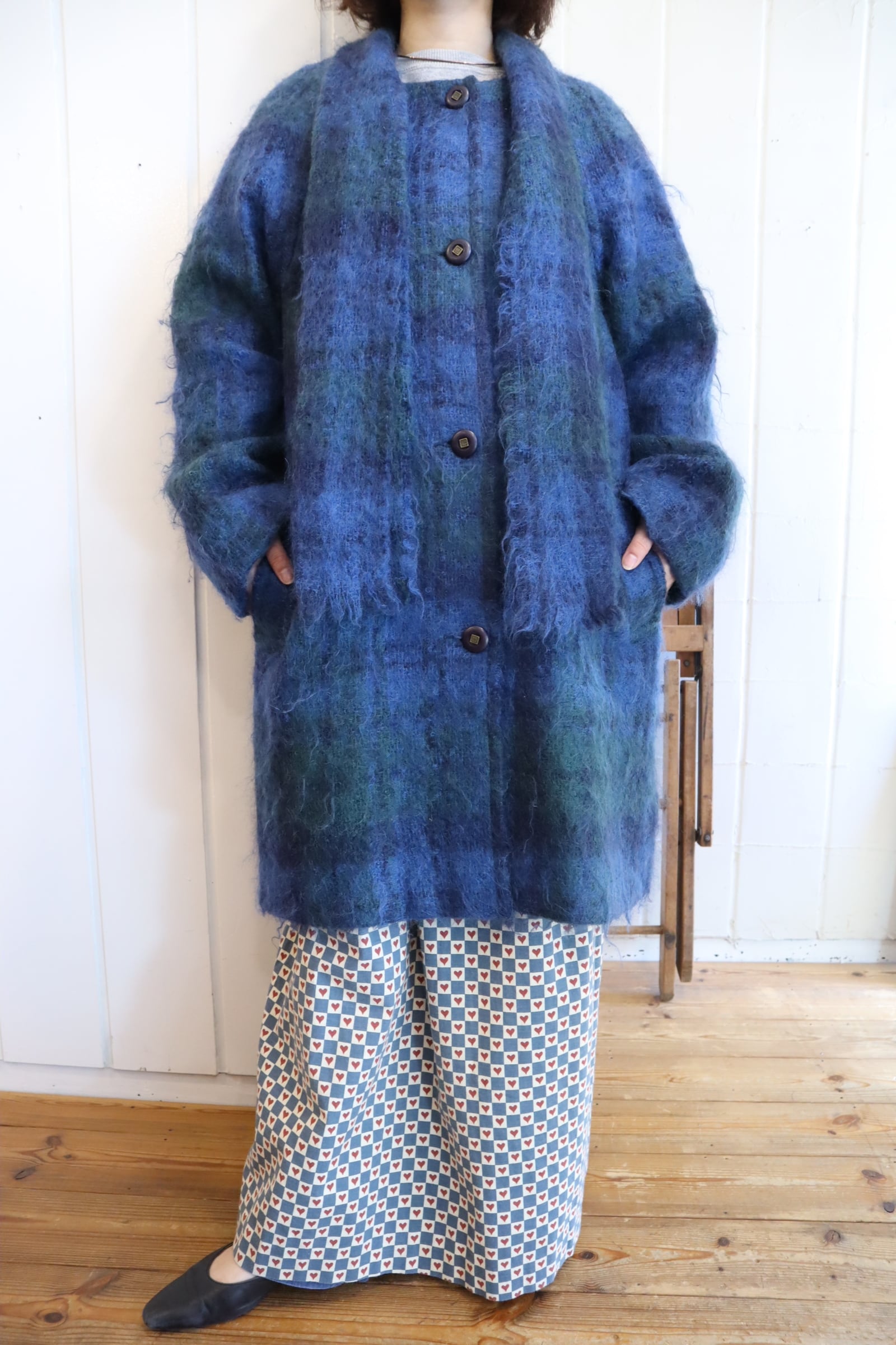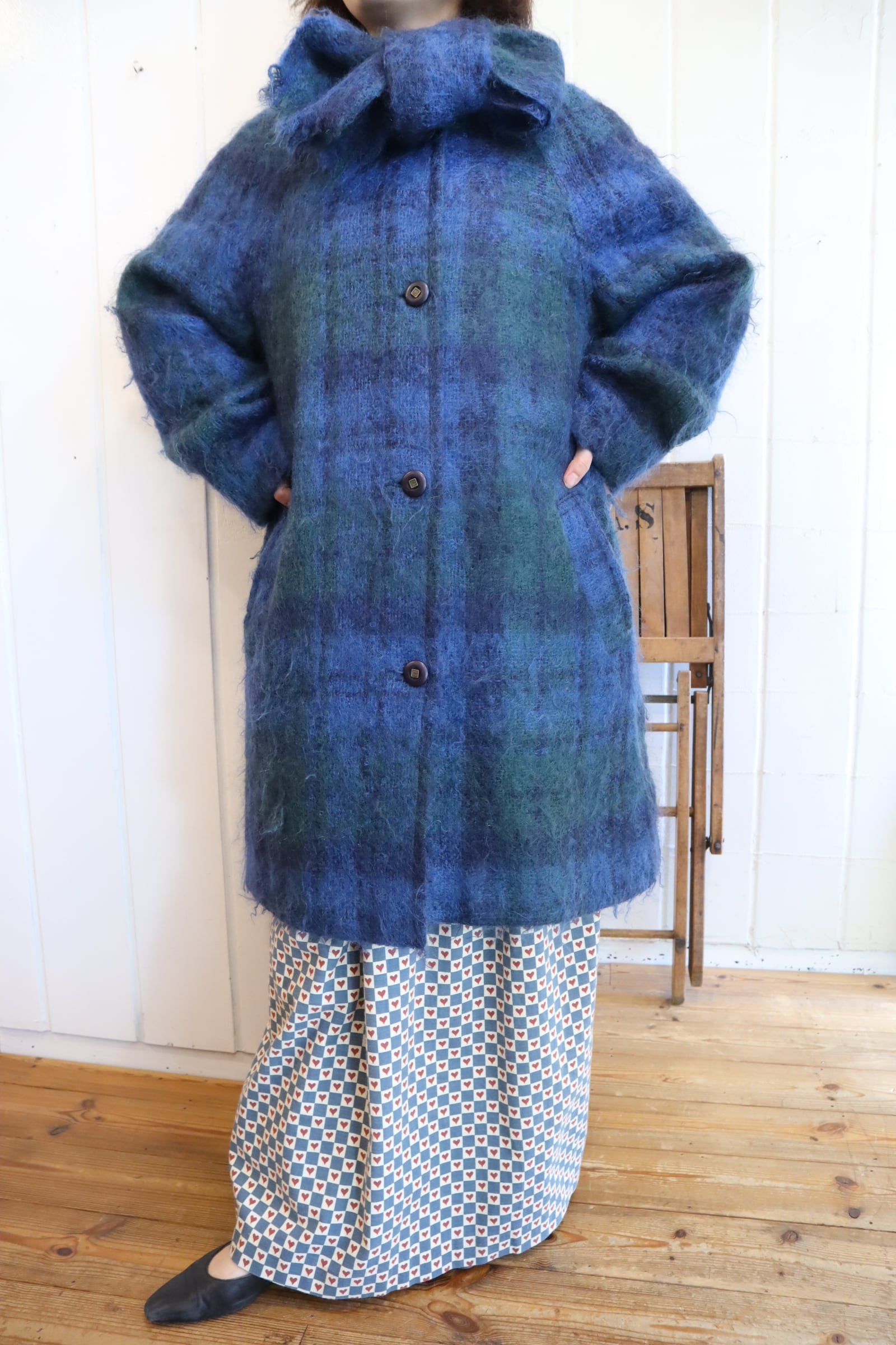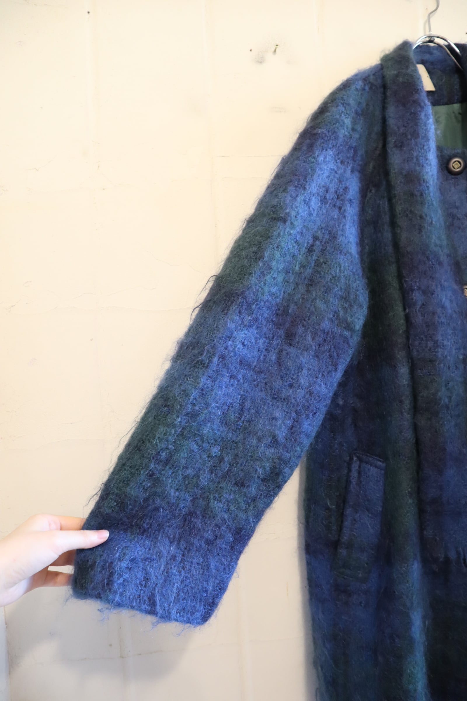 blue×green muffler collar mohair wool coat [l-4771]