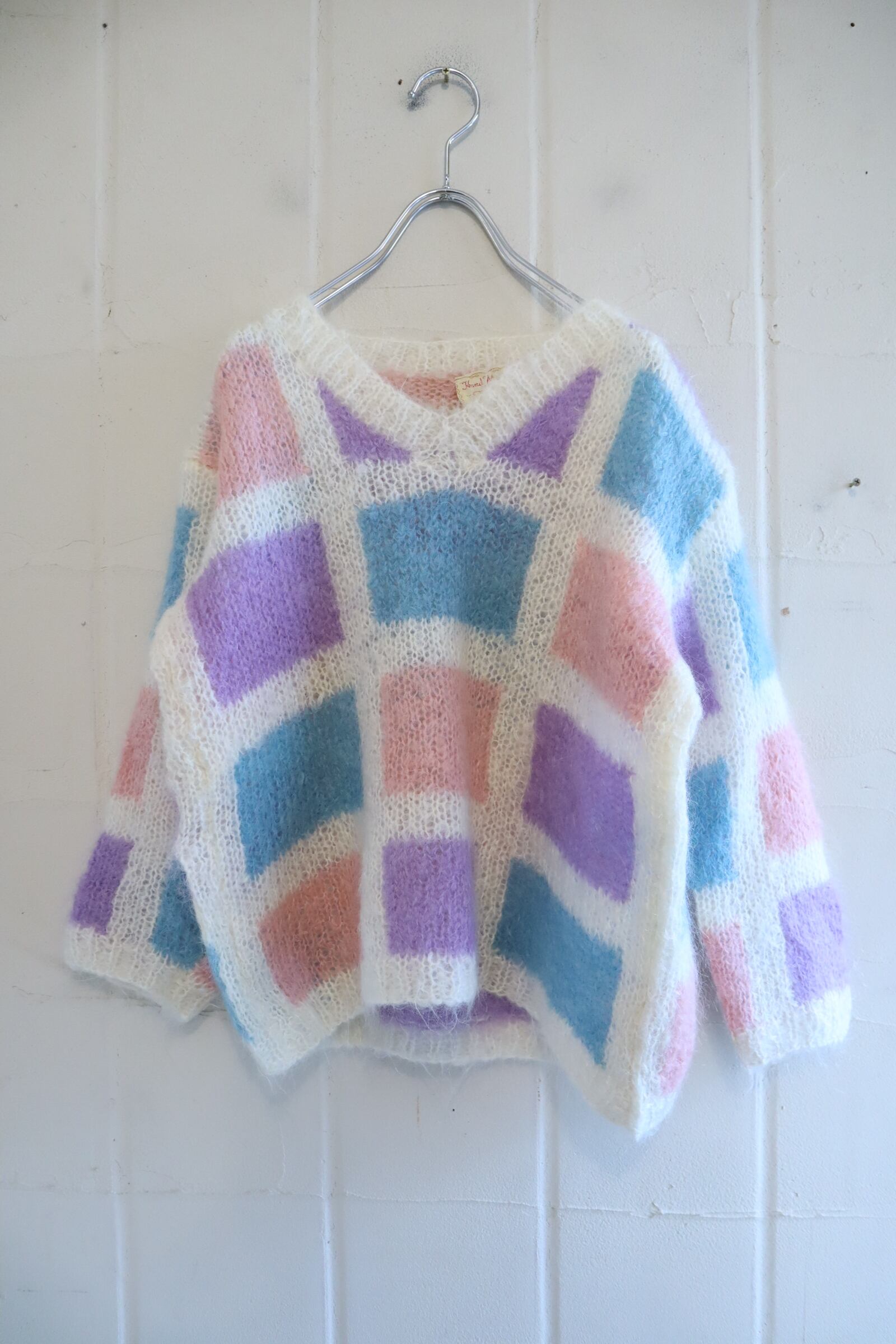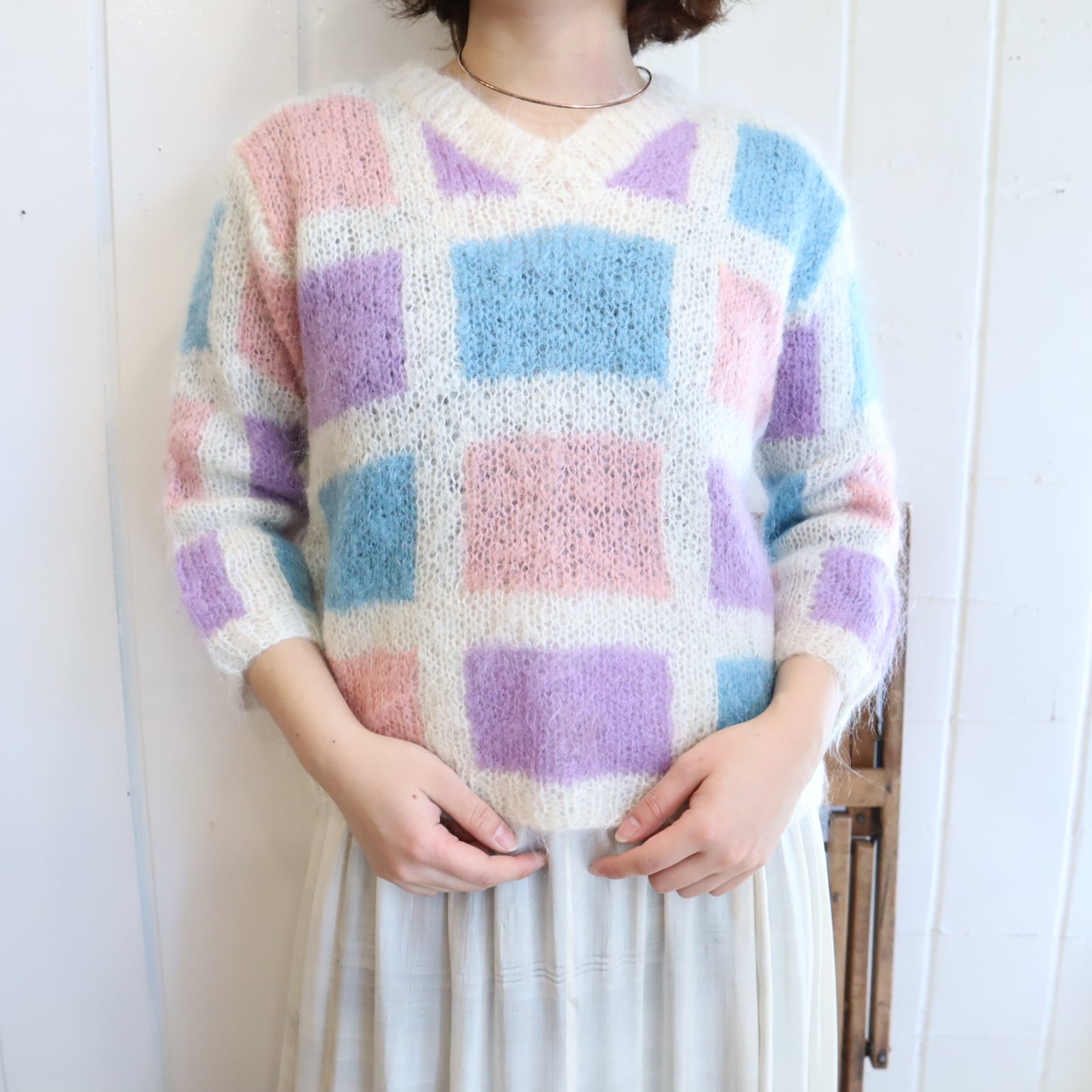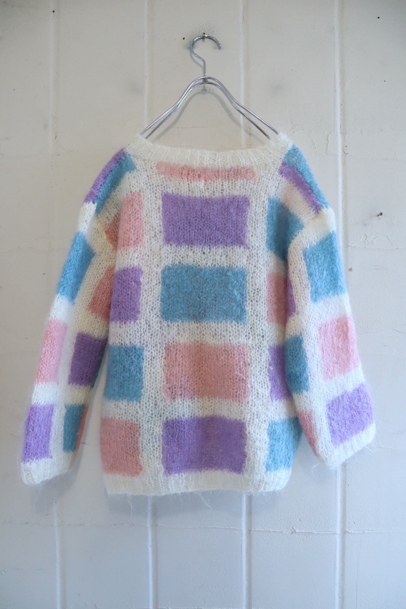 ‐70s white×colorful square motif mohair knit pullover [l-4778]