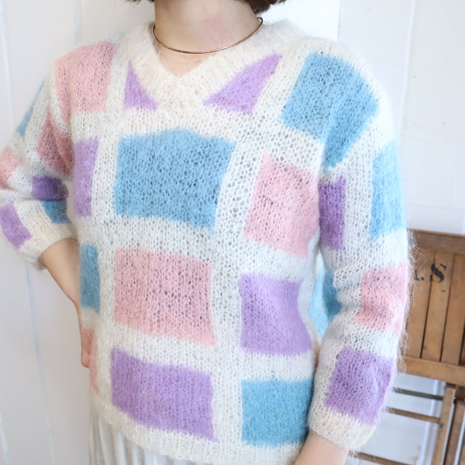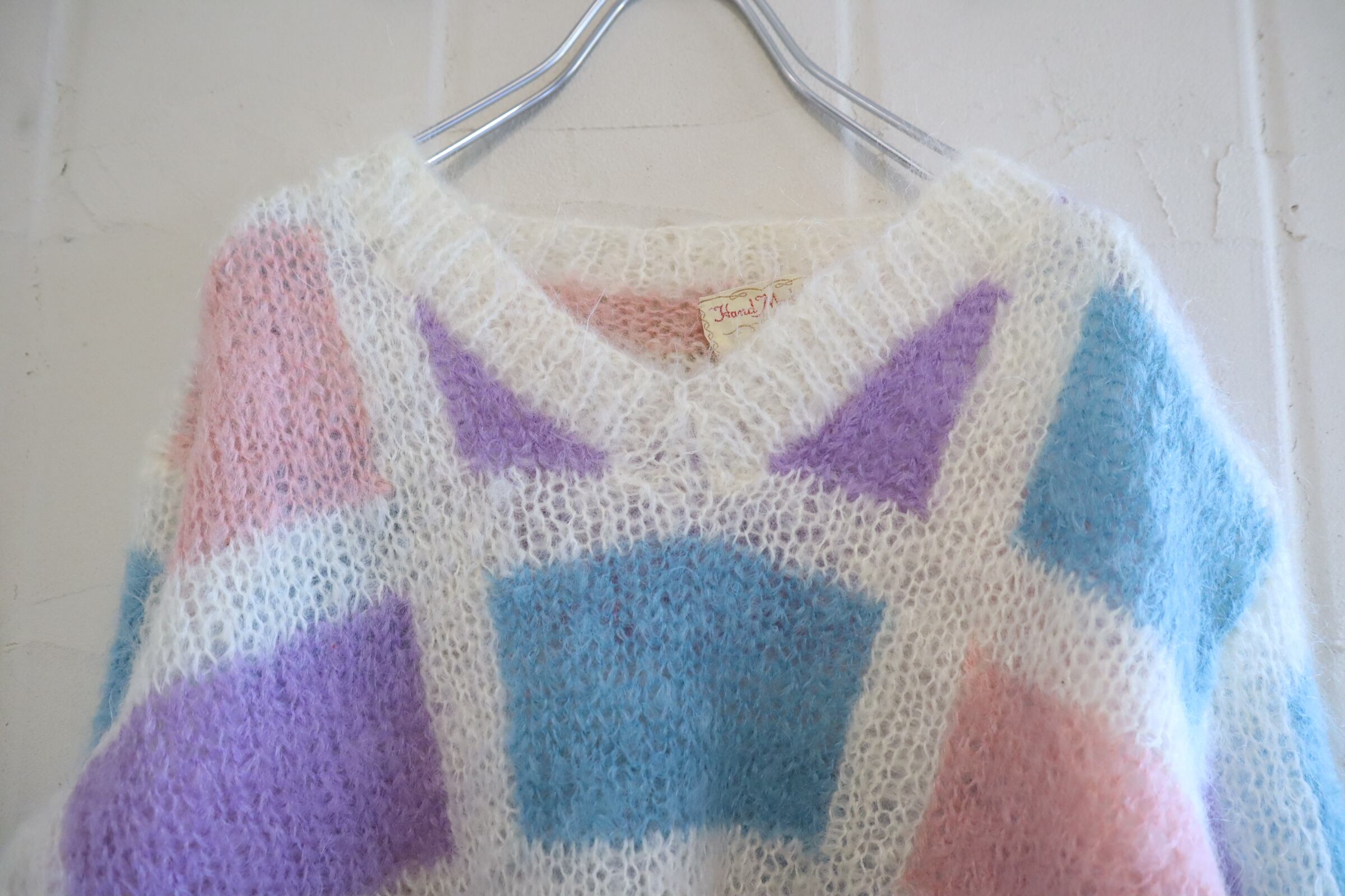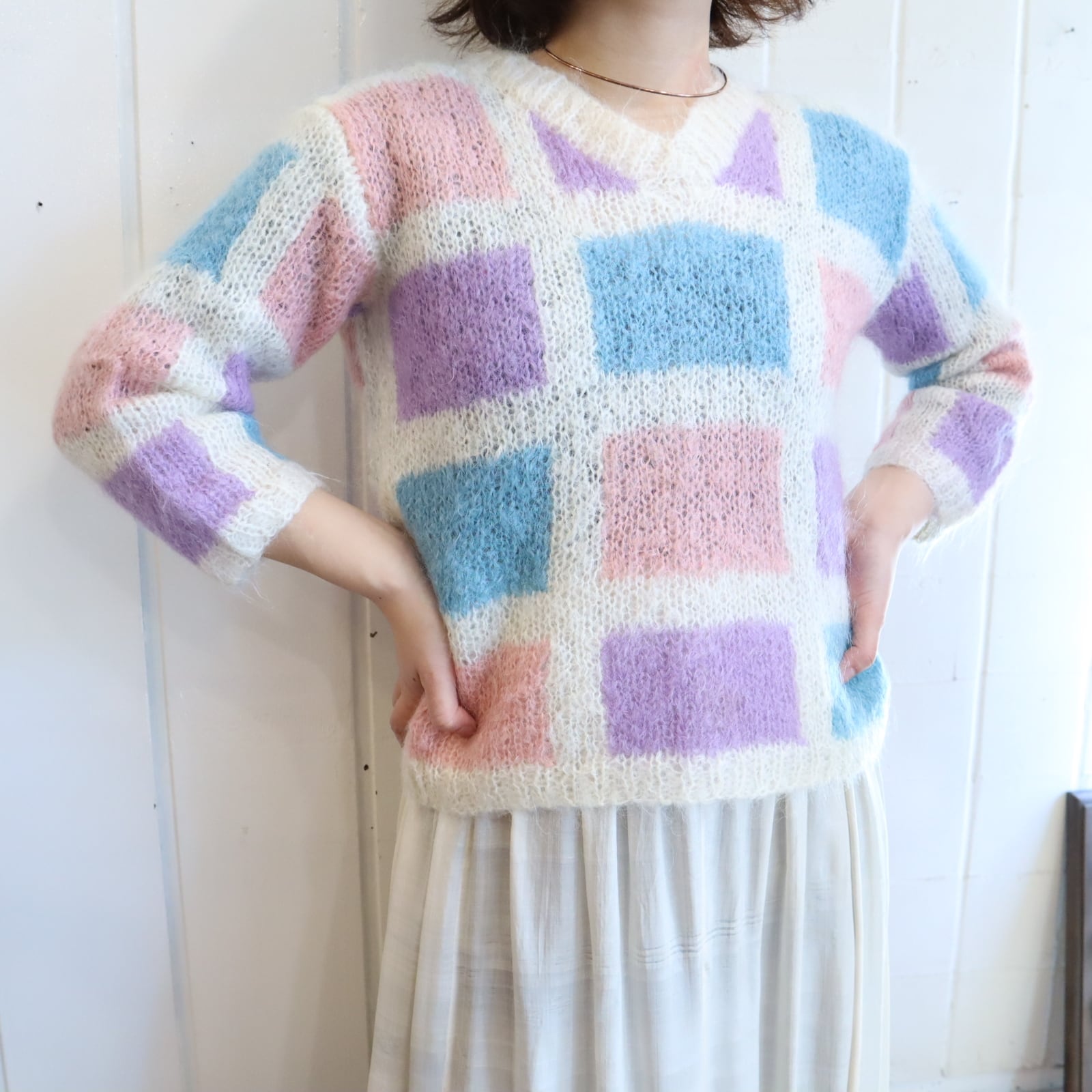 ‐70s white×colorful square motif mohair knit pullover [l-4778]