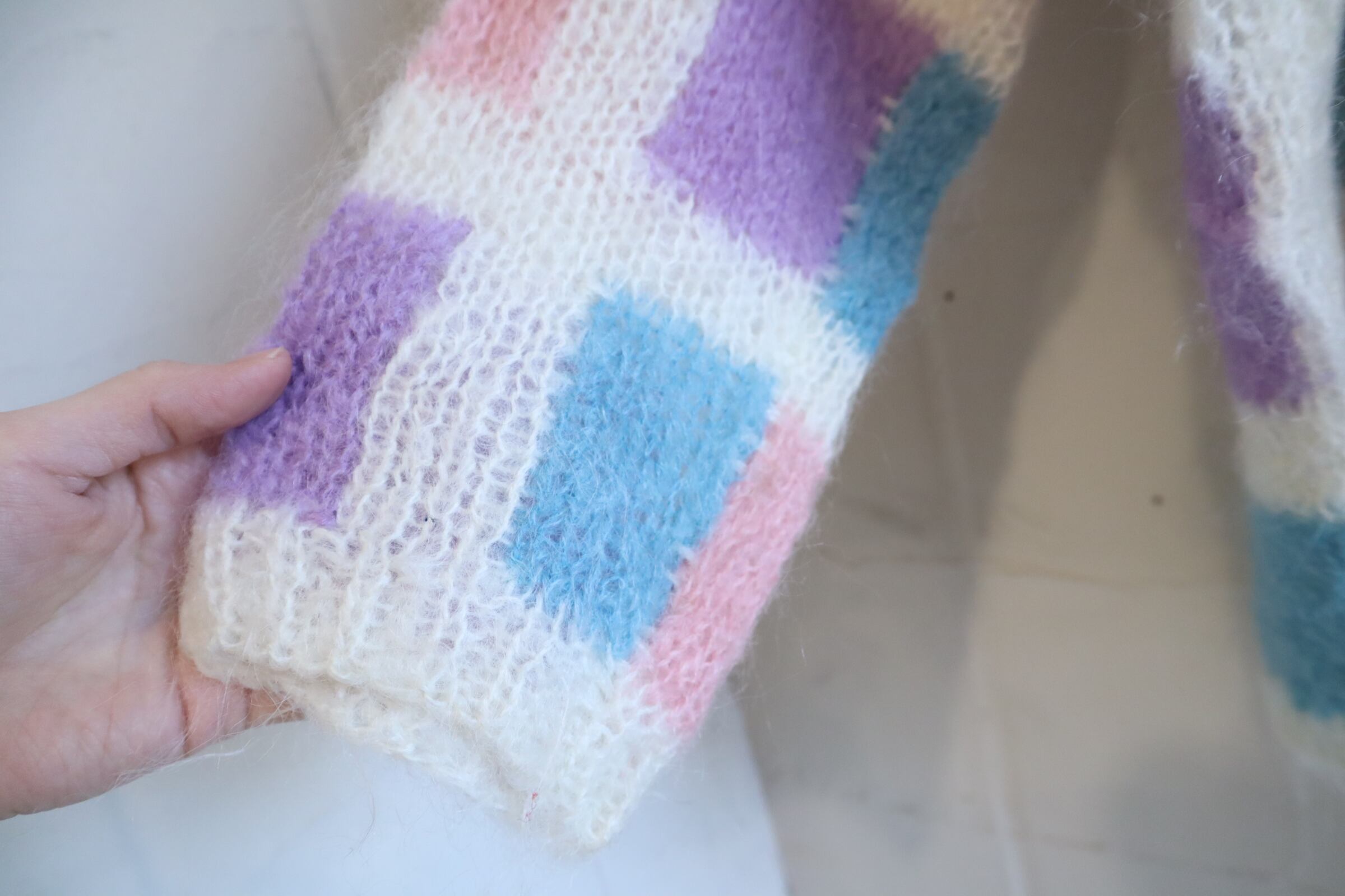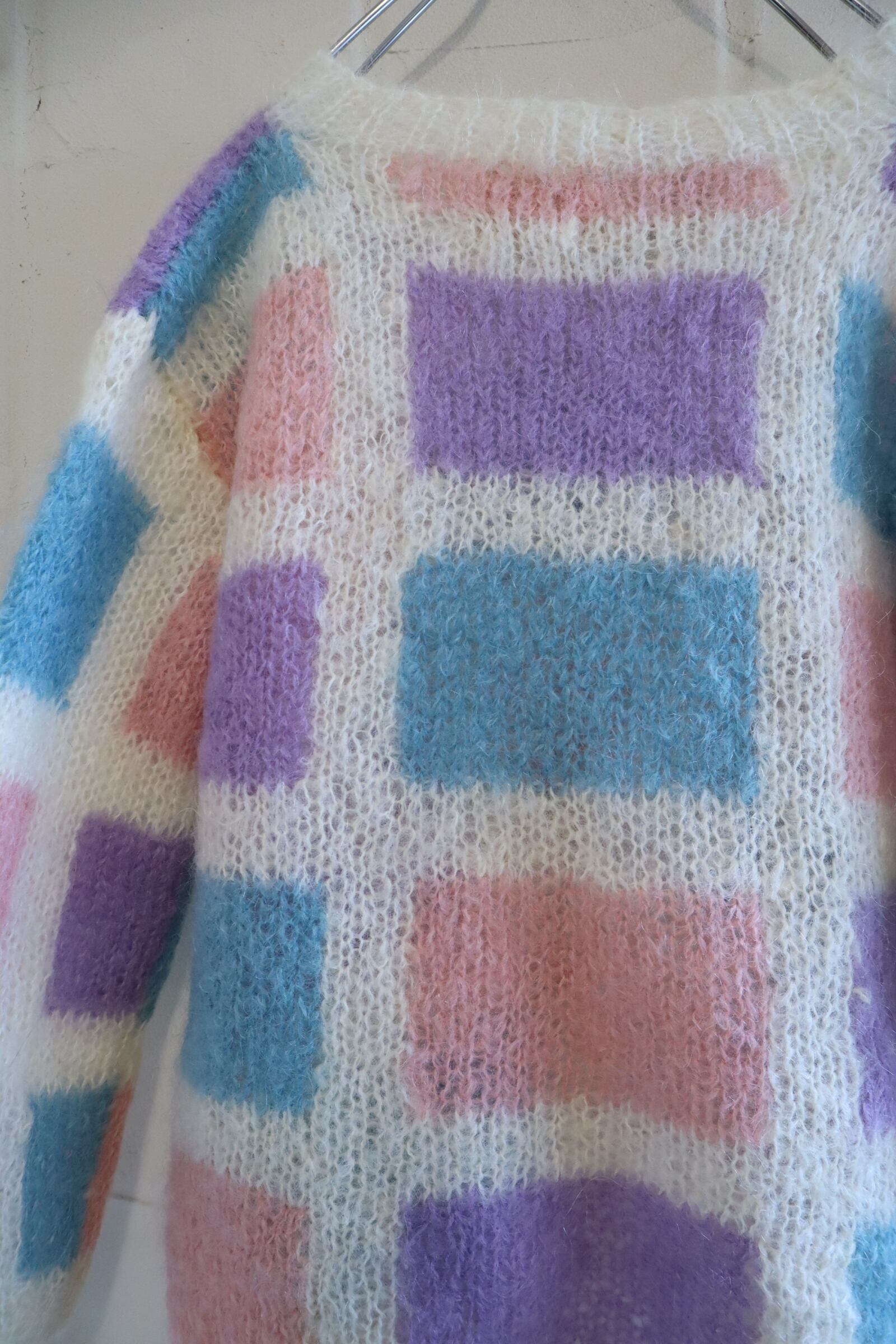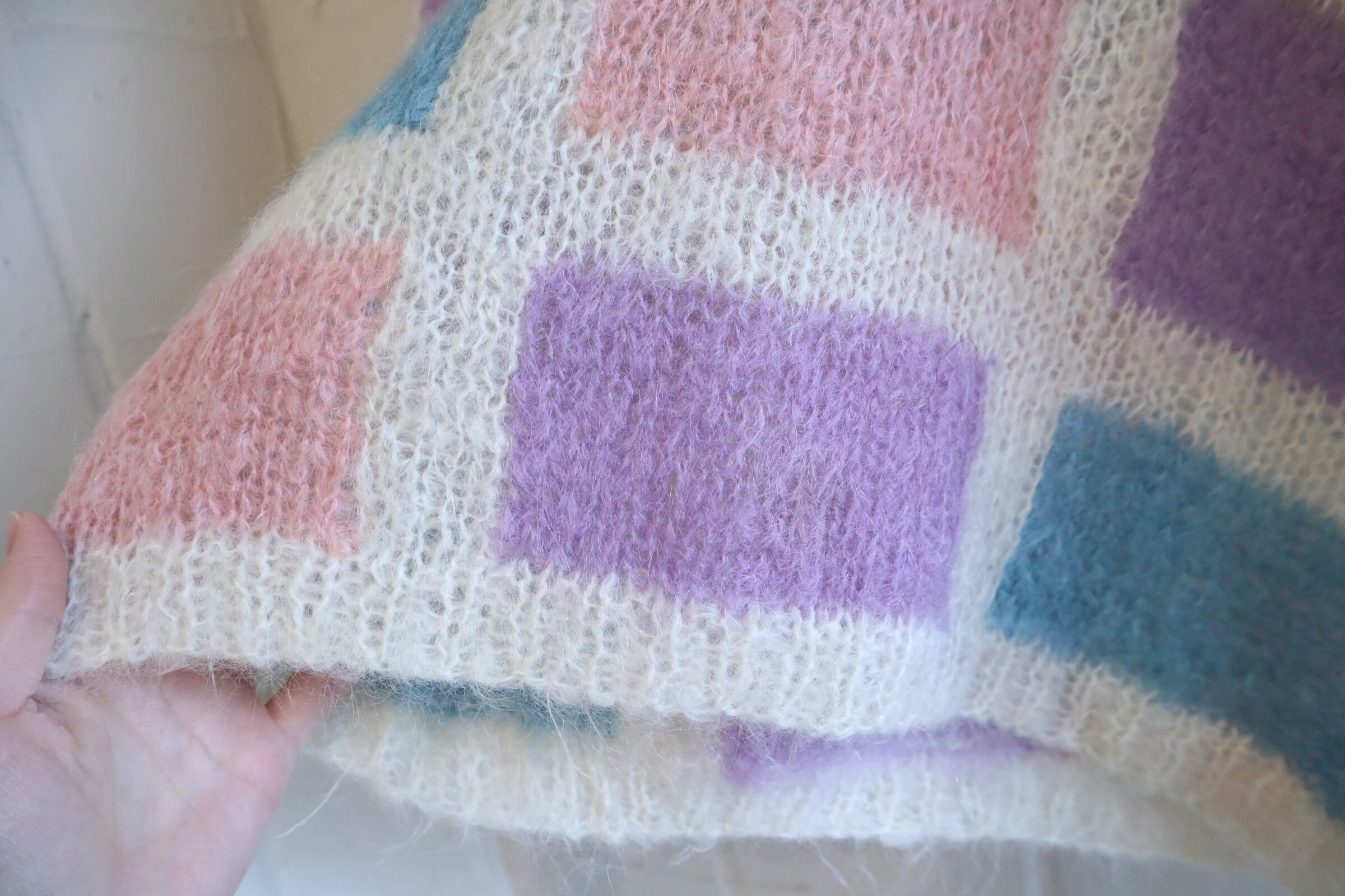 ピンクパープルブルーのブロックチェックが可愛いモヘアニット。