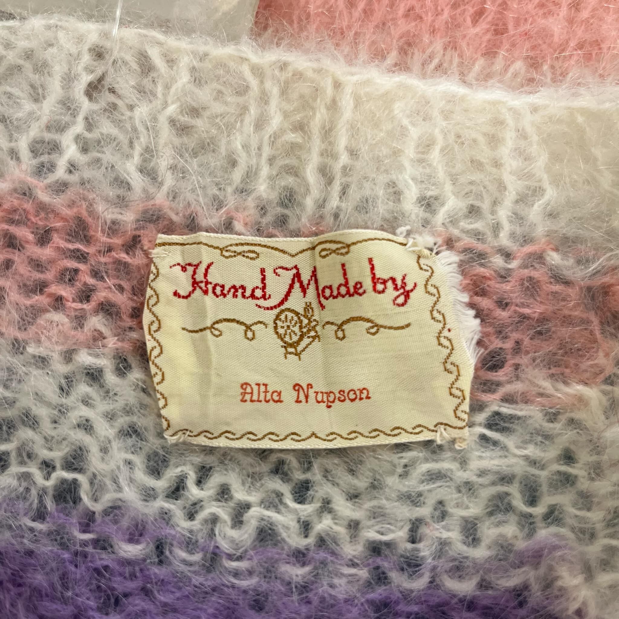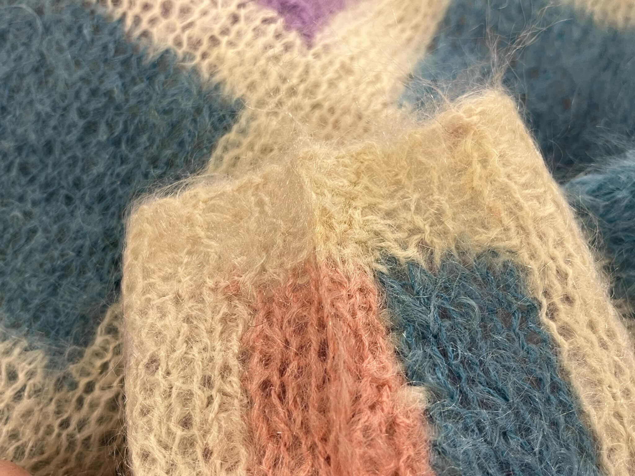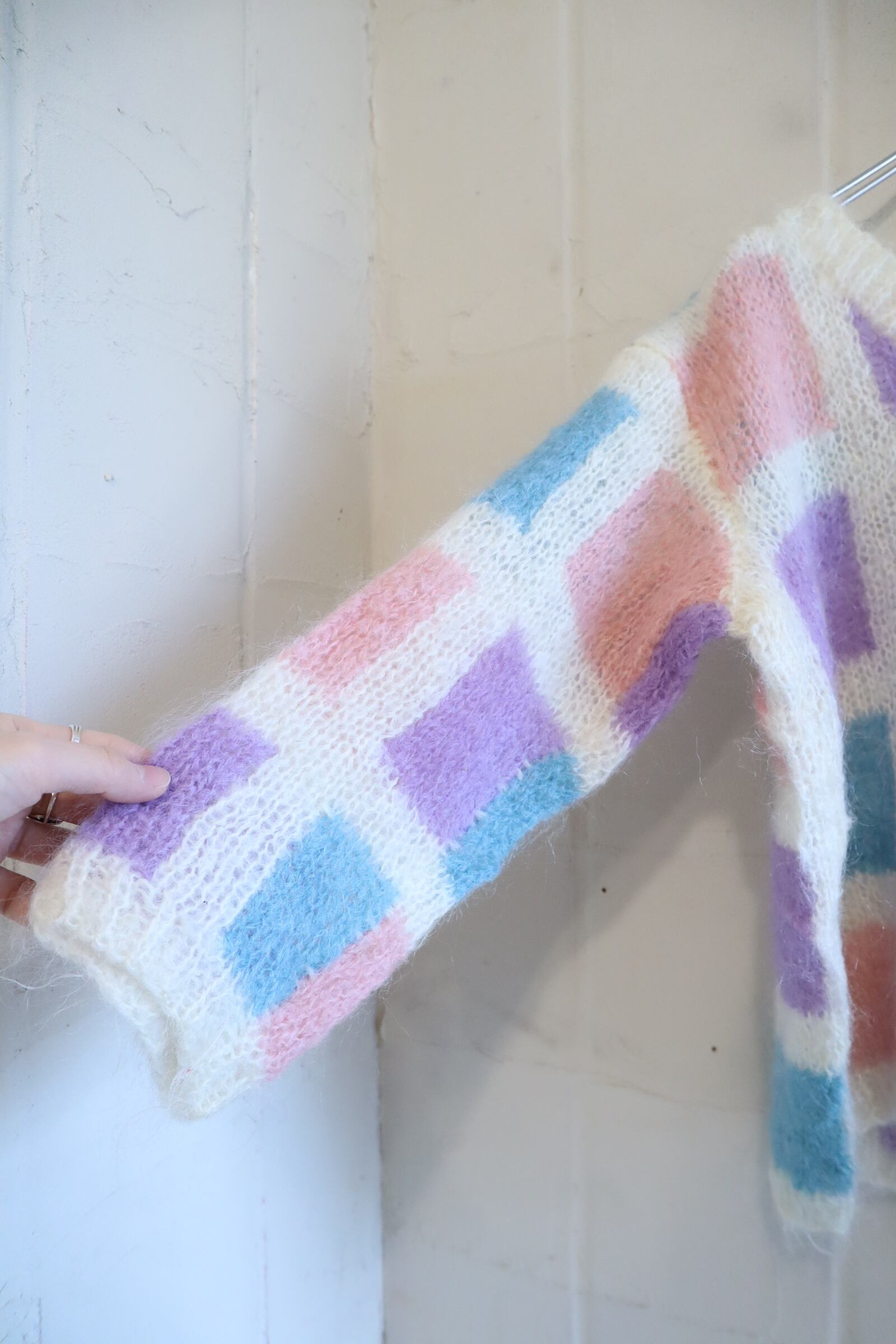 ピンクパープルブルーのブロックチェックが可愛いモヘアニット。