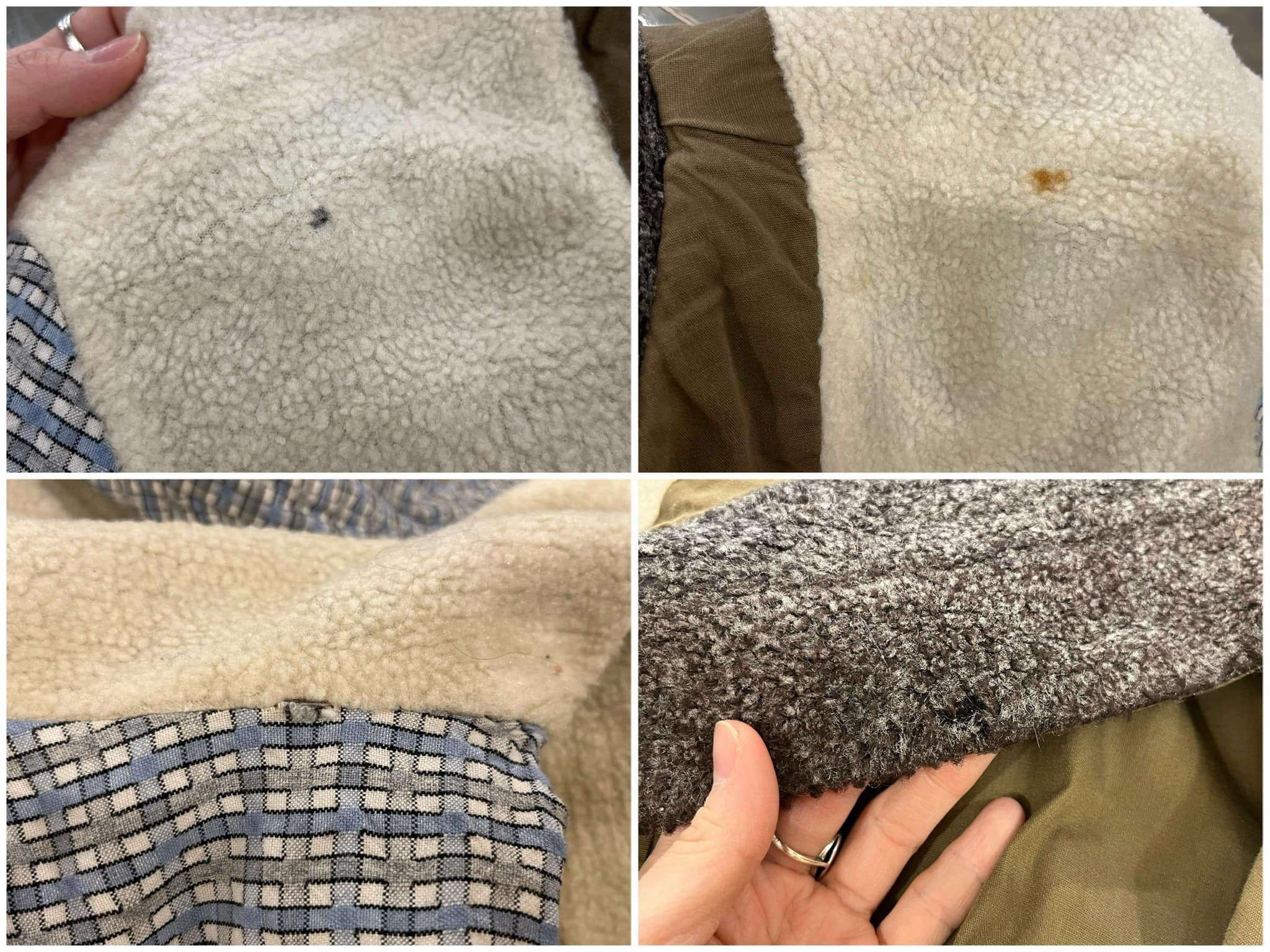 裏地にシミや若干ホツレが見受けられますが、表からは見えない為あまり気にならないかと思います。