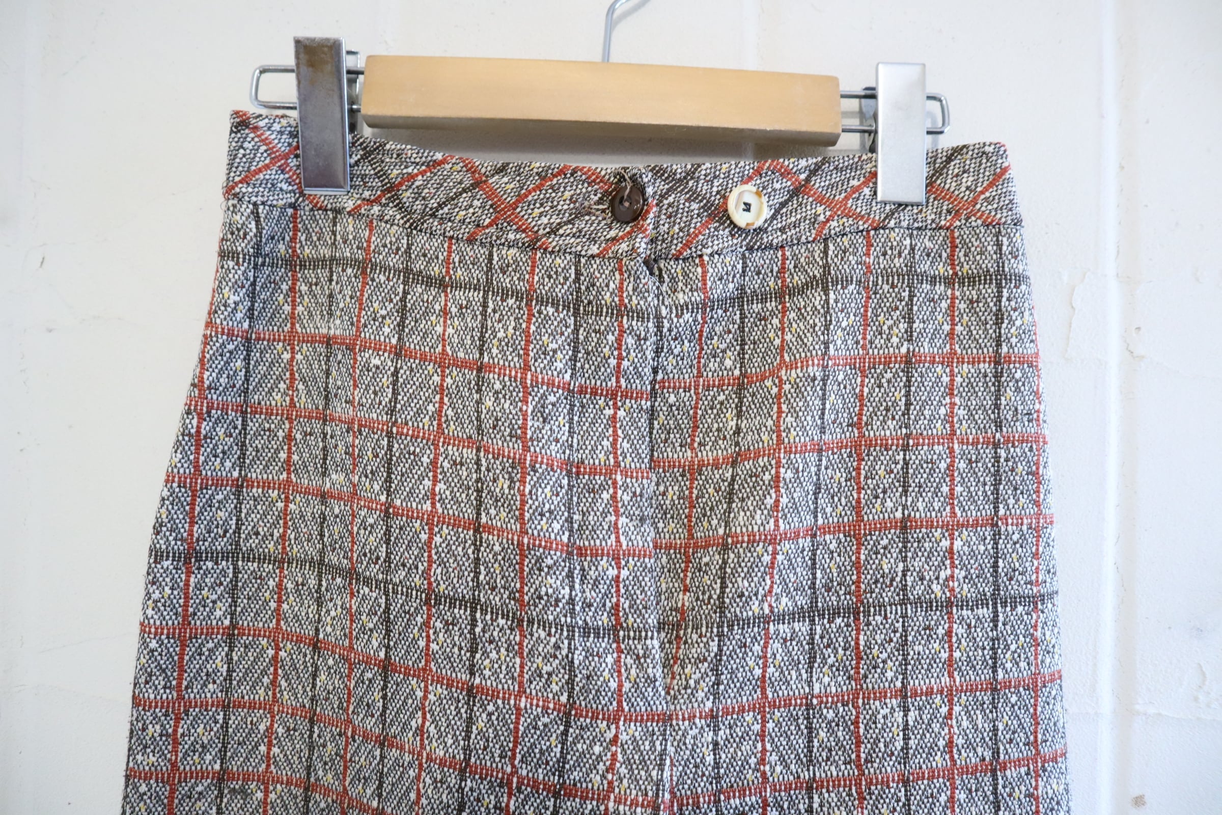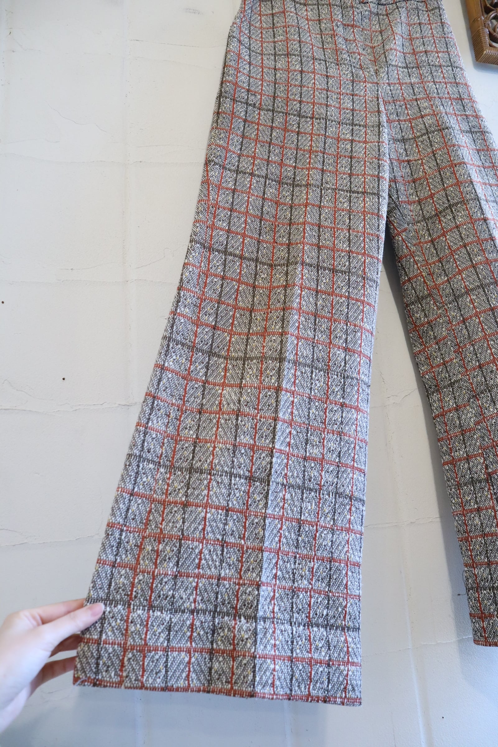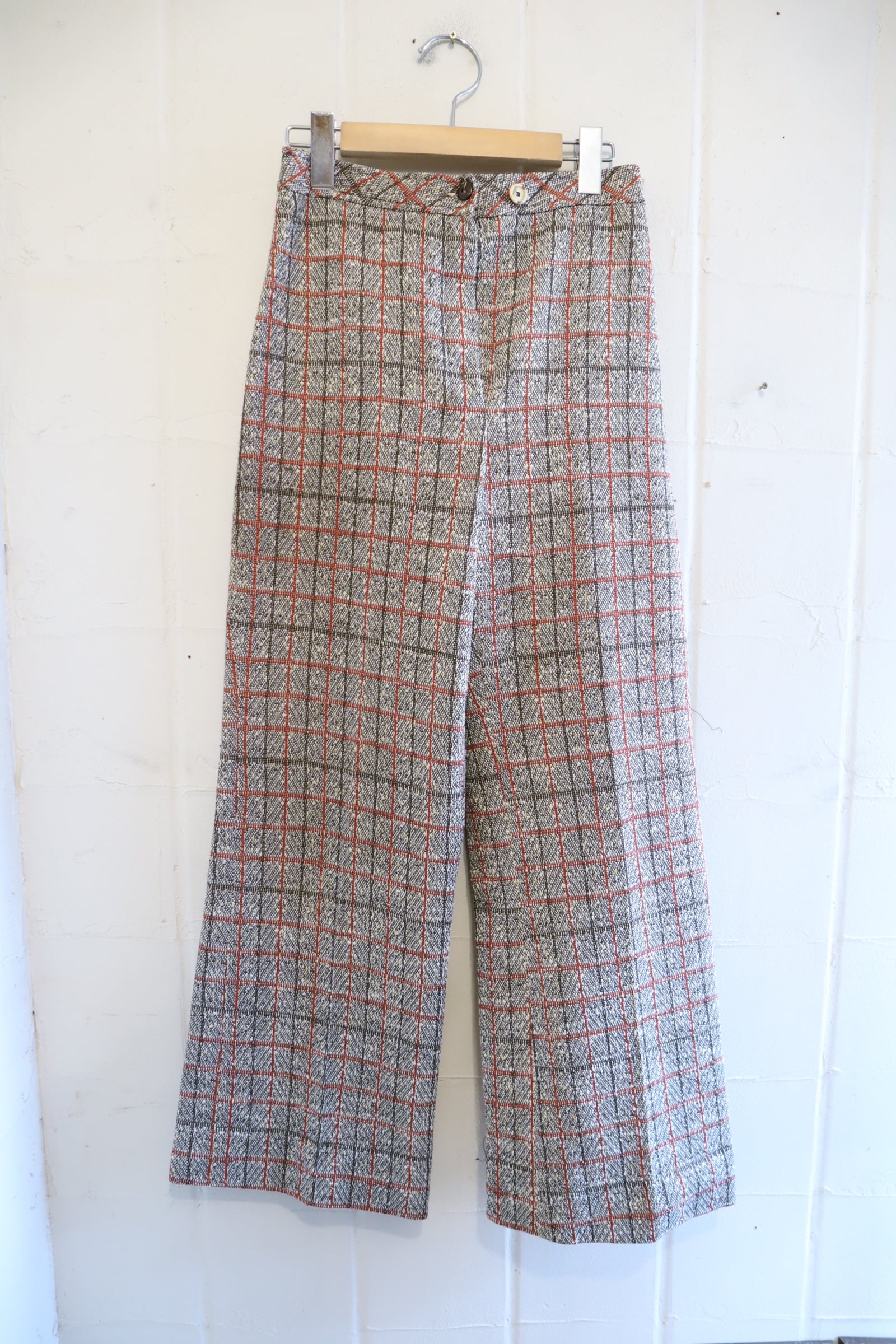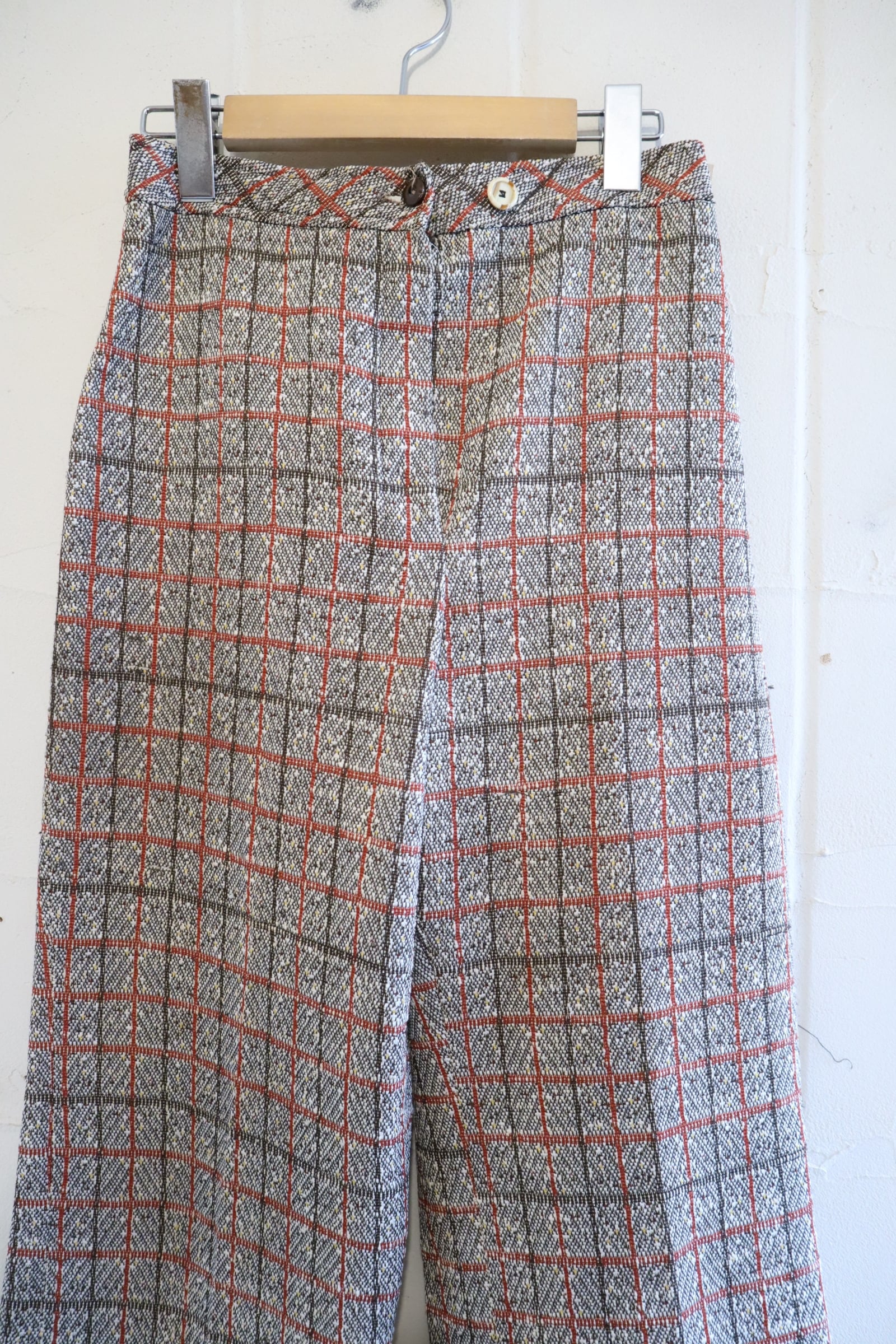 70s brown×dullorange plaid polyester pants [l-4815]