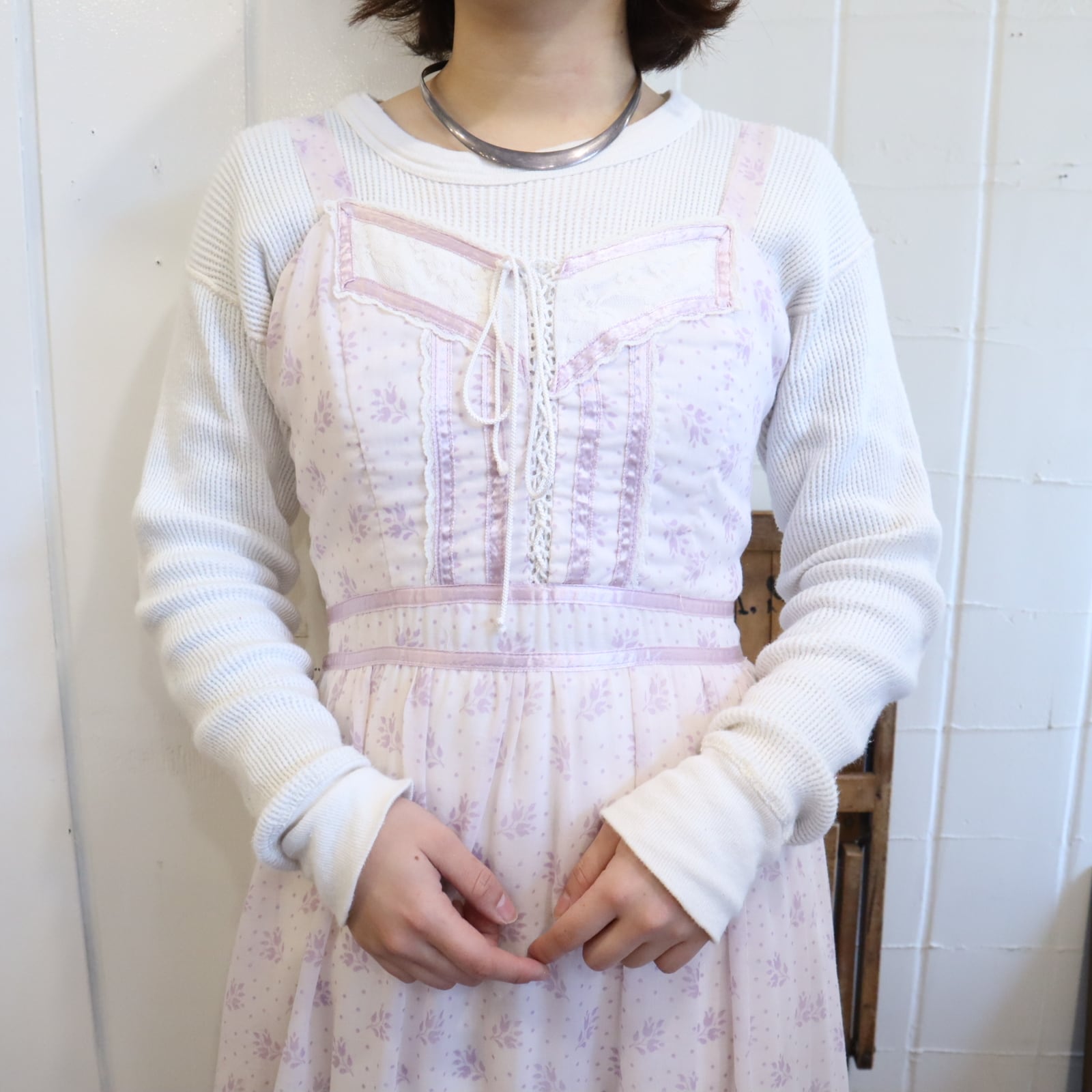 淡いパステル調のラベンダーカラーが素敵なガニーサックスのドレス。