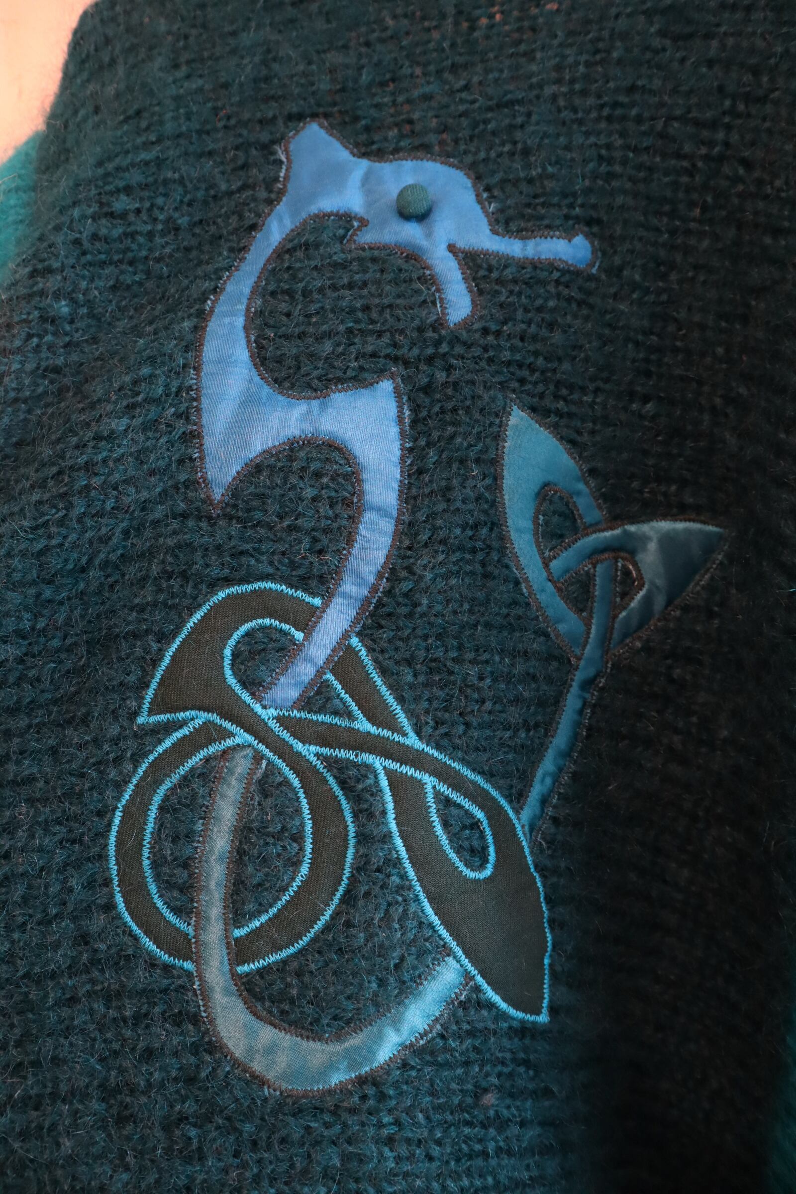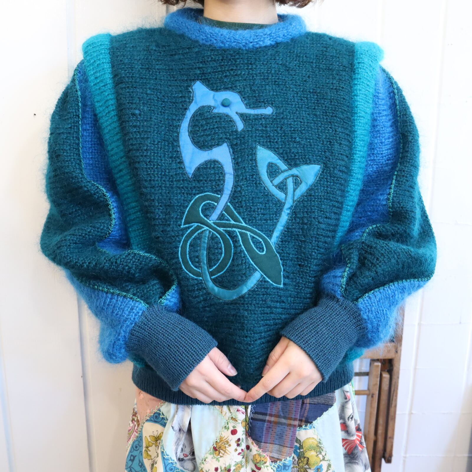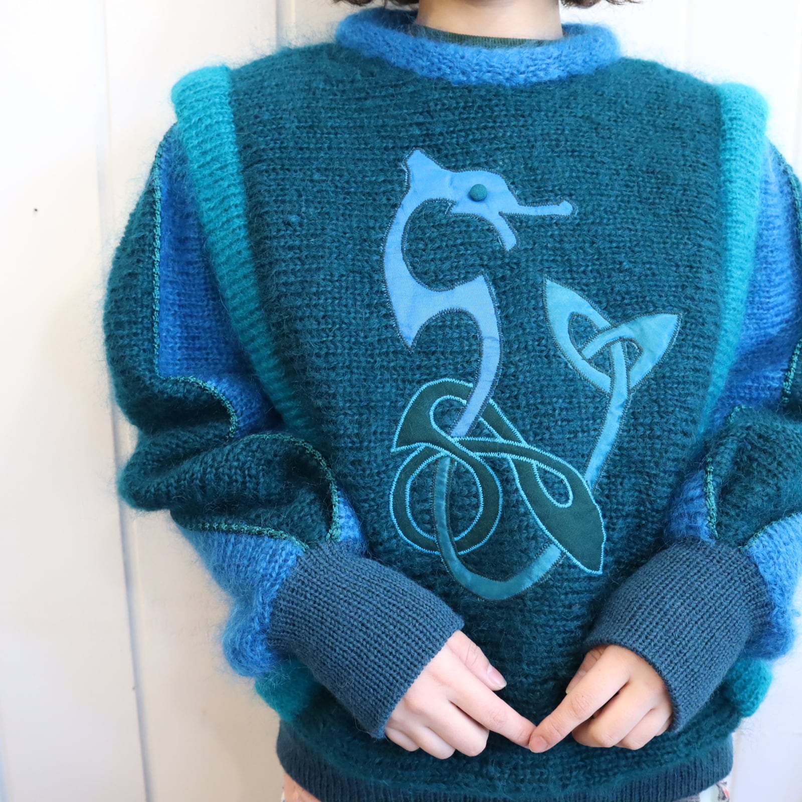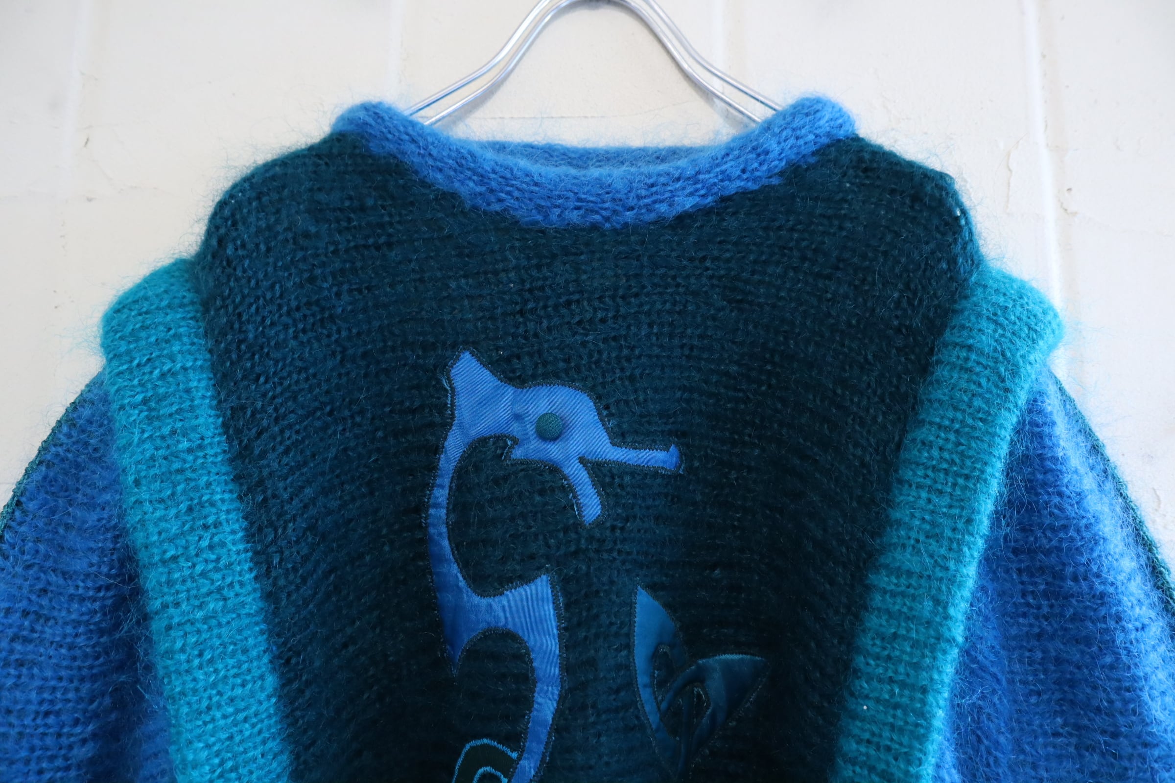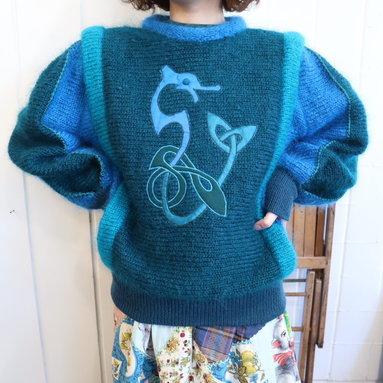 イルカかタツノオトシゴと思われるアップリケが可愛いモヘアニットプルオーバー。