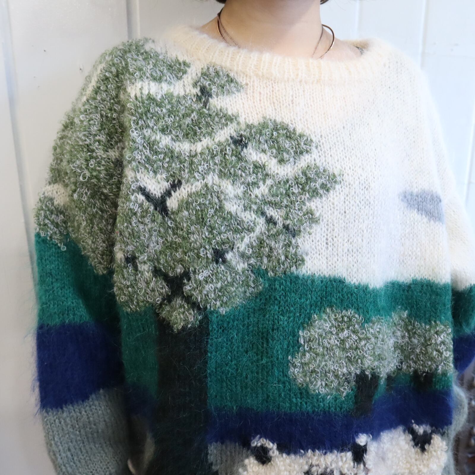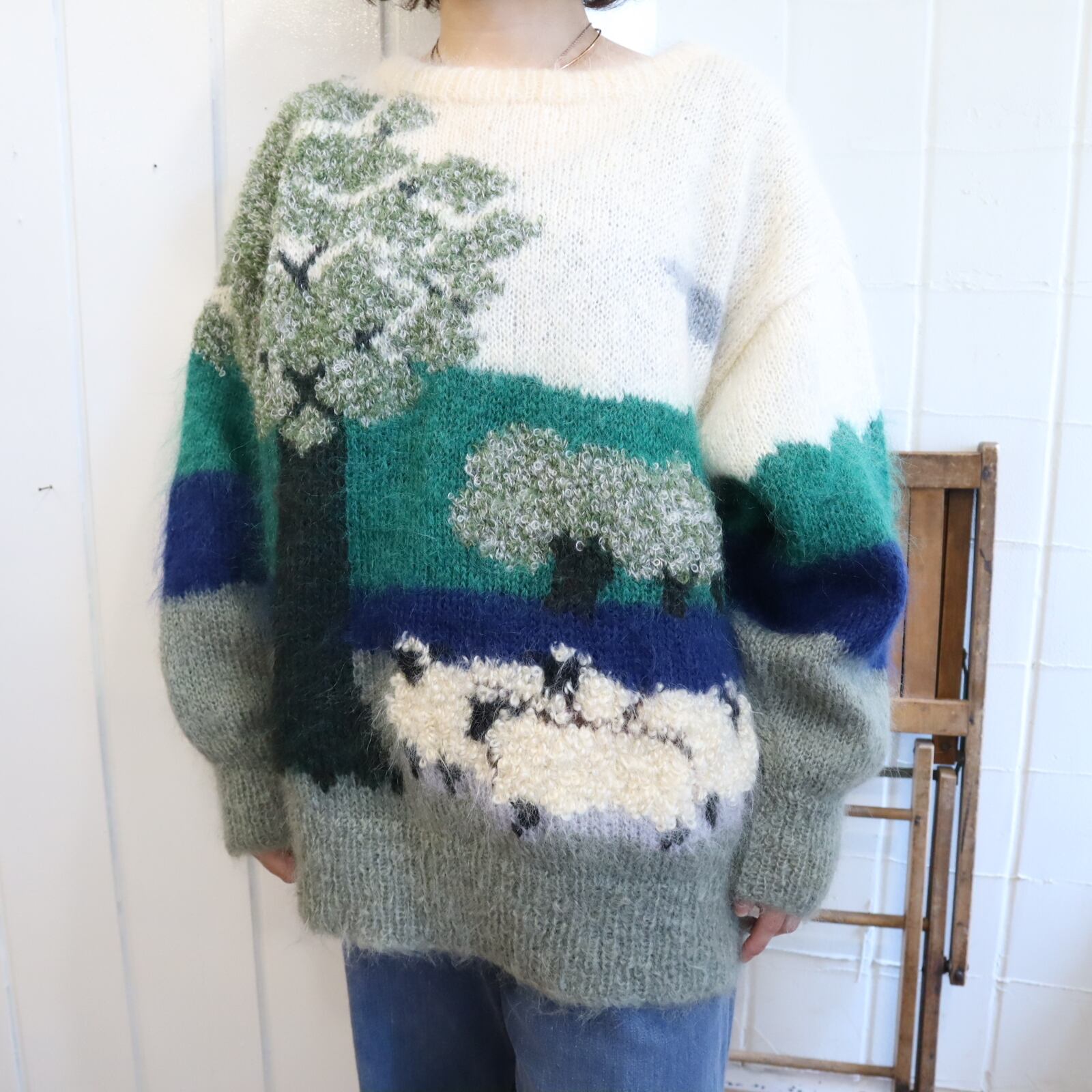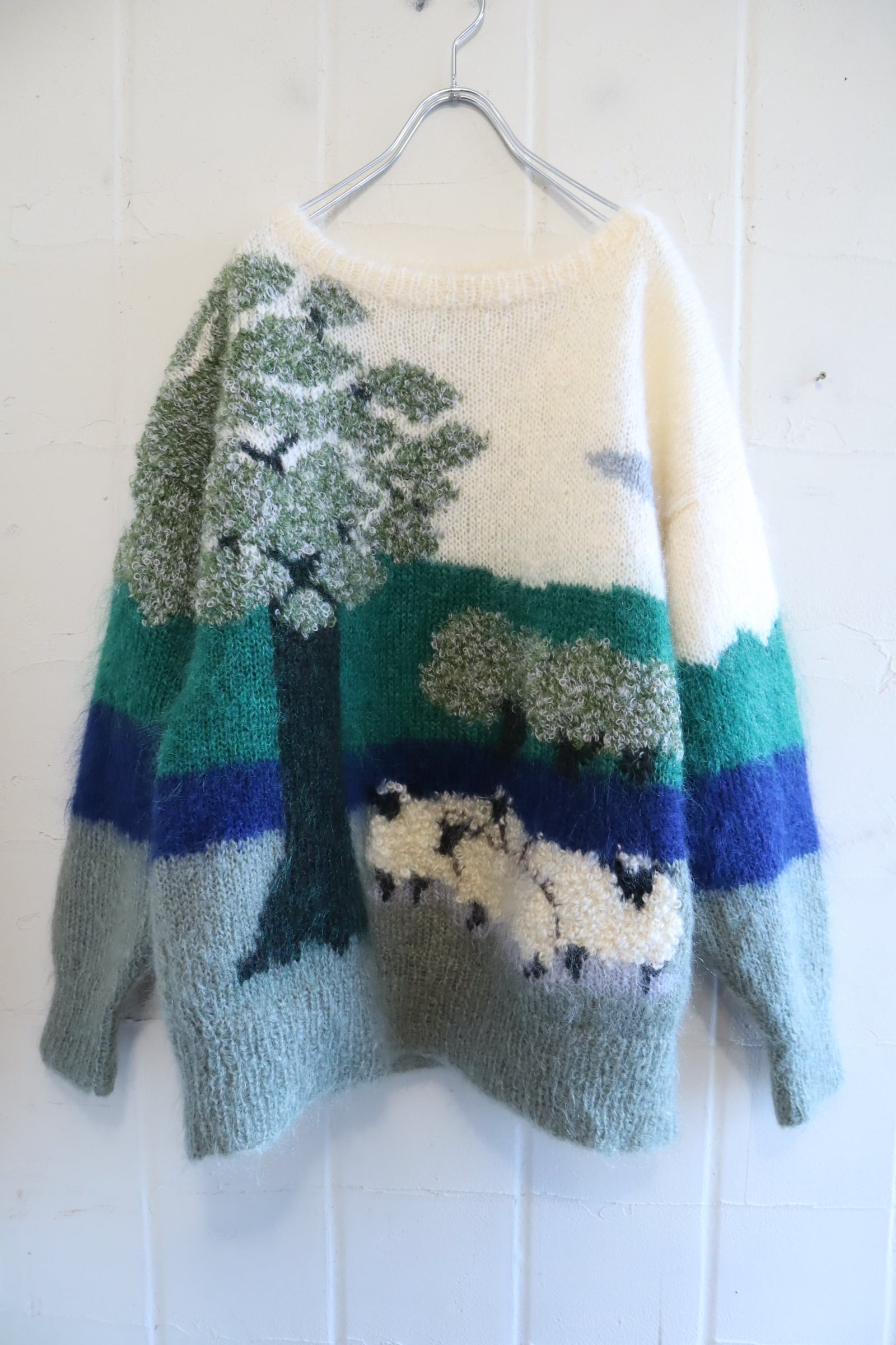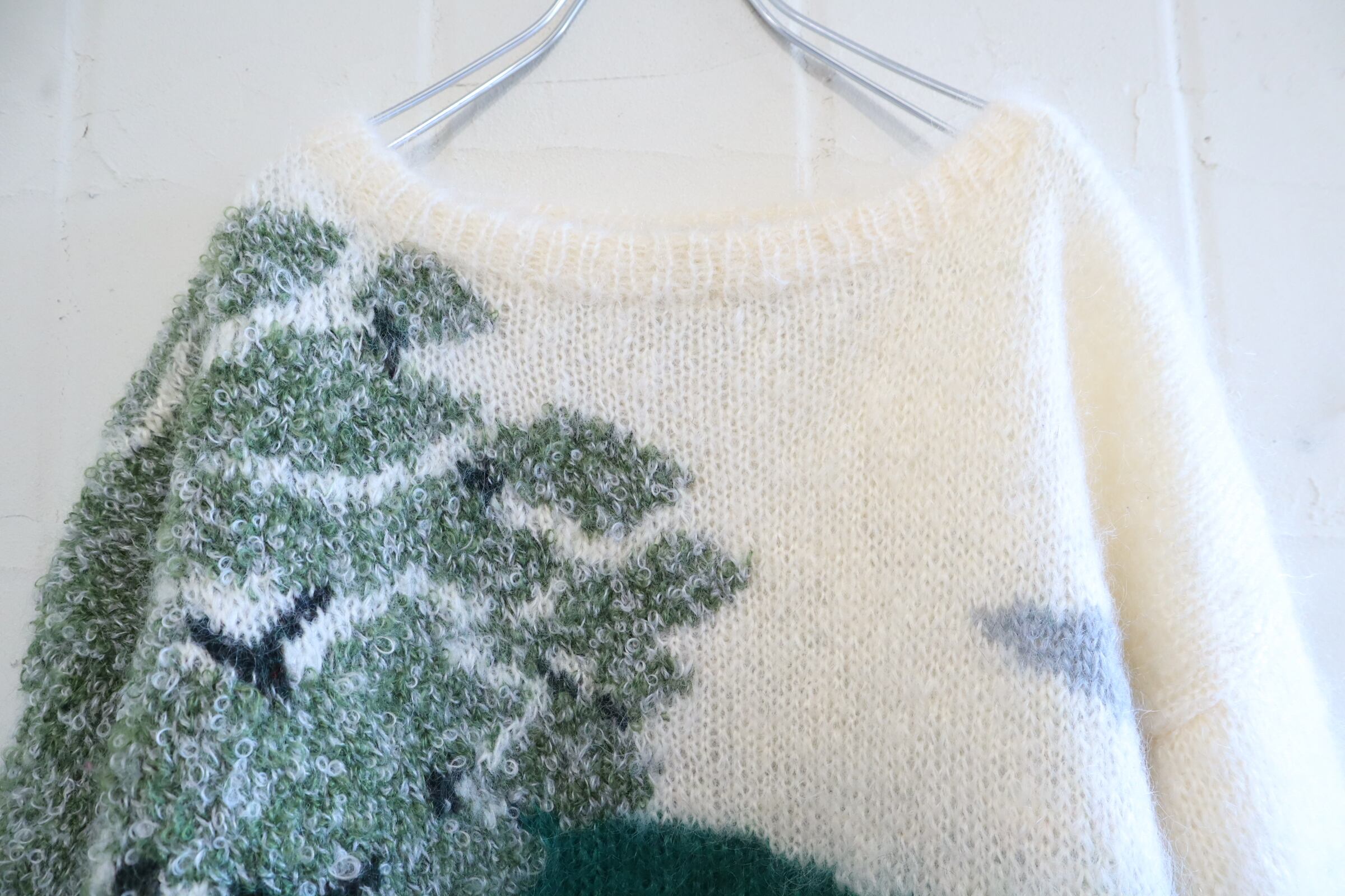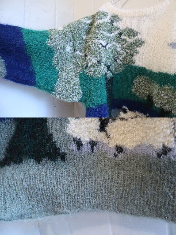 made in England offwhite×green mohair knit pullover [l-4869]