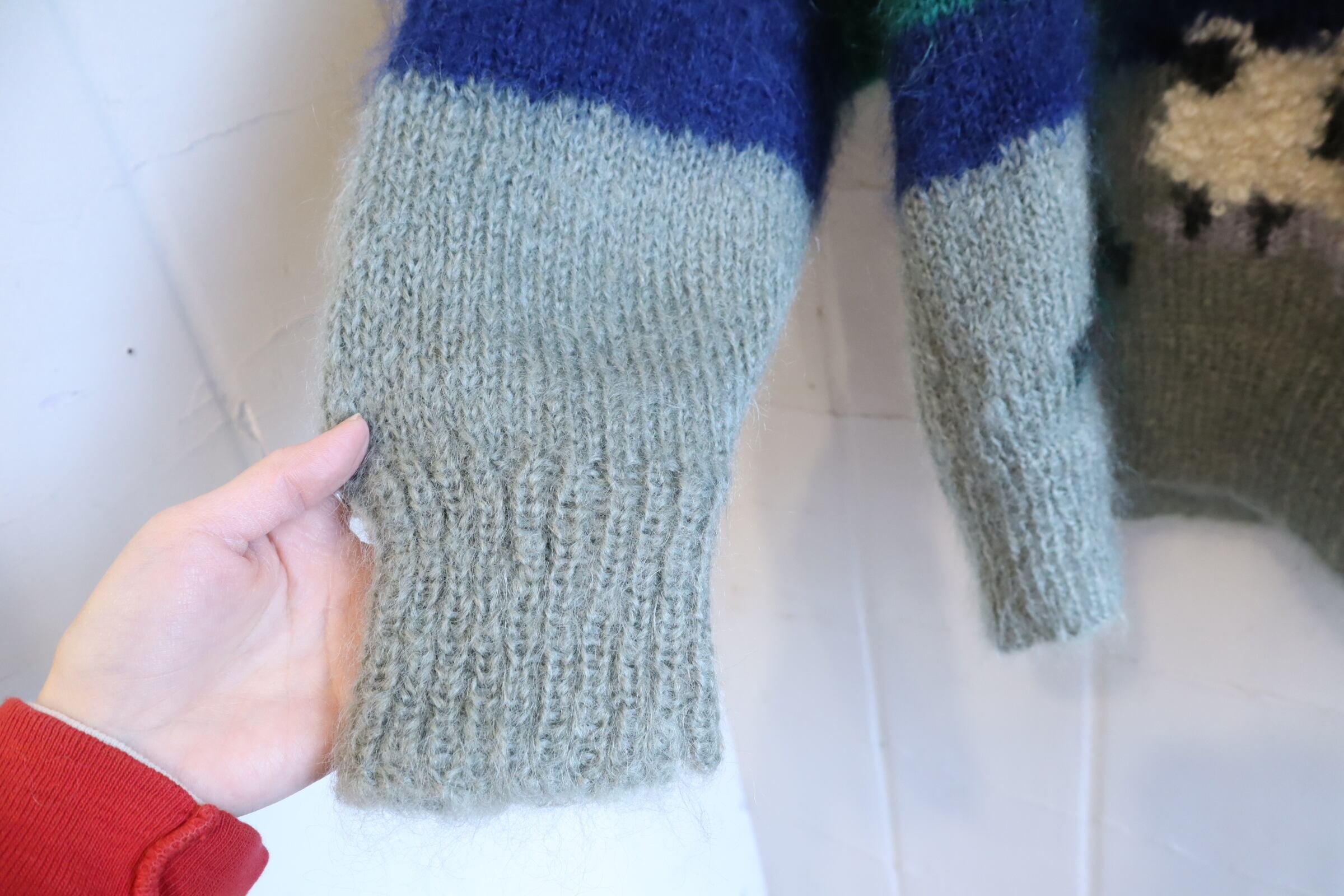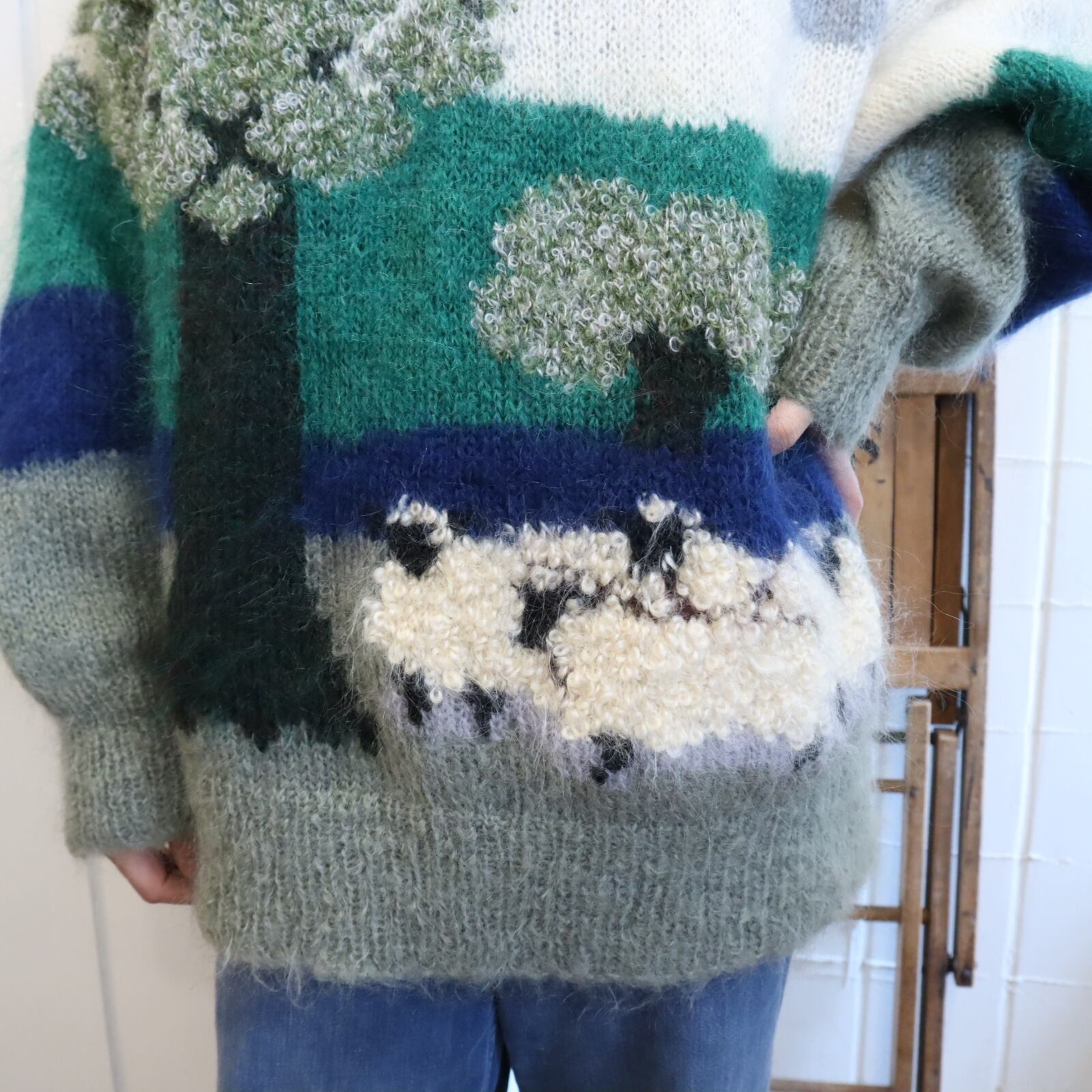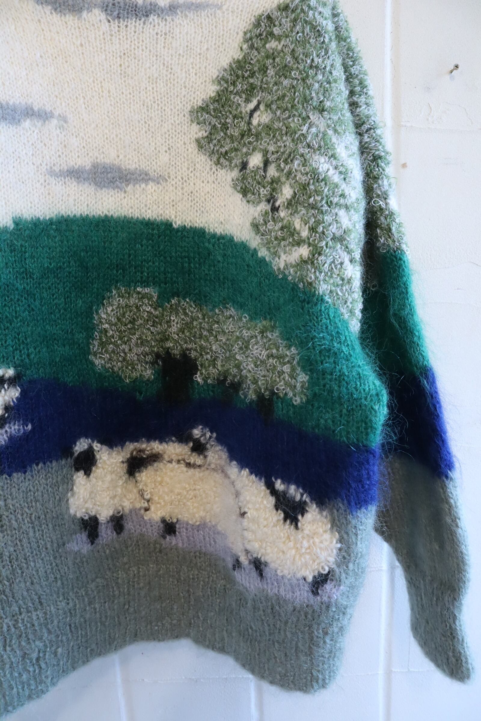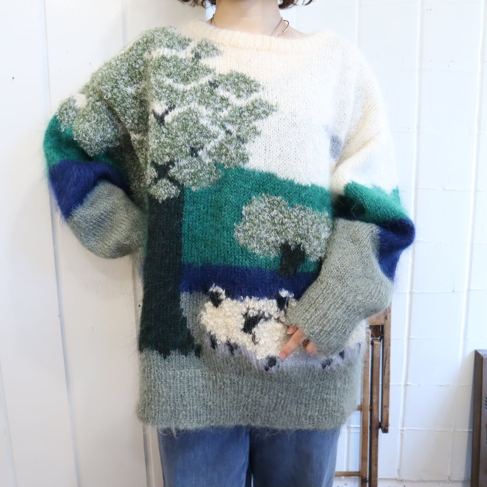 made in England offwhite×green mohair knit pullover [l-4869]