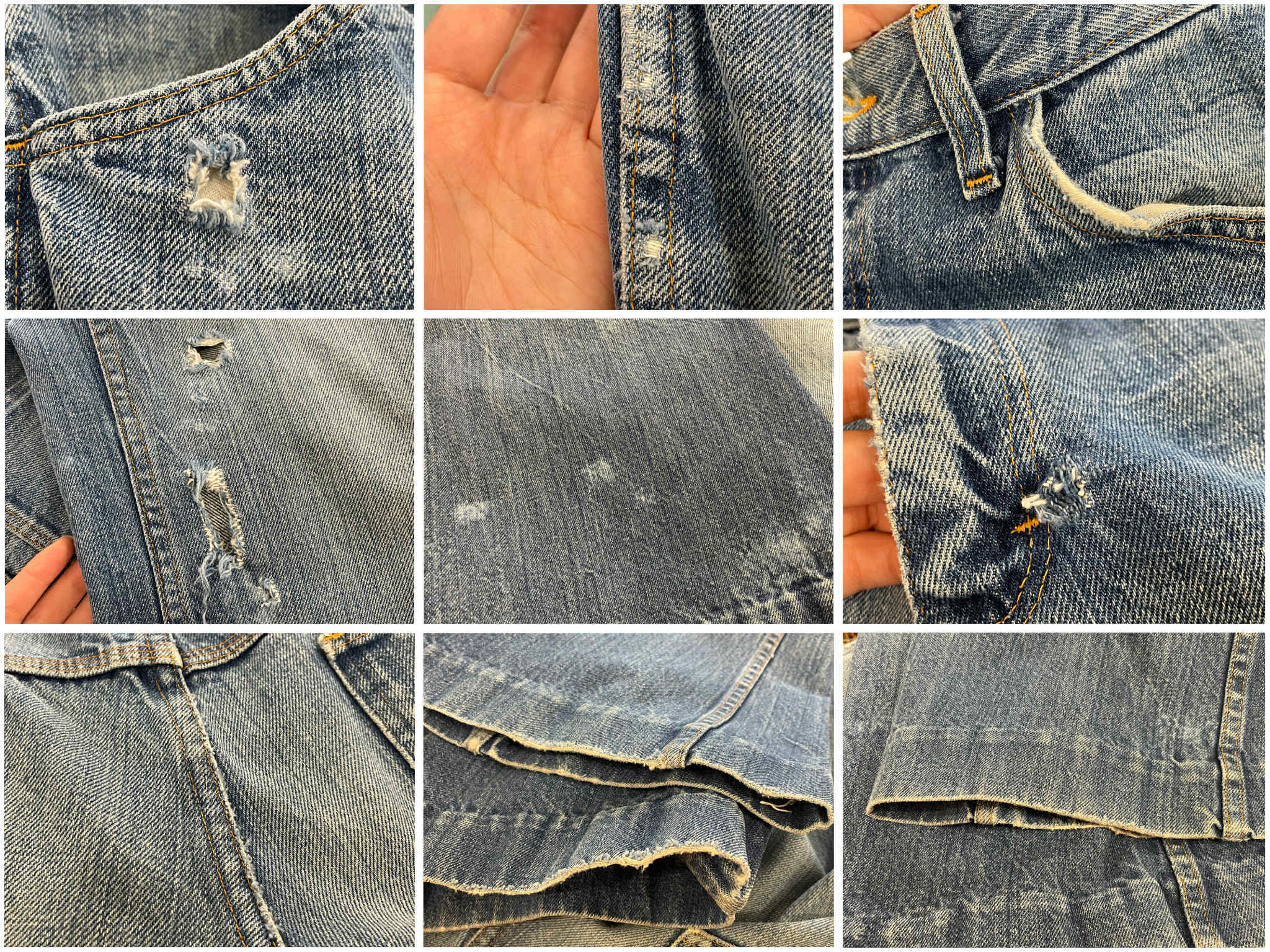 いくつかシミ・キズ・穴・素材特有の擦れが見受けられますが、古着の味として着て頂けるかと思います。
