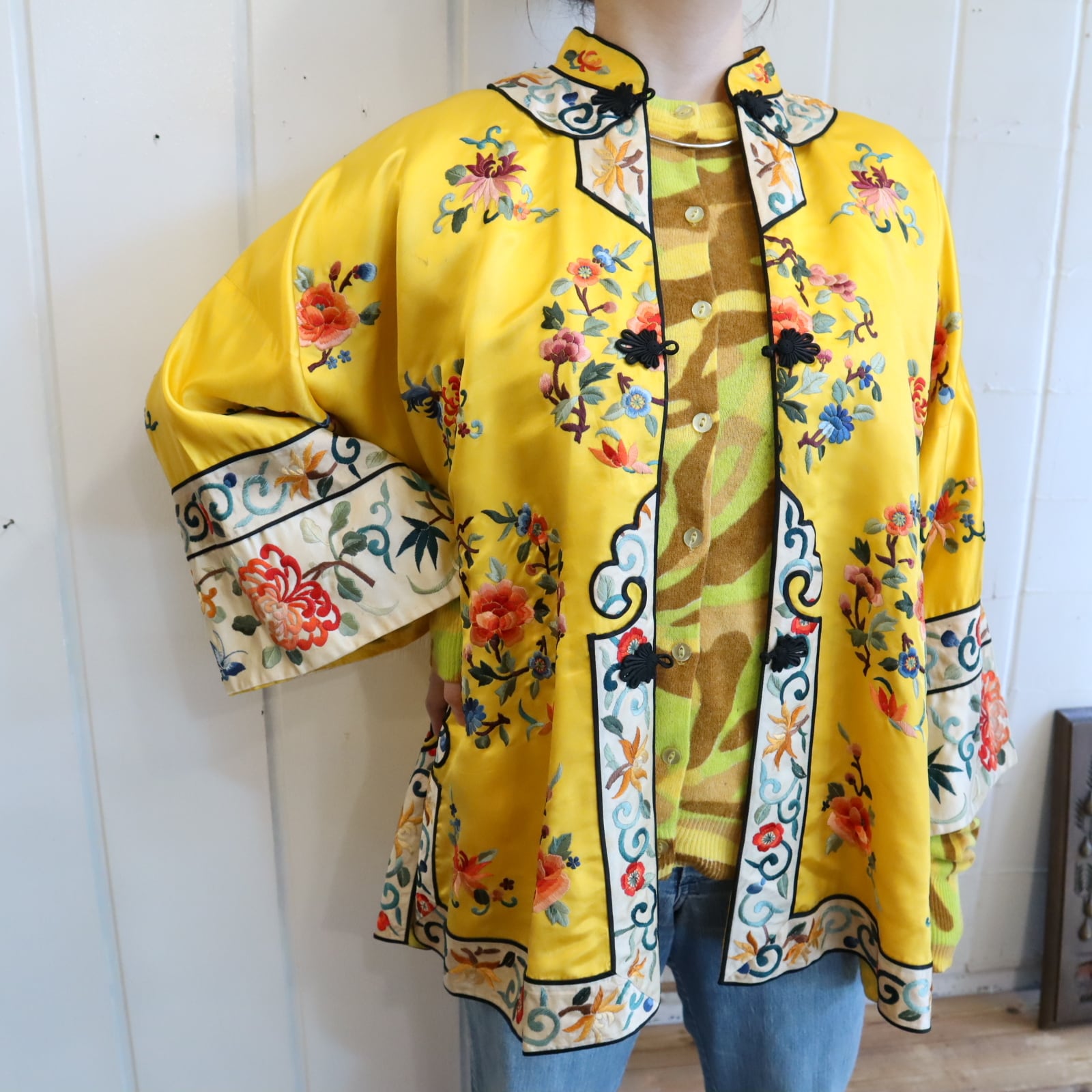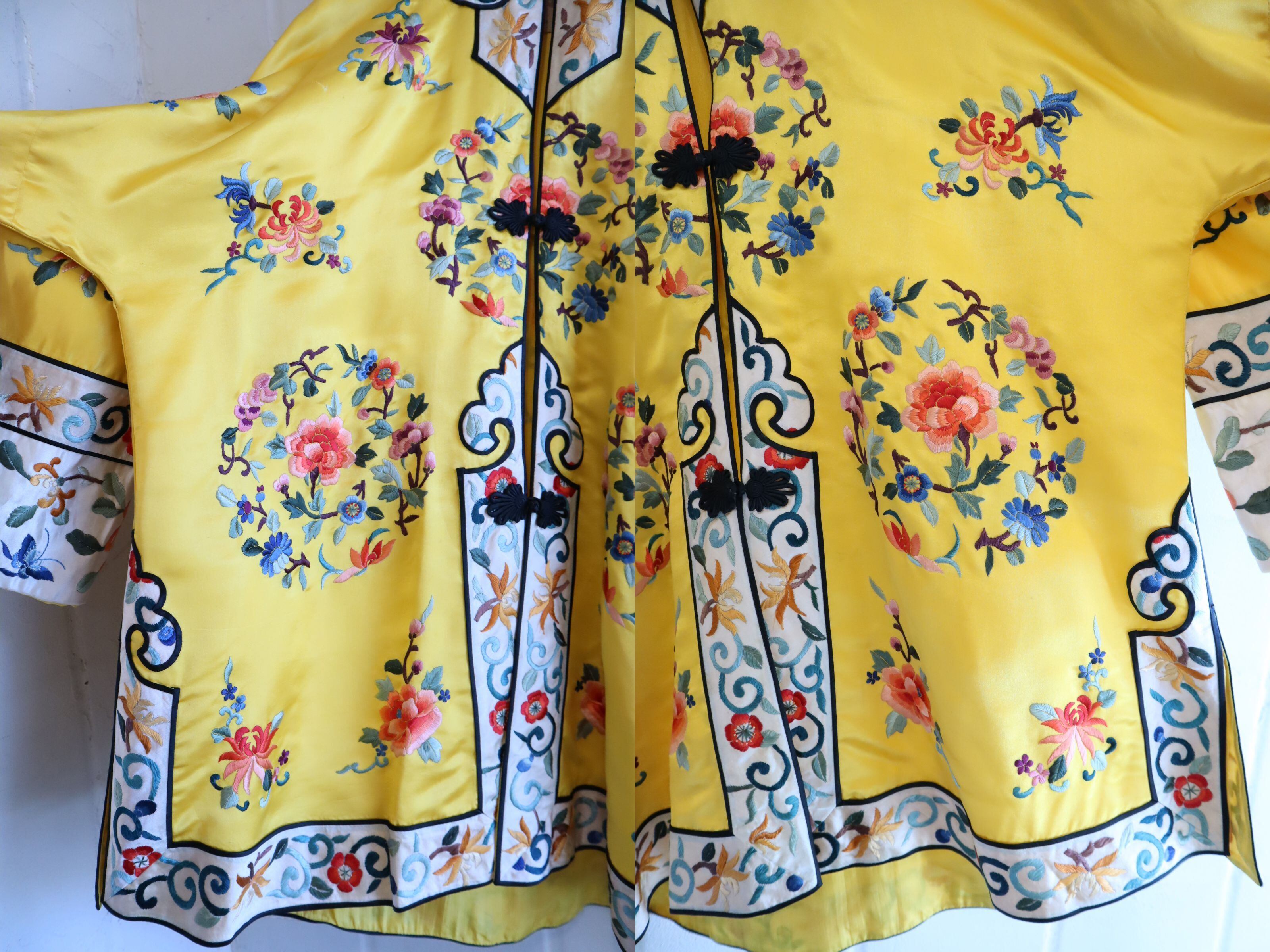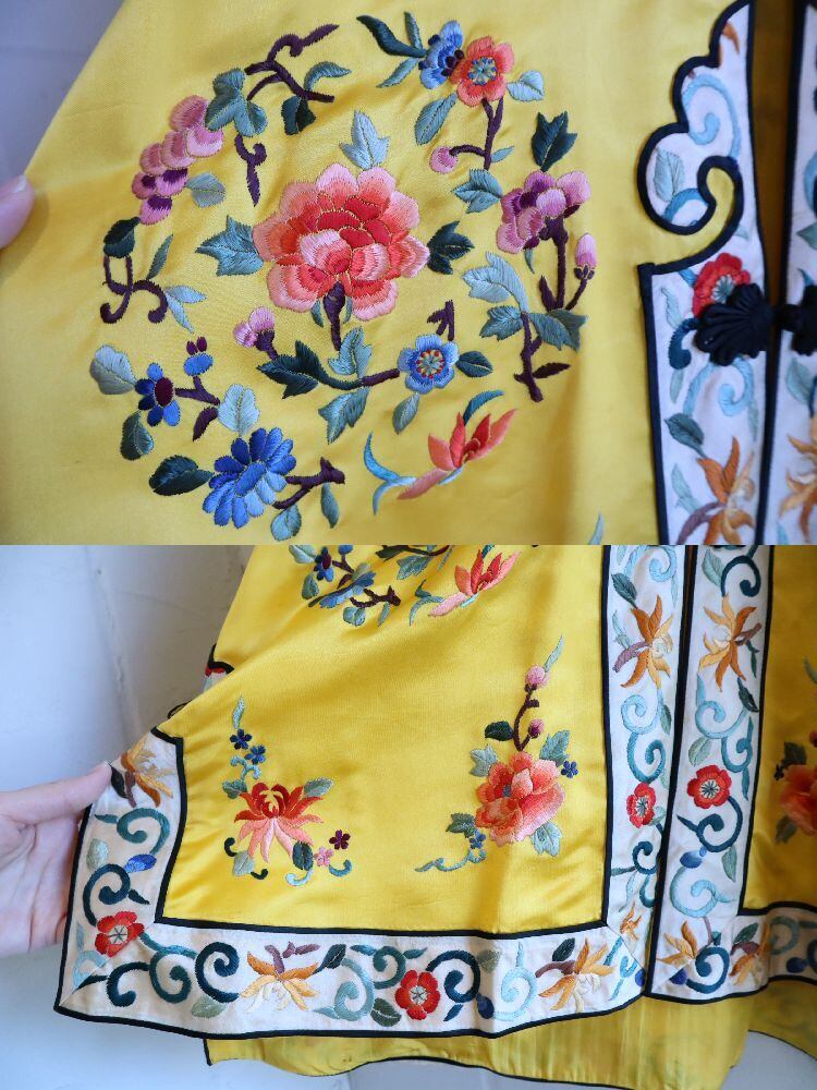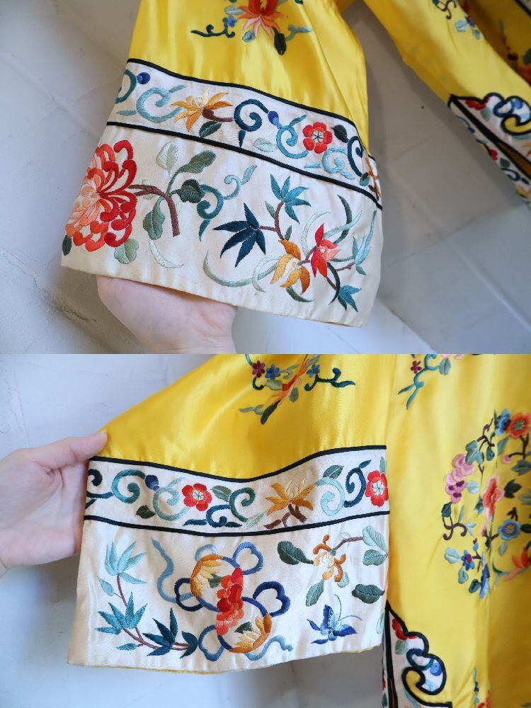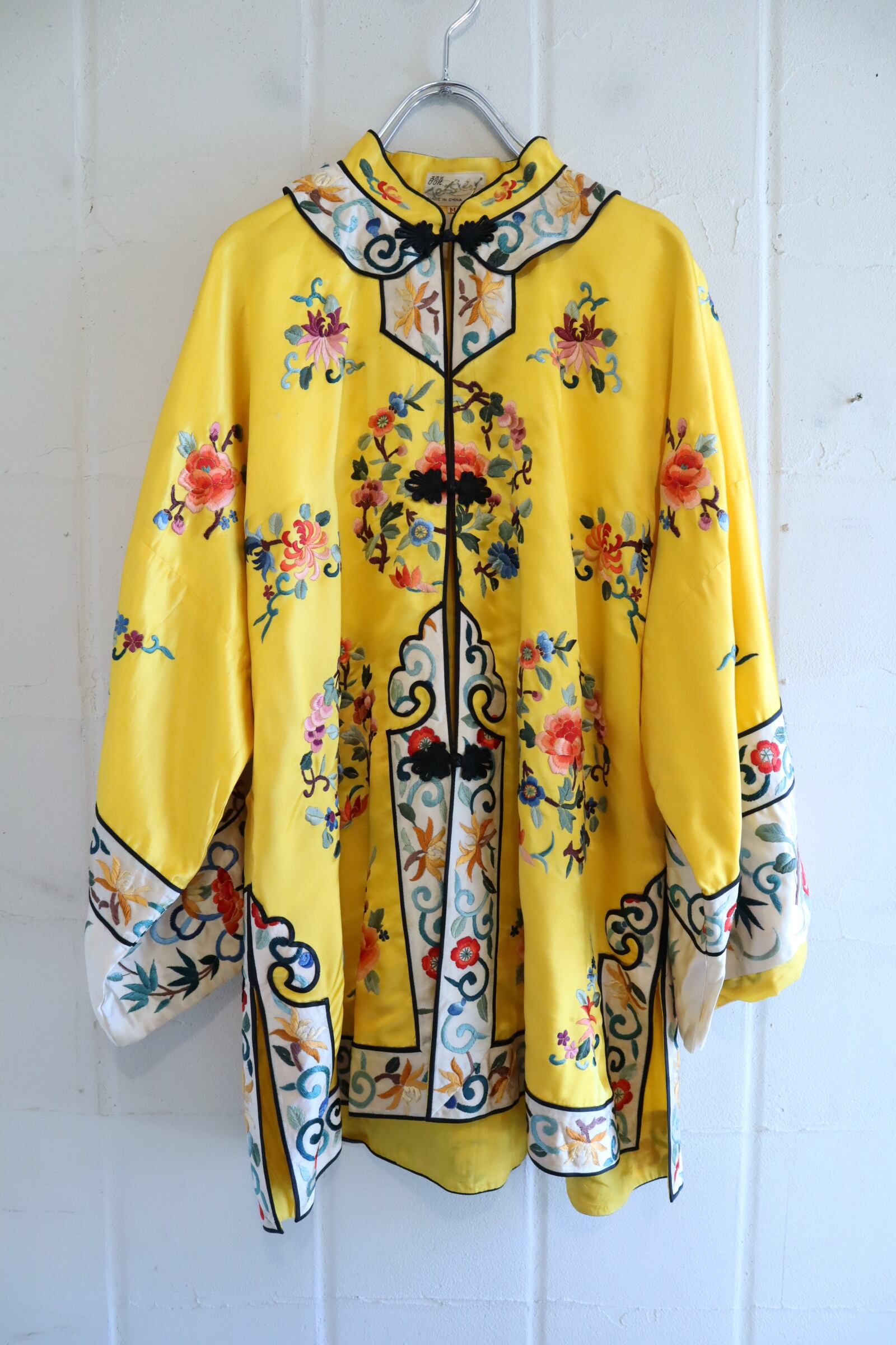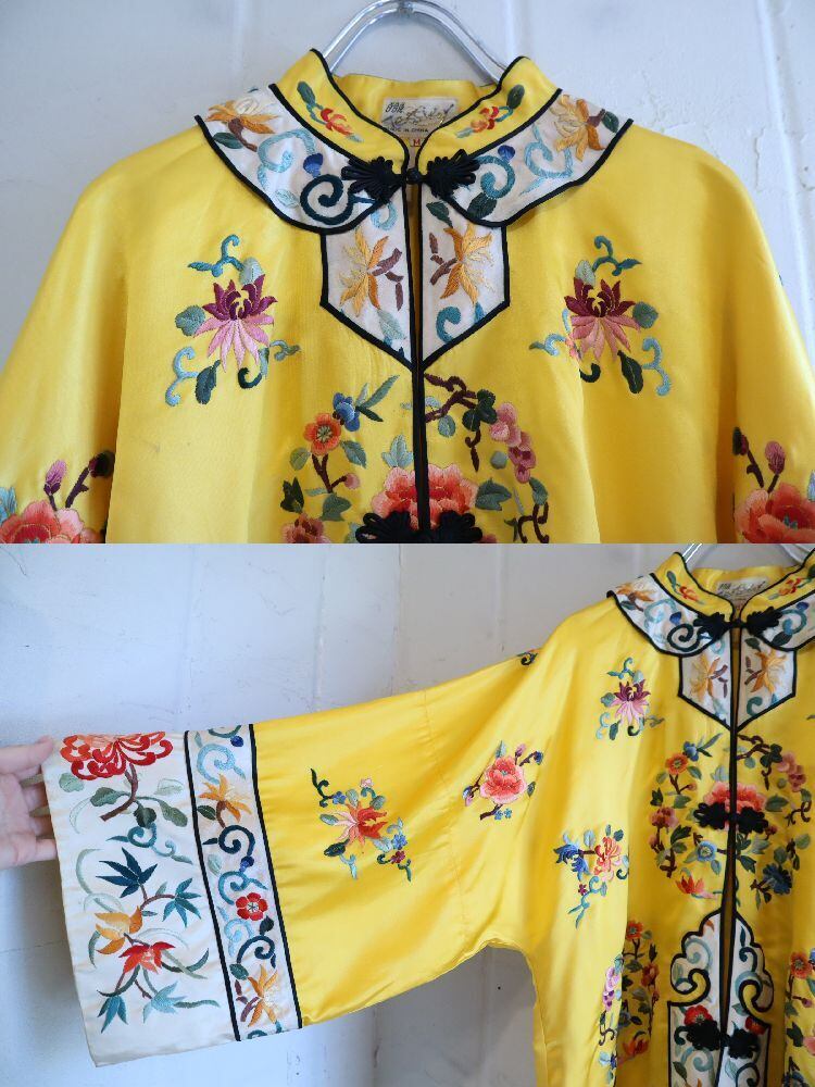 70s yellow×colorful embroidery China shirt jacket [l-4889]