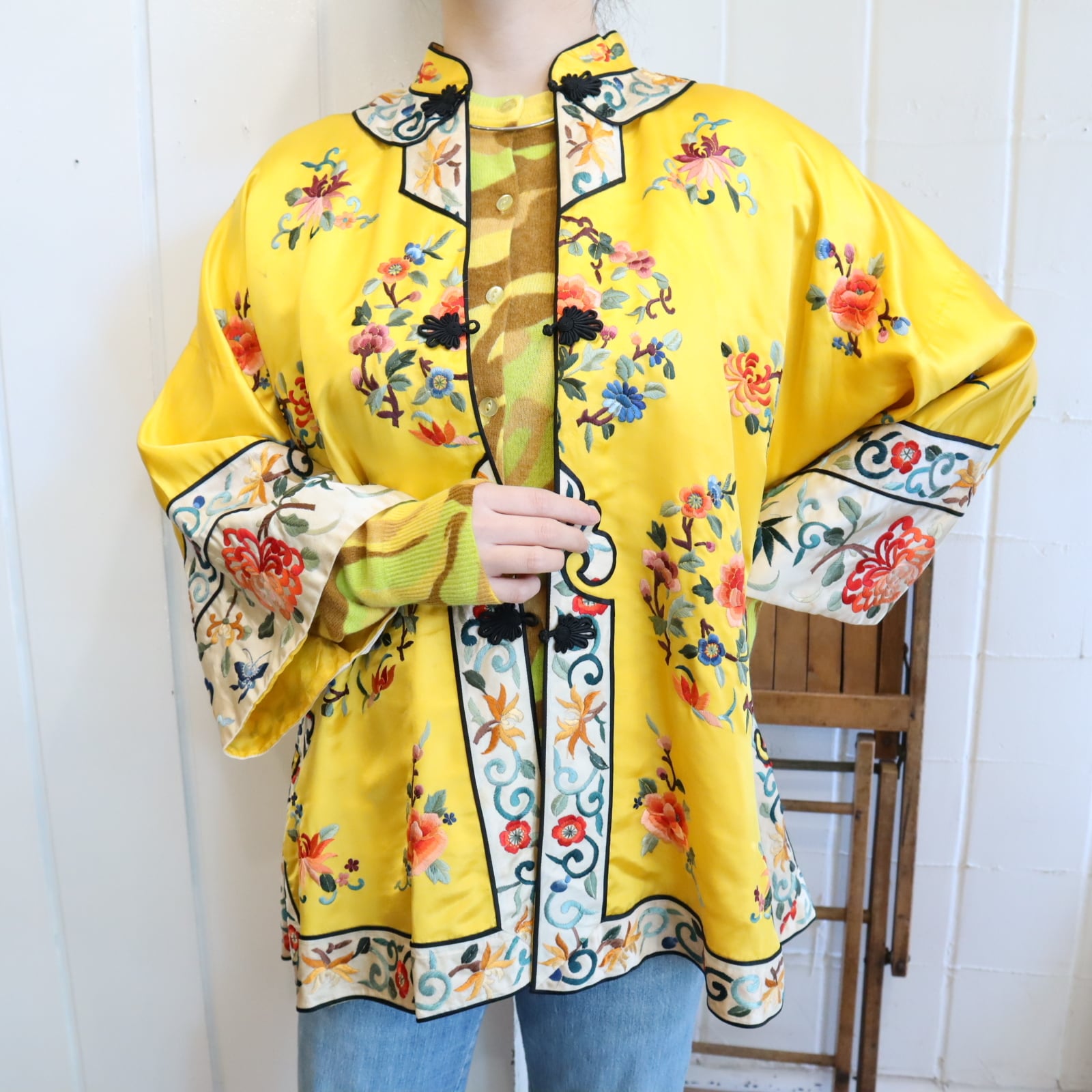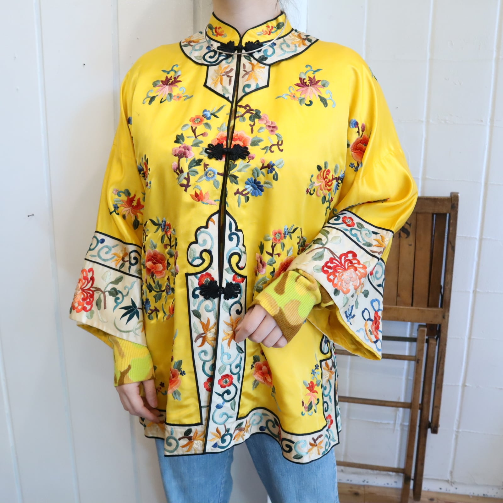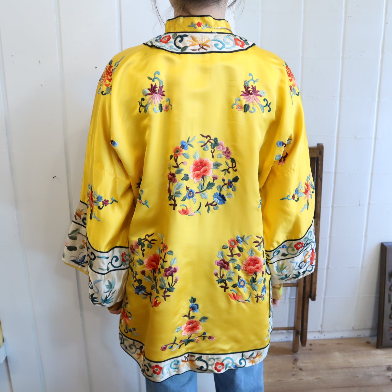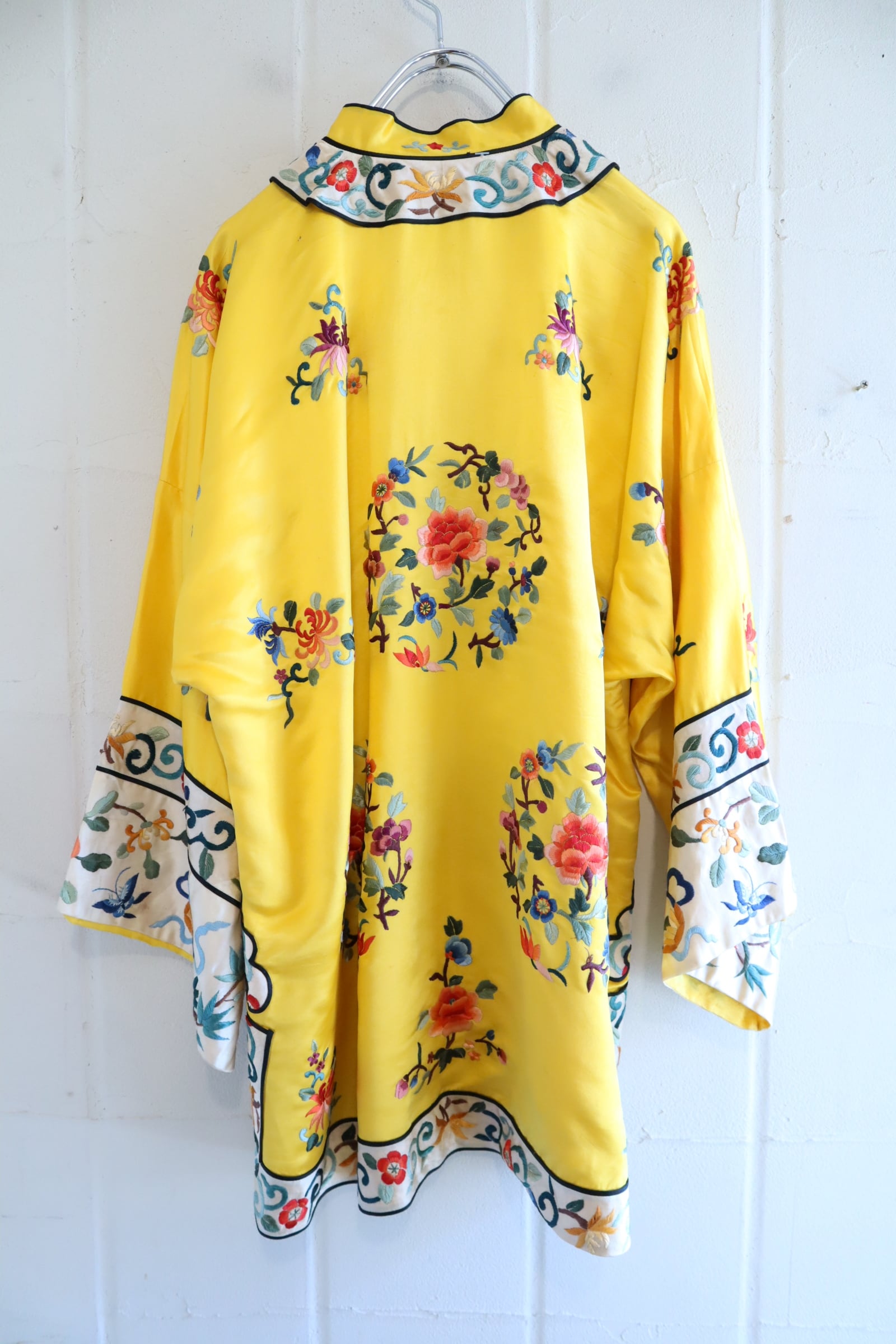 70s yellow×colorful embroidery China shirt jacket [l-4889]