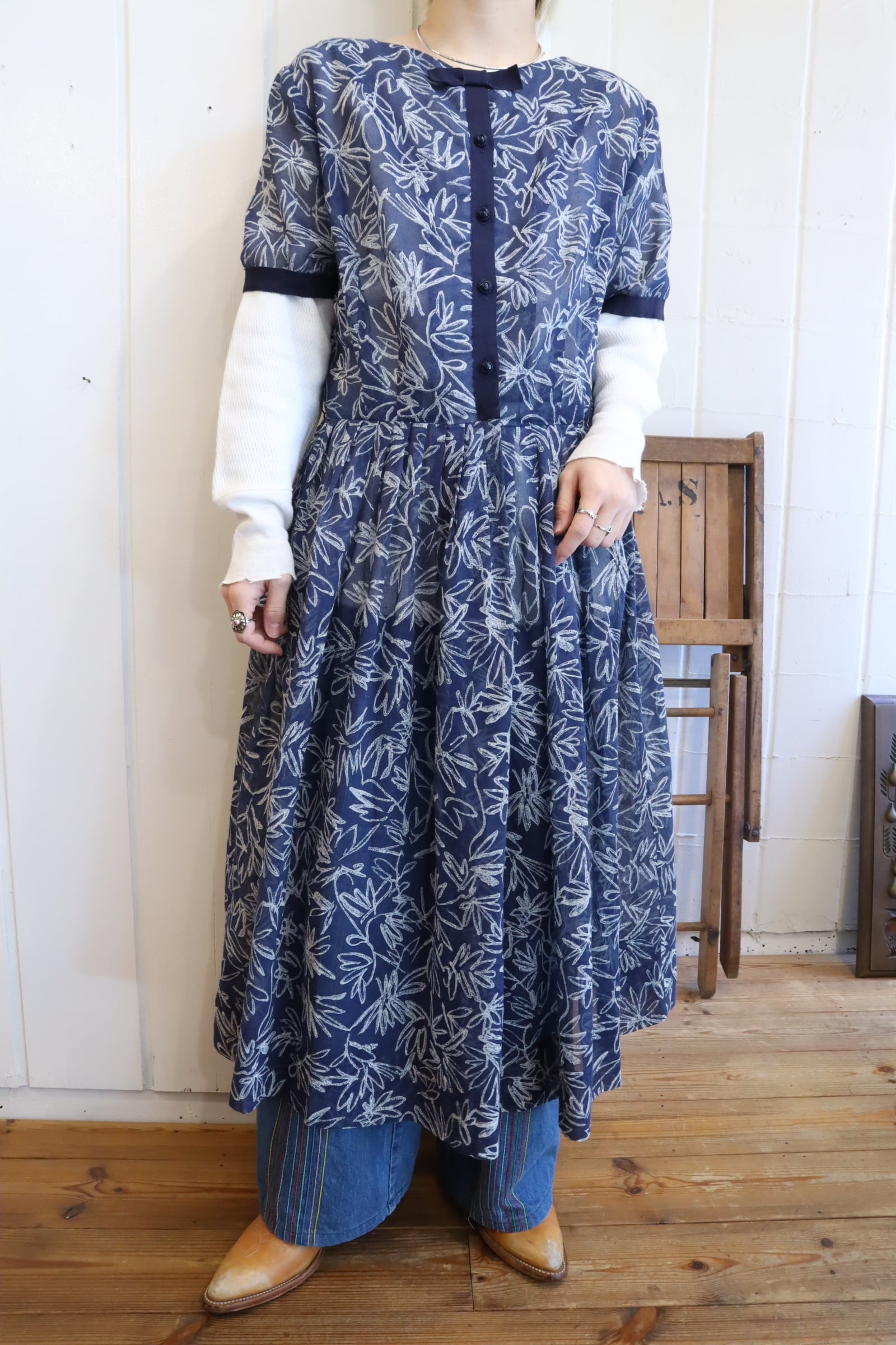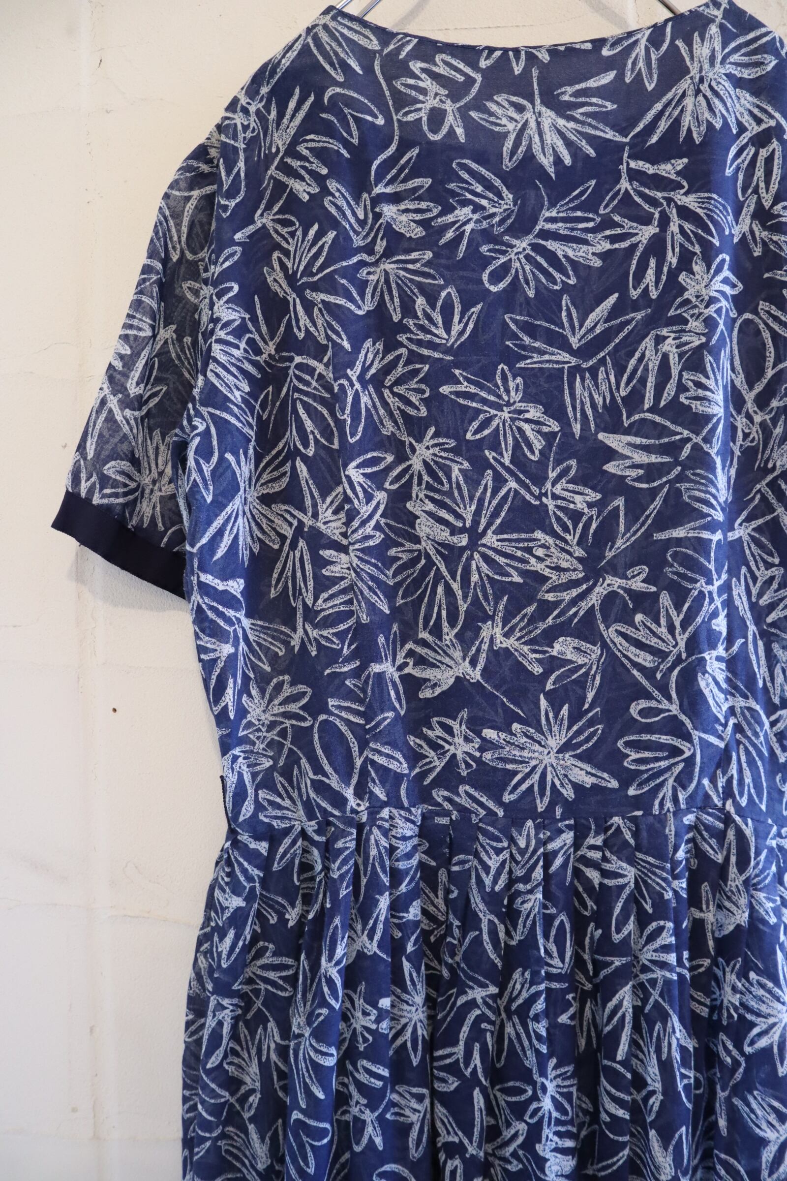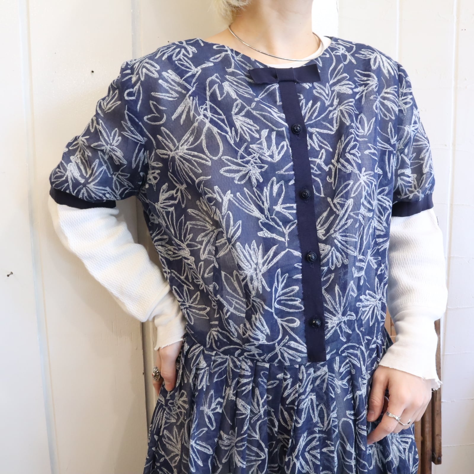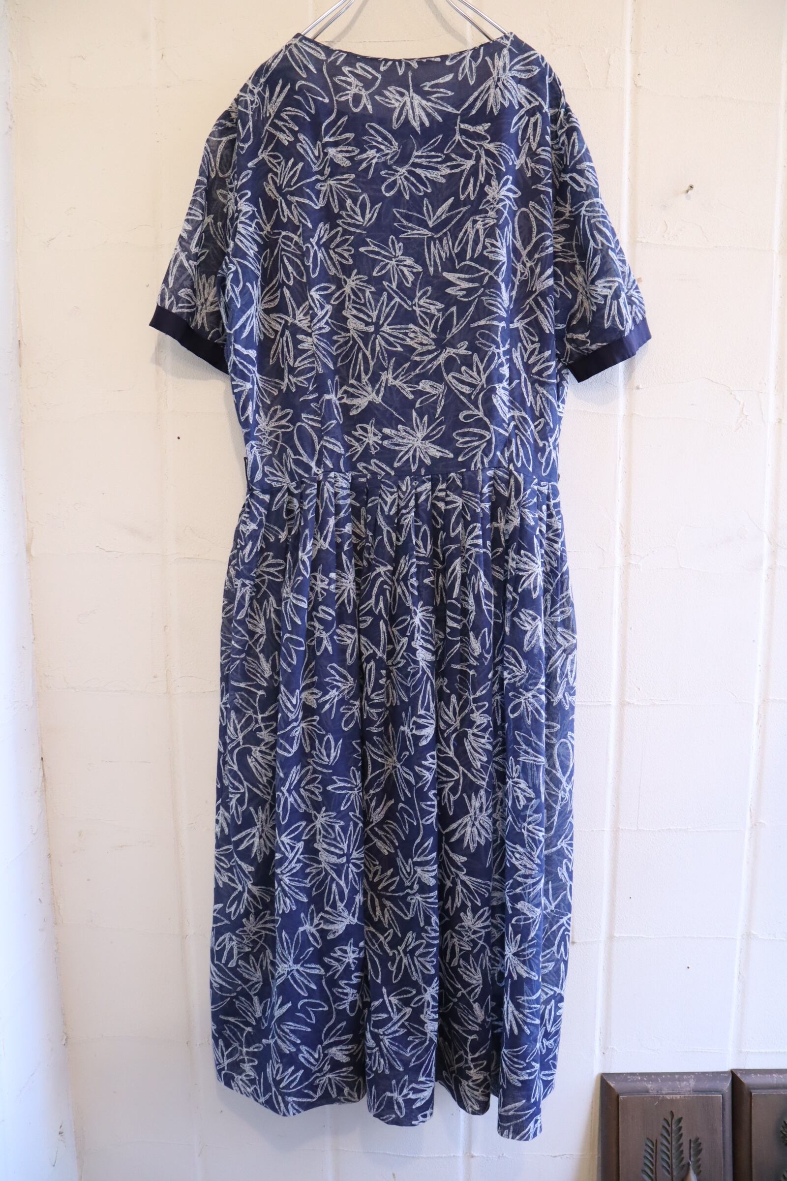 50s-60s navy×white flower print see-through dress [l-4901]