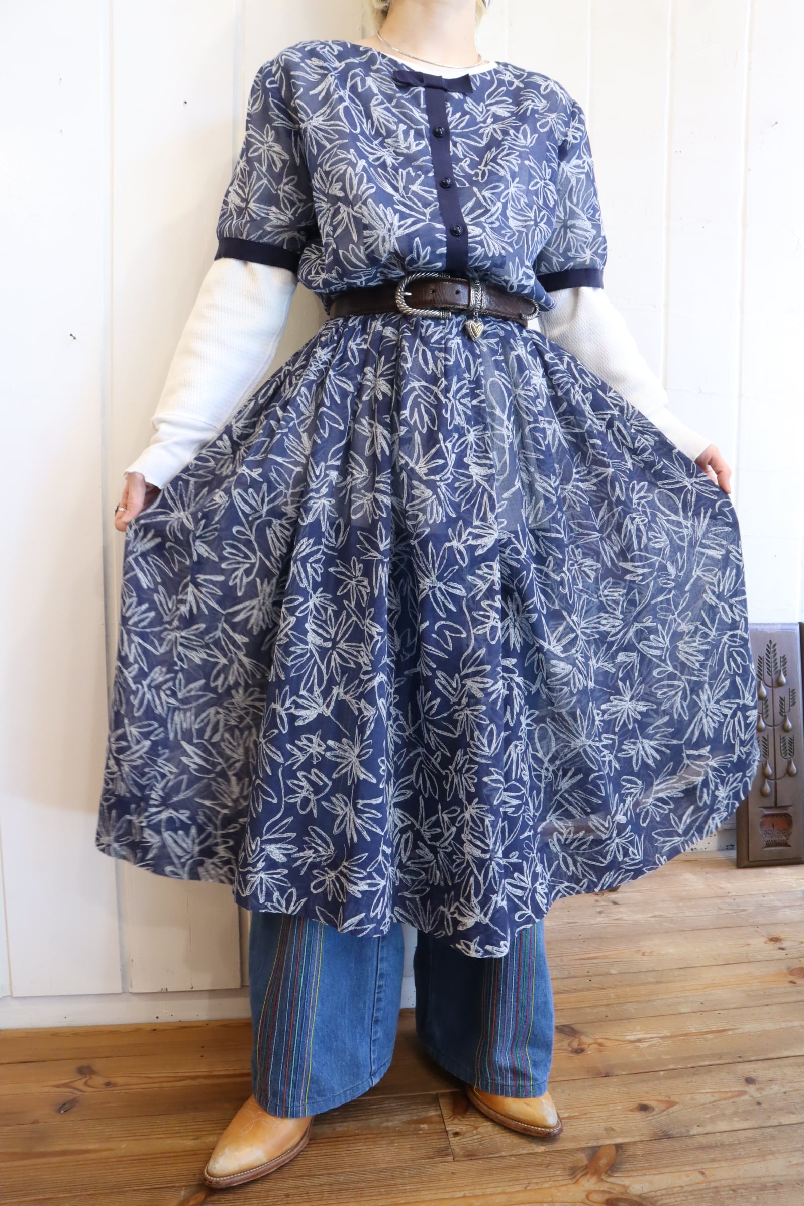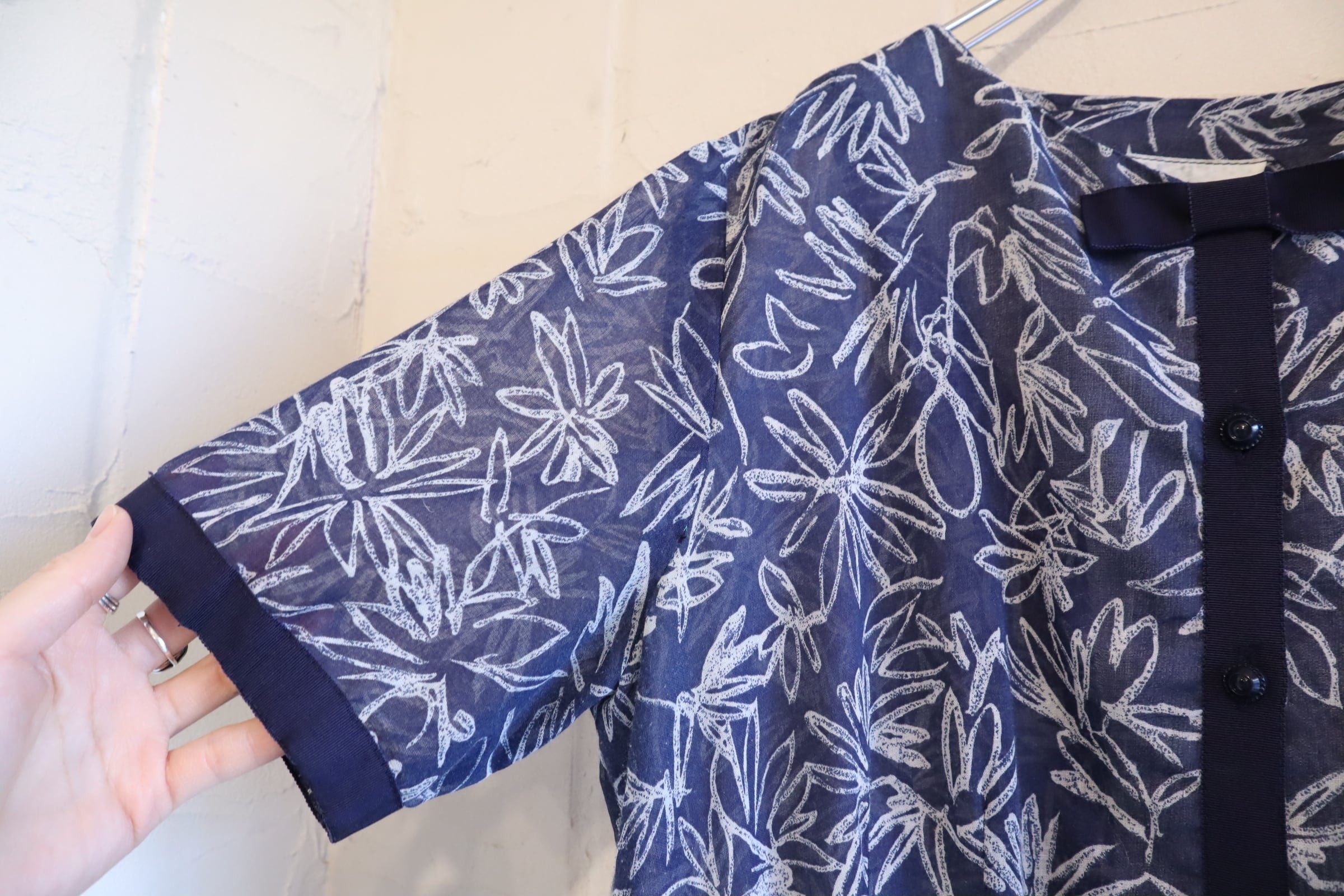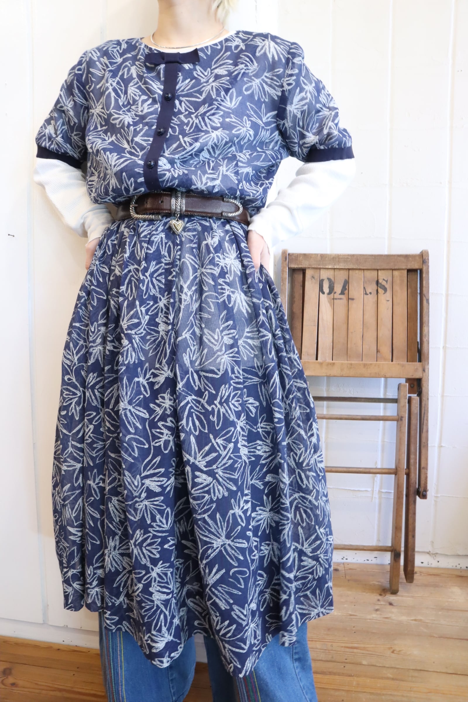 50s-60s navy×white flower print see-through dress [l-4901]