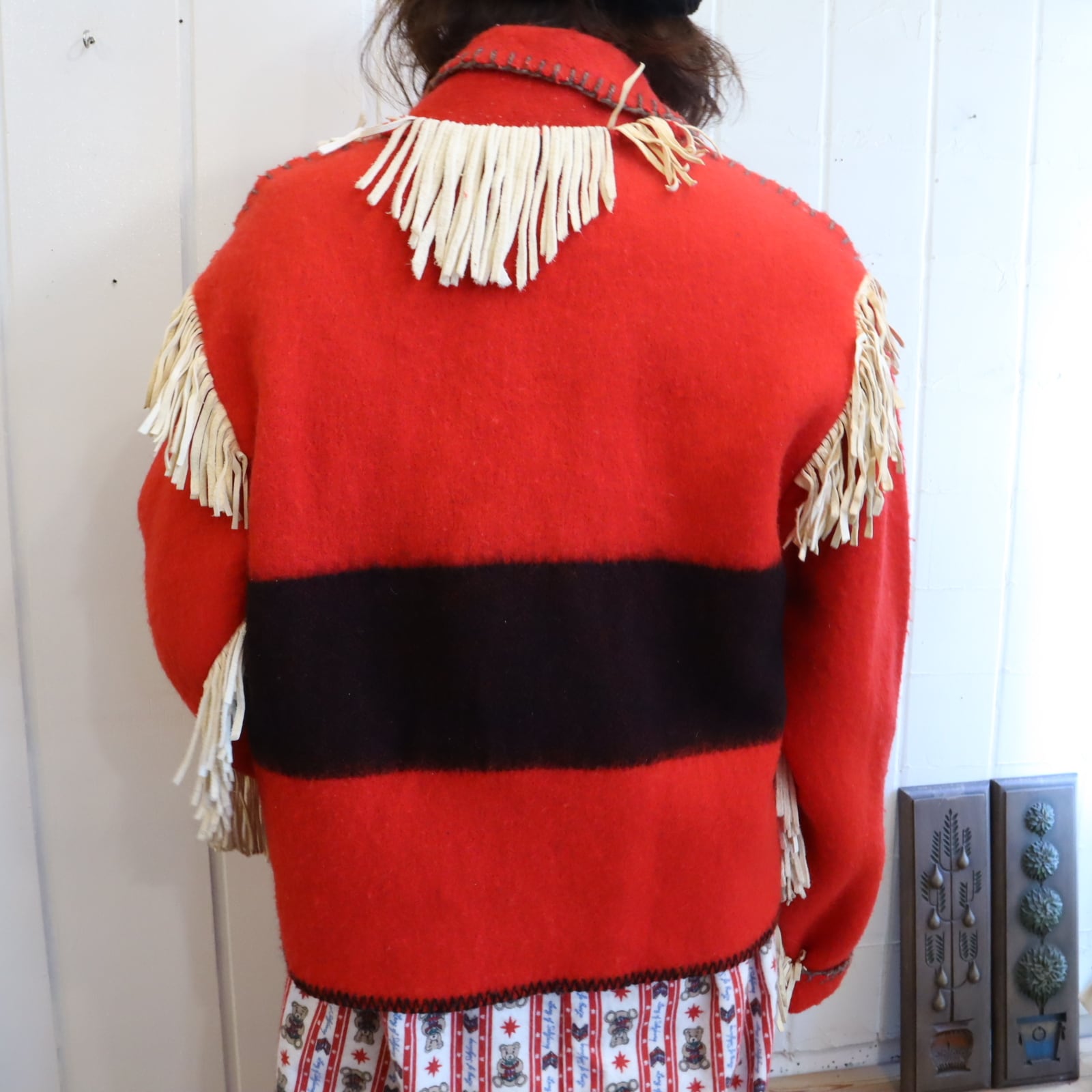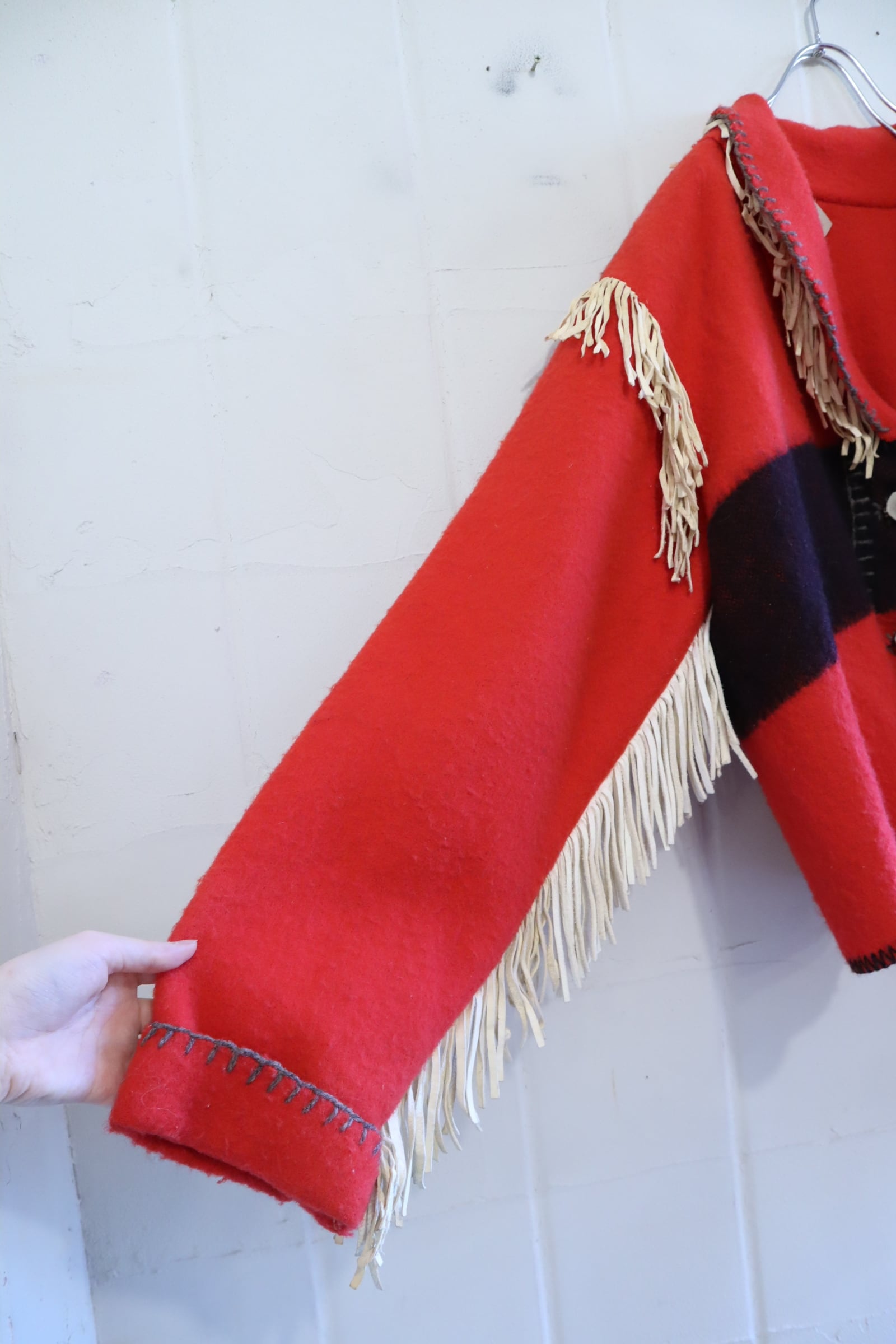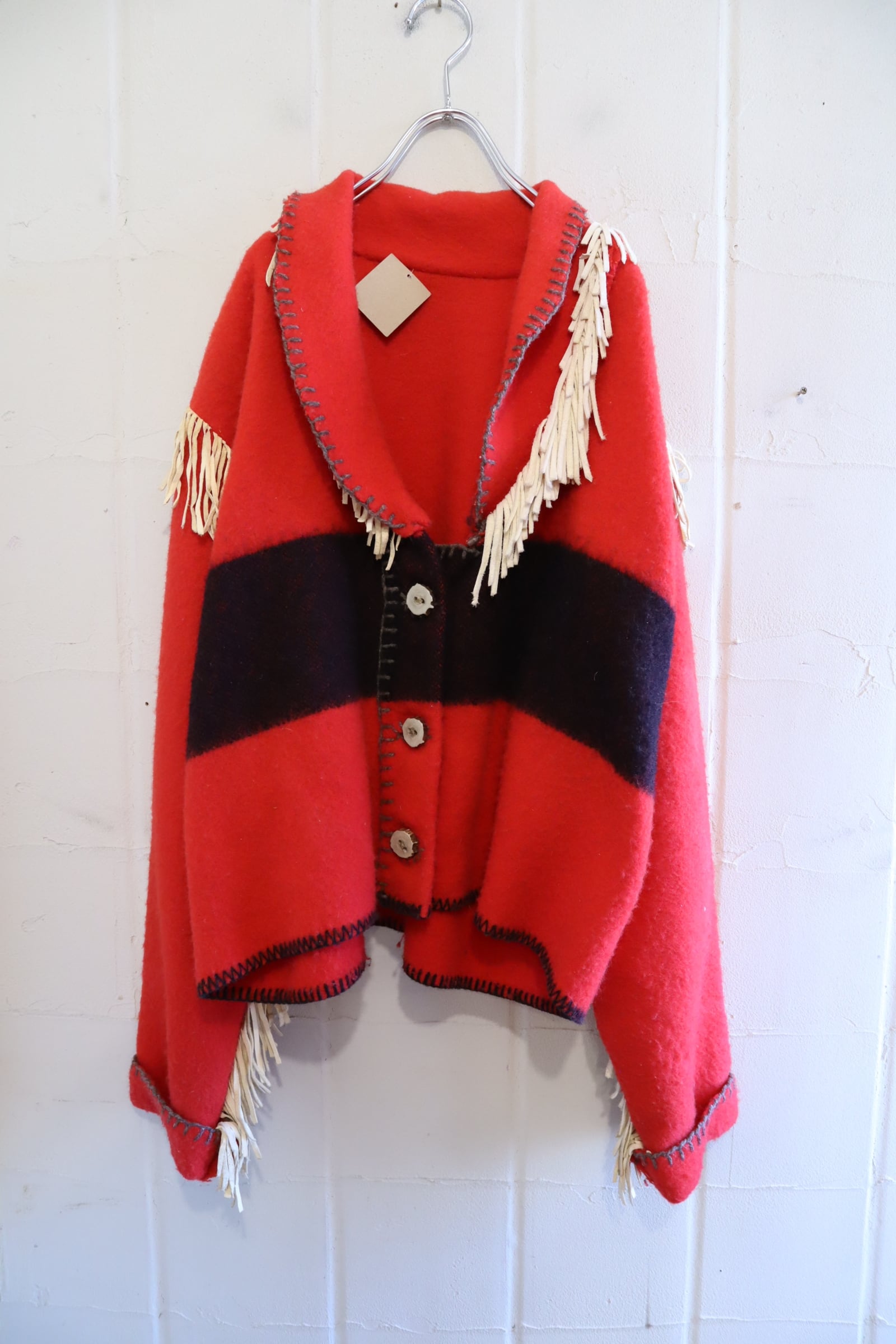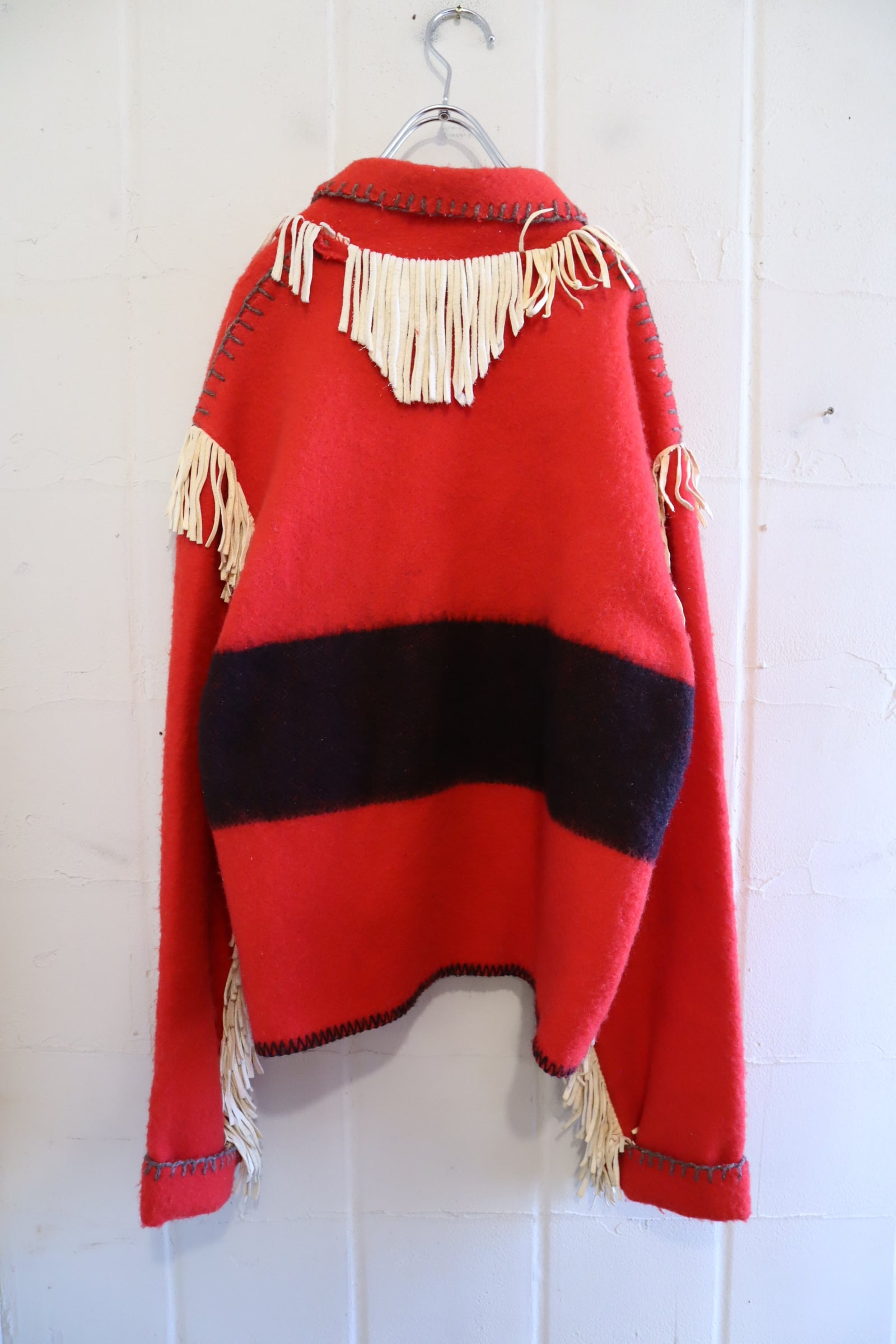 また素材特有の毛羽立ち、ステッチのホツレ、襟後ろにフリンジレザーから付着したと思われる細かい白い汚れがございますが、いずれも古着の味として着ていただけるかと思います。