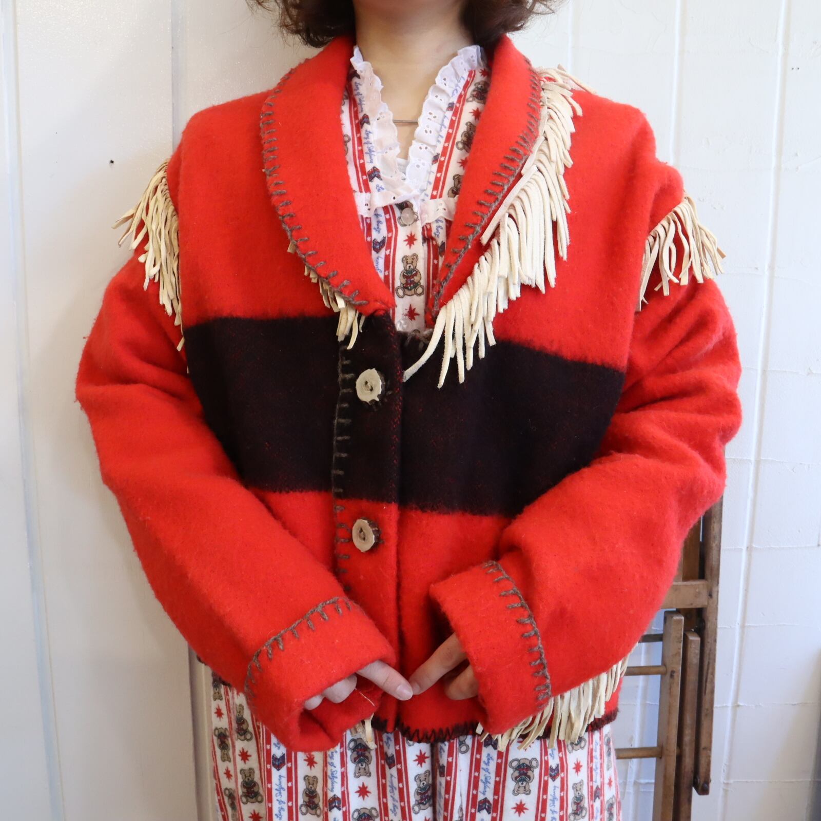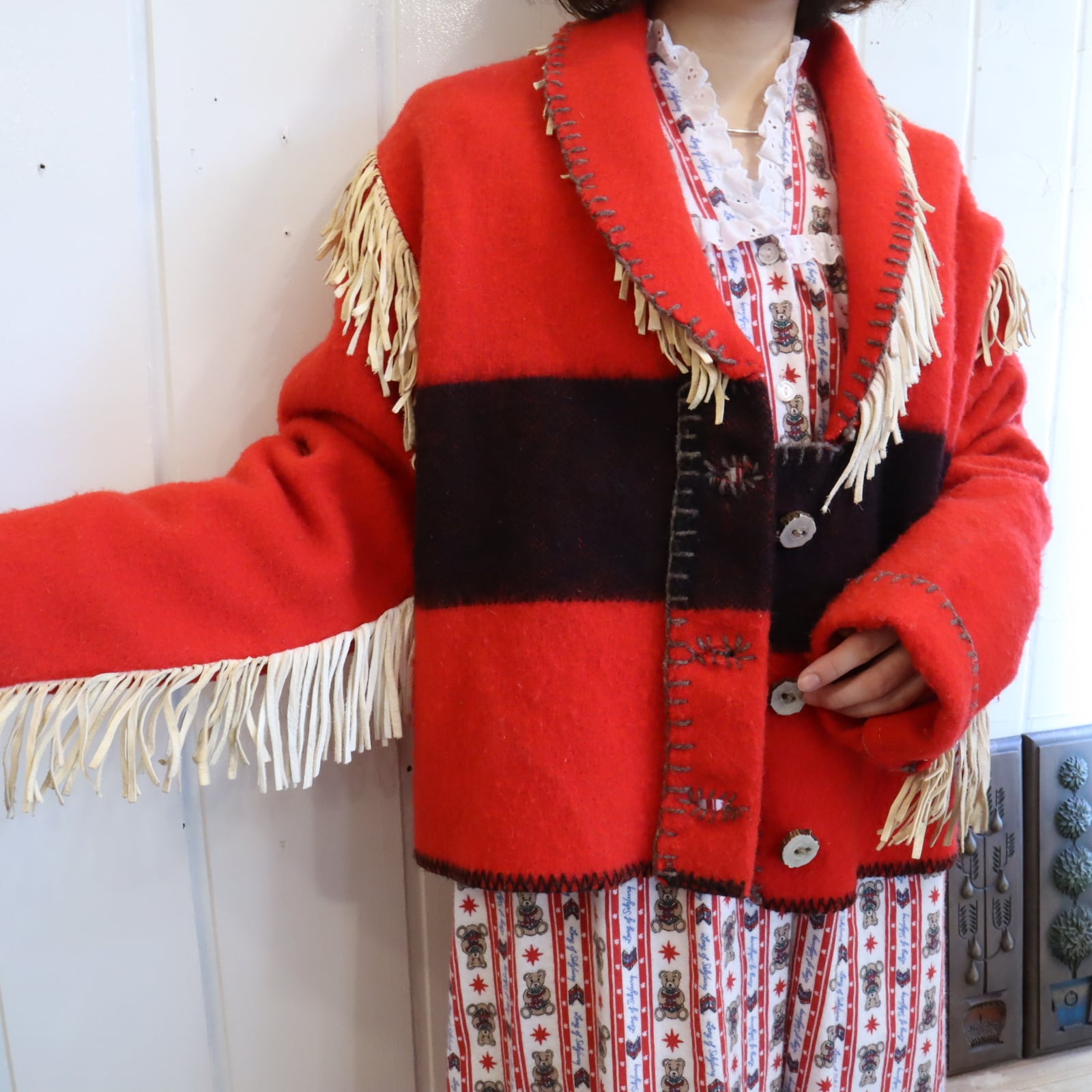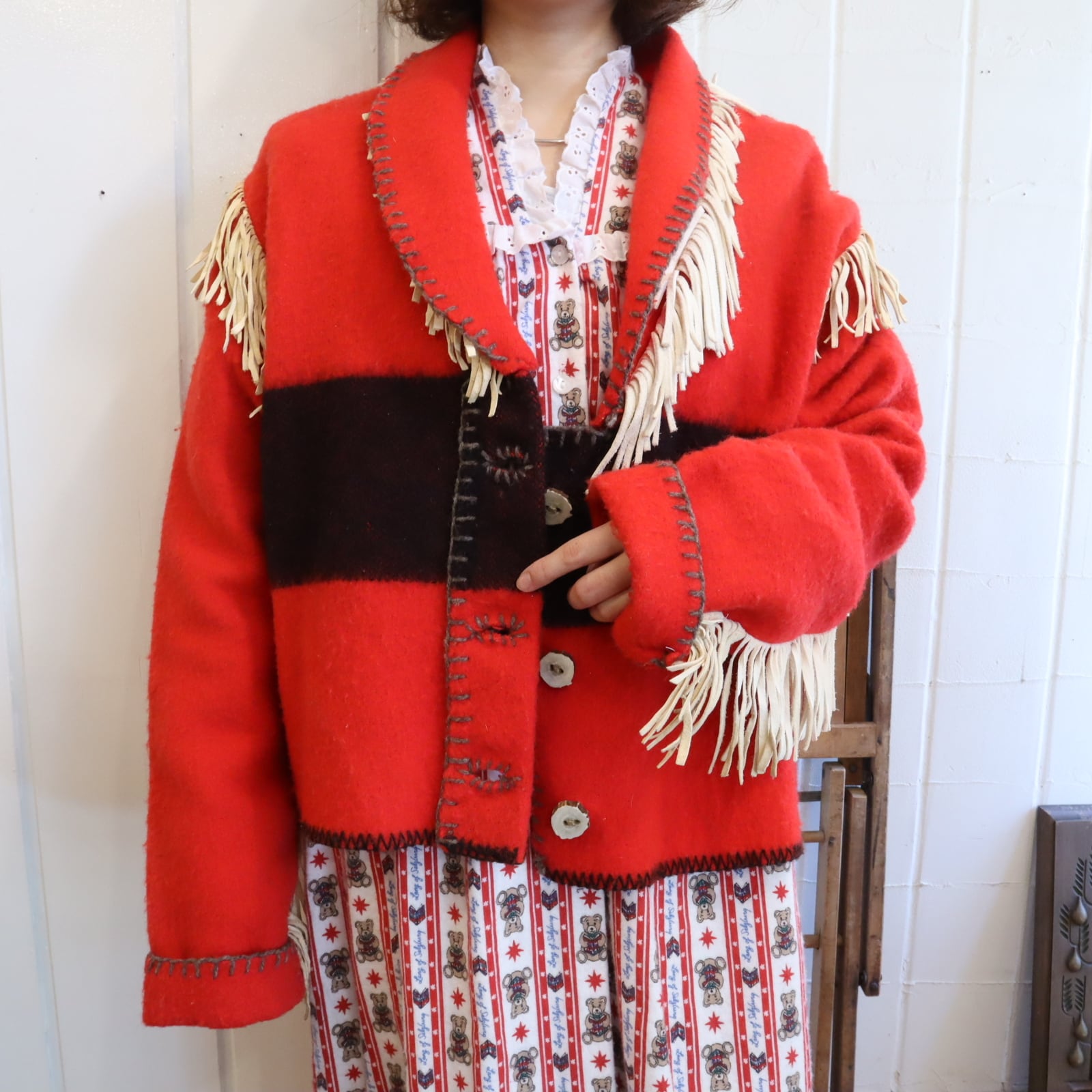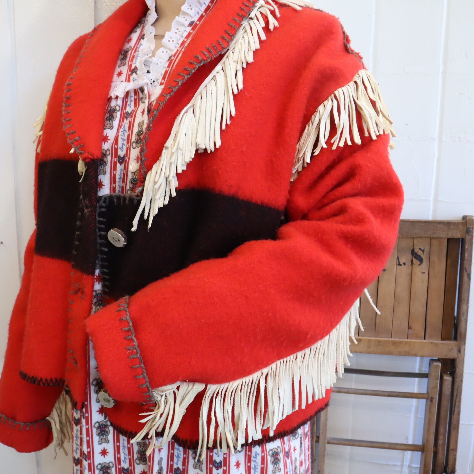 片側の襟からフリンジが見えていなかったり...ちぐはぐなところも味があります。
