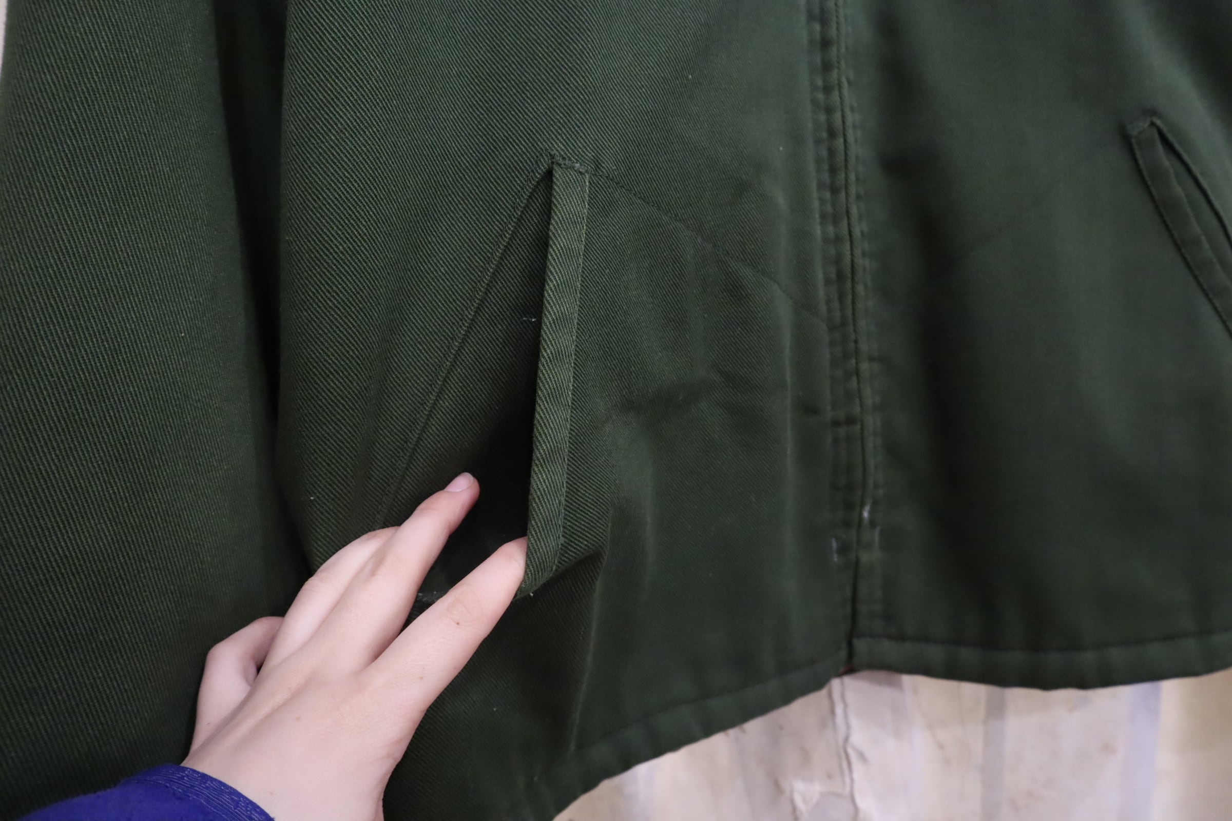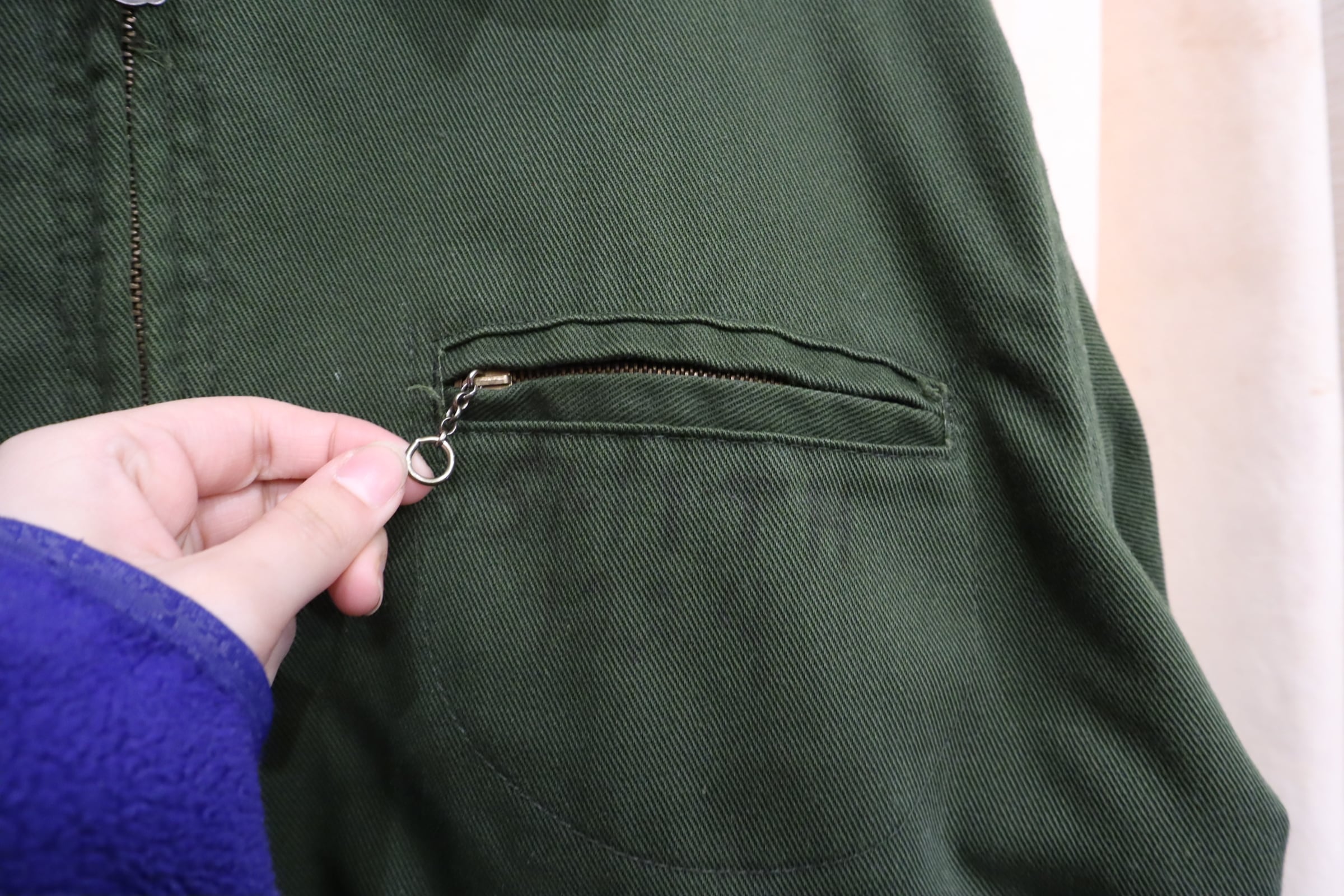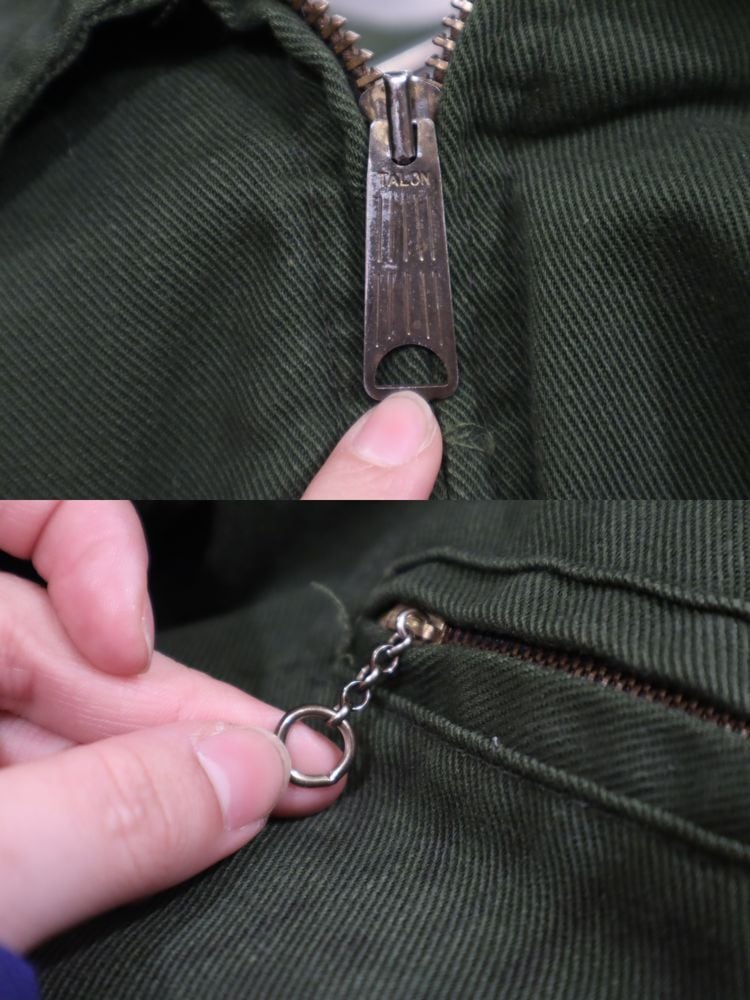 また表地にいくつか小さなペンキ汚れ、胸ポケット下に名前と思われるペイント、袖リブに一部破れがございますが、いずれも古着の味として着て頂けるかと思います。