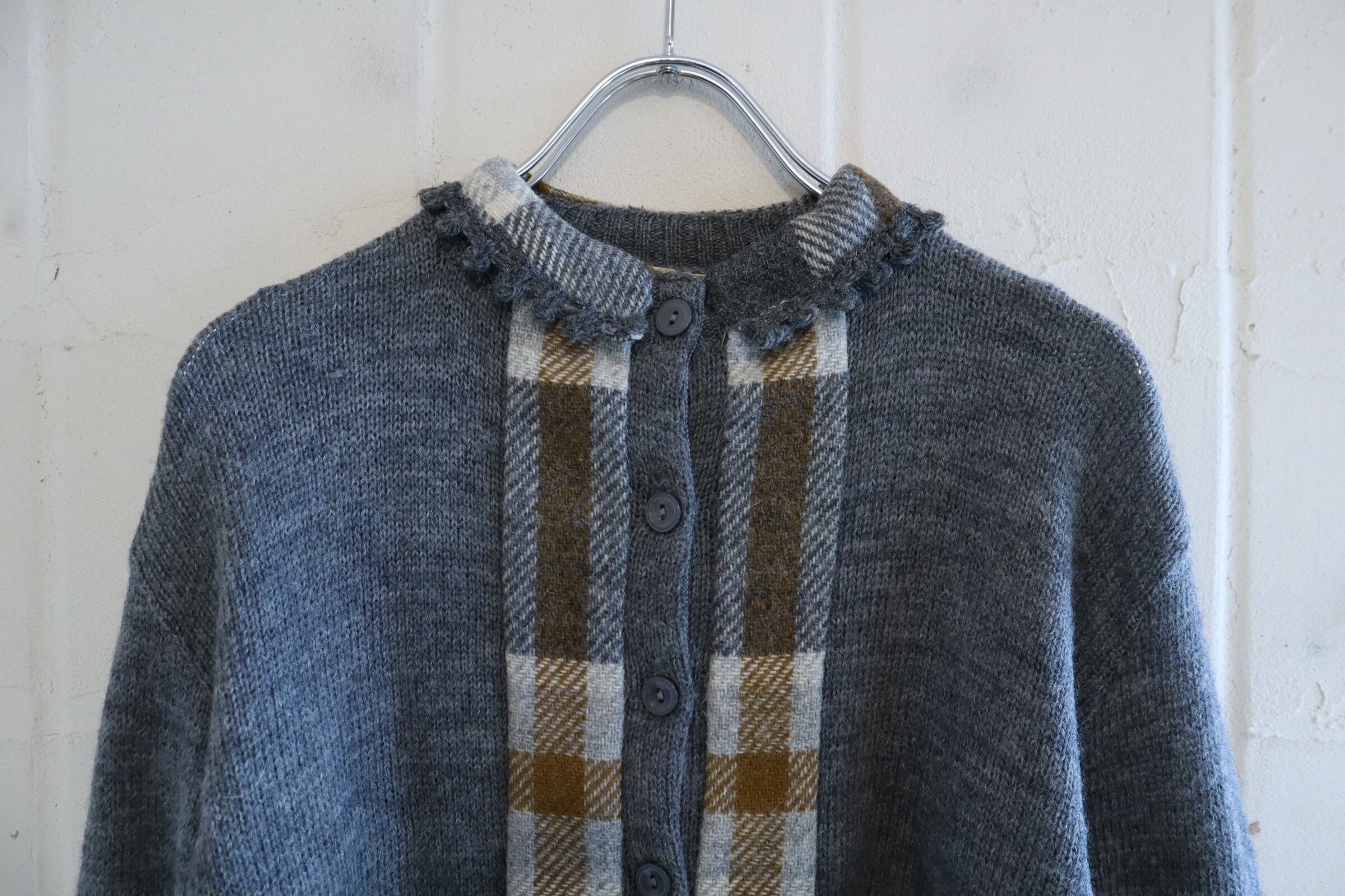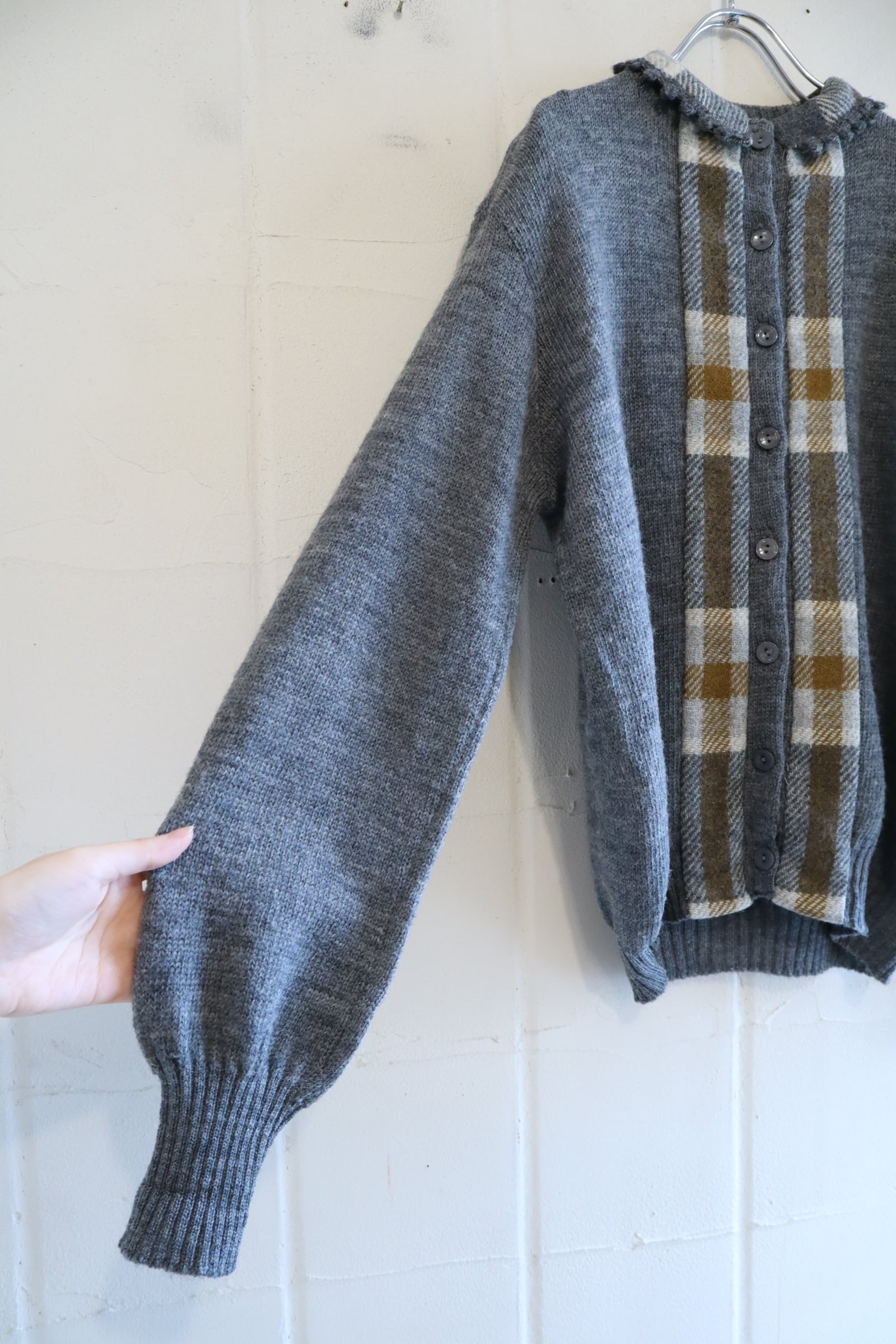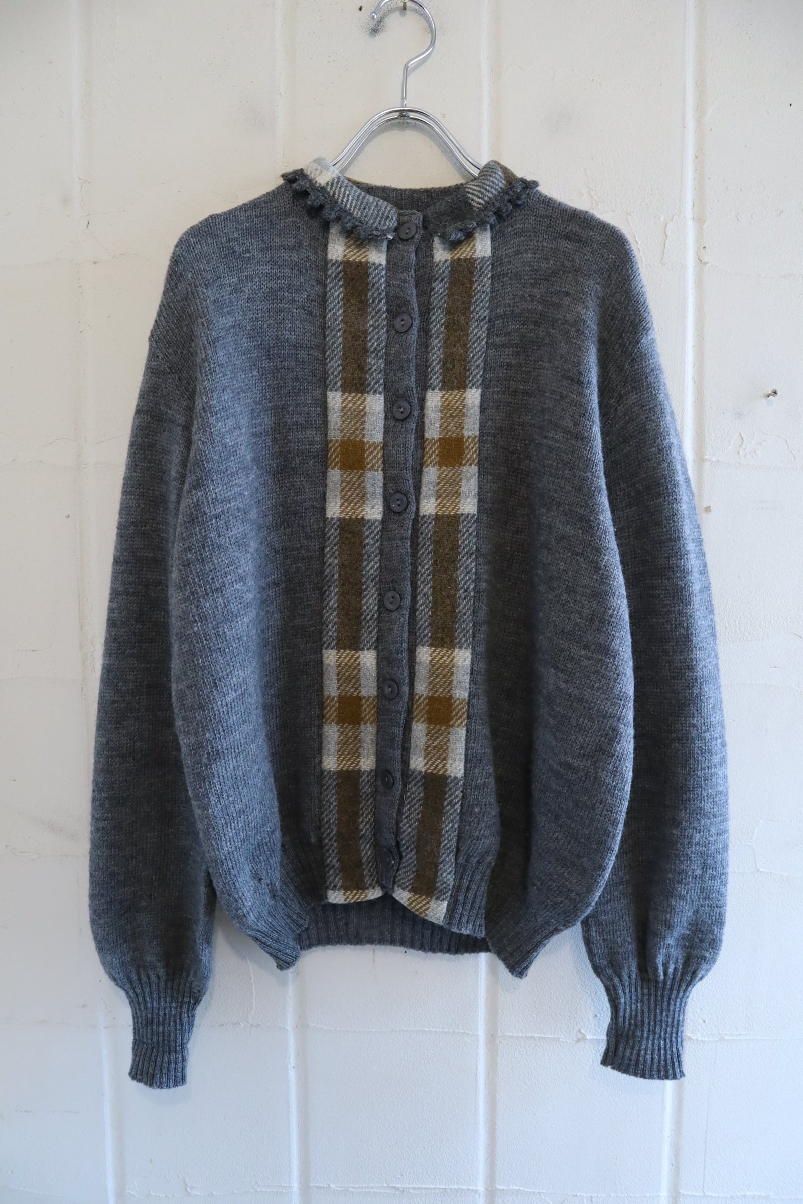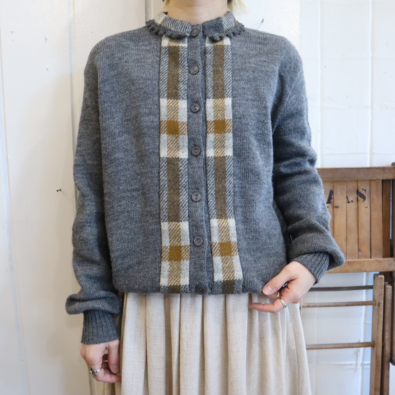 50s-60s gray×brown plain & plaid knit cardigan [l-4937]