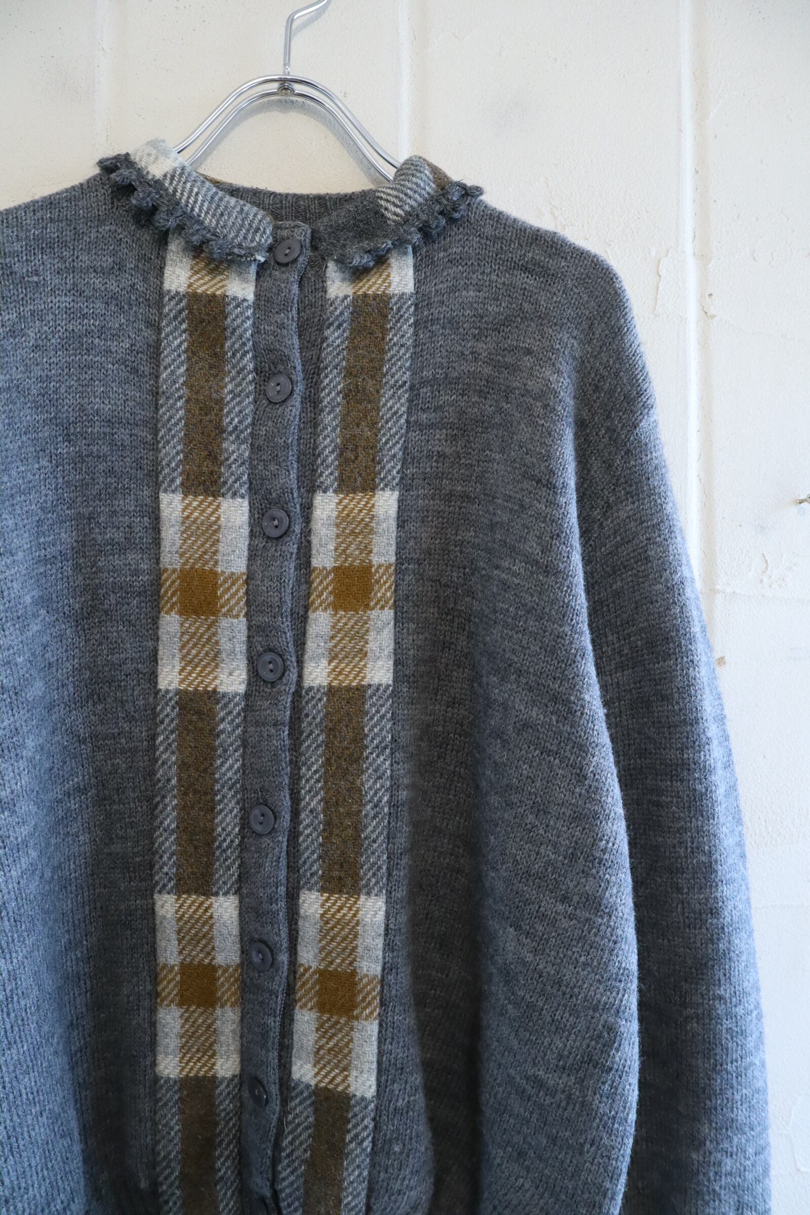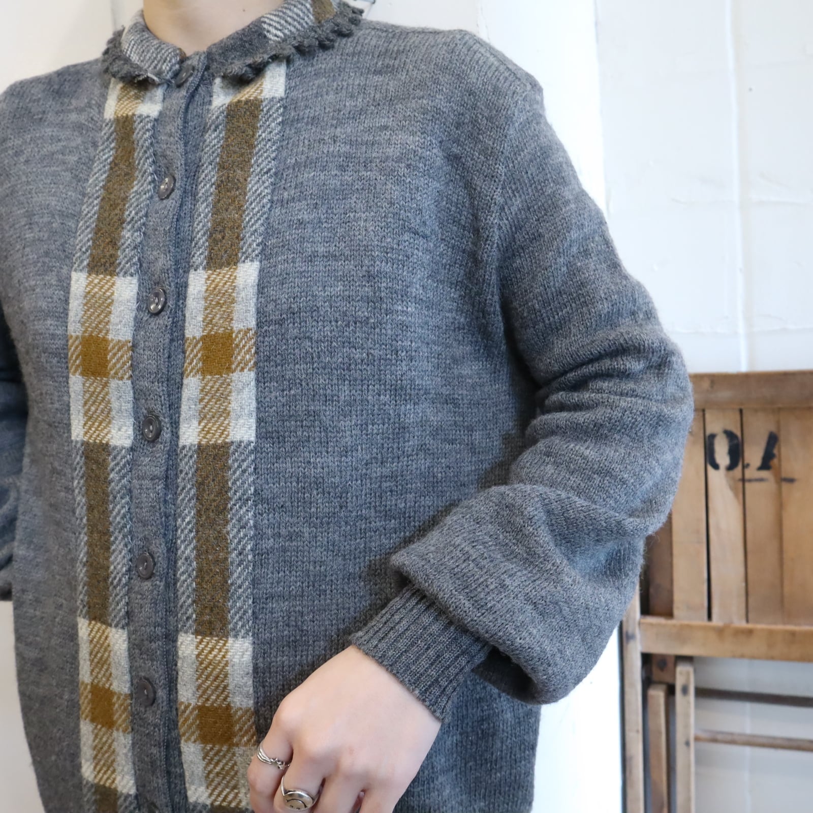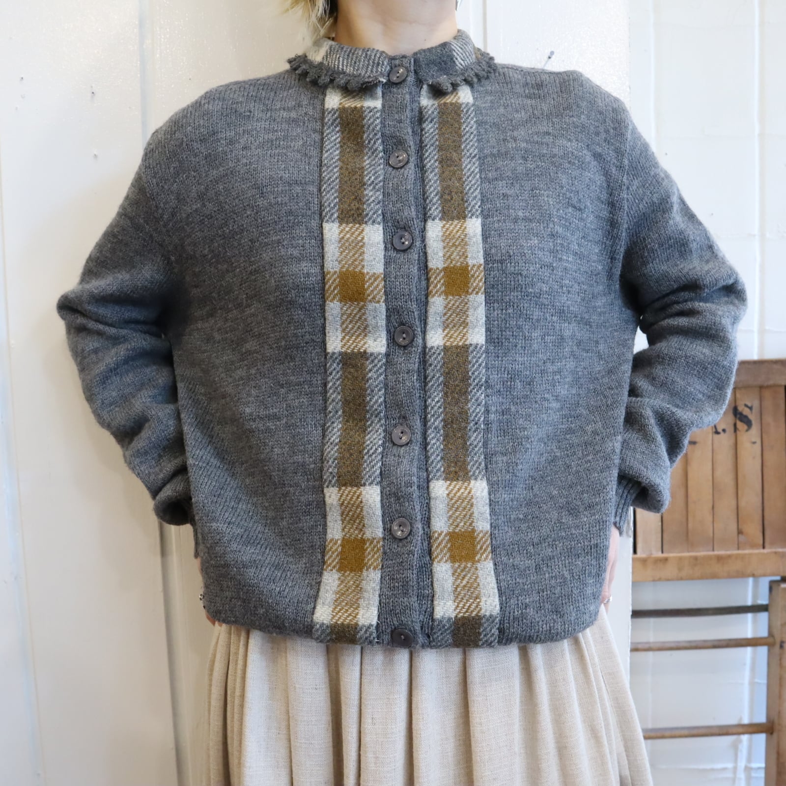 50s-60s gray×brown plain & plaid knit cardigan [l-4937]