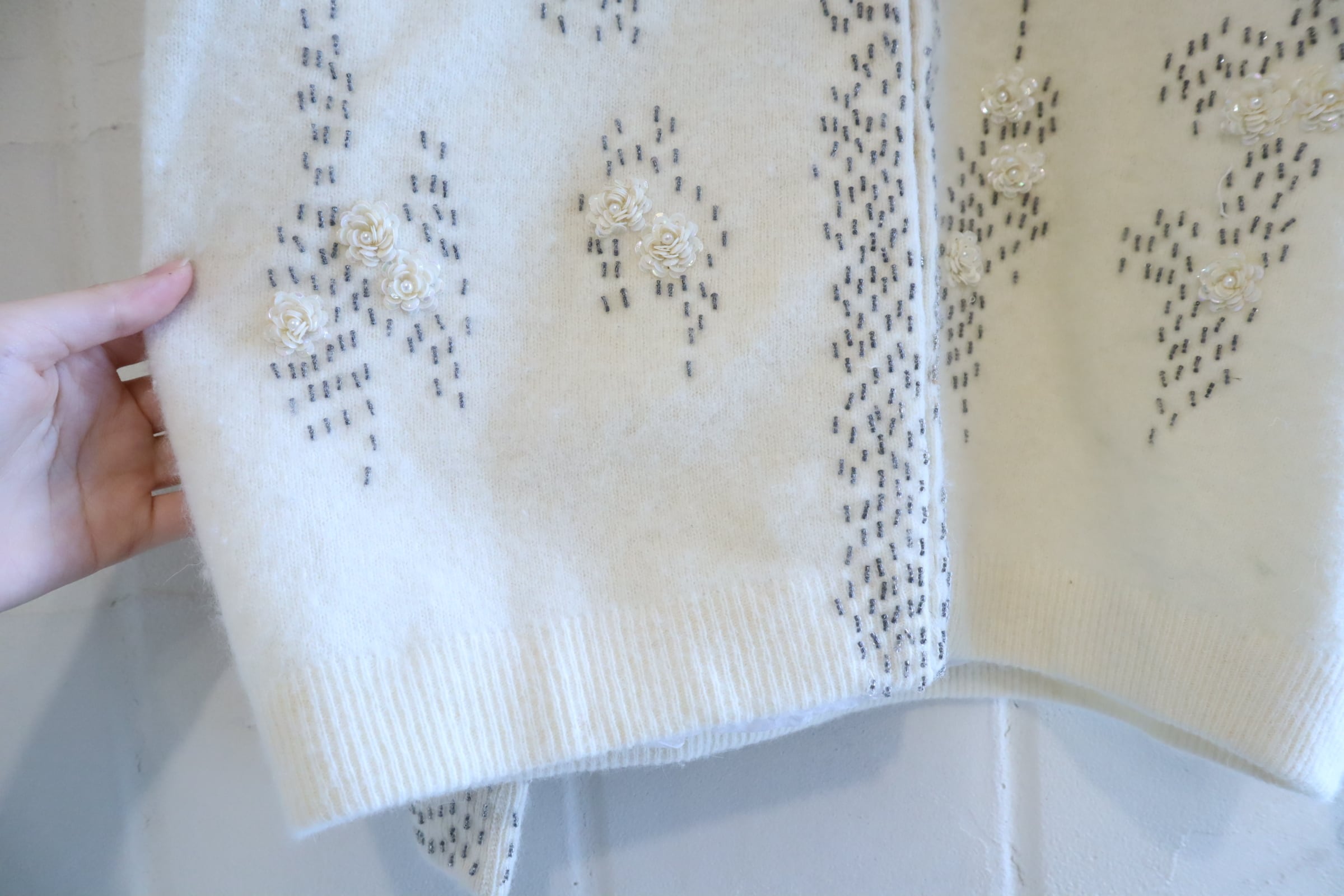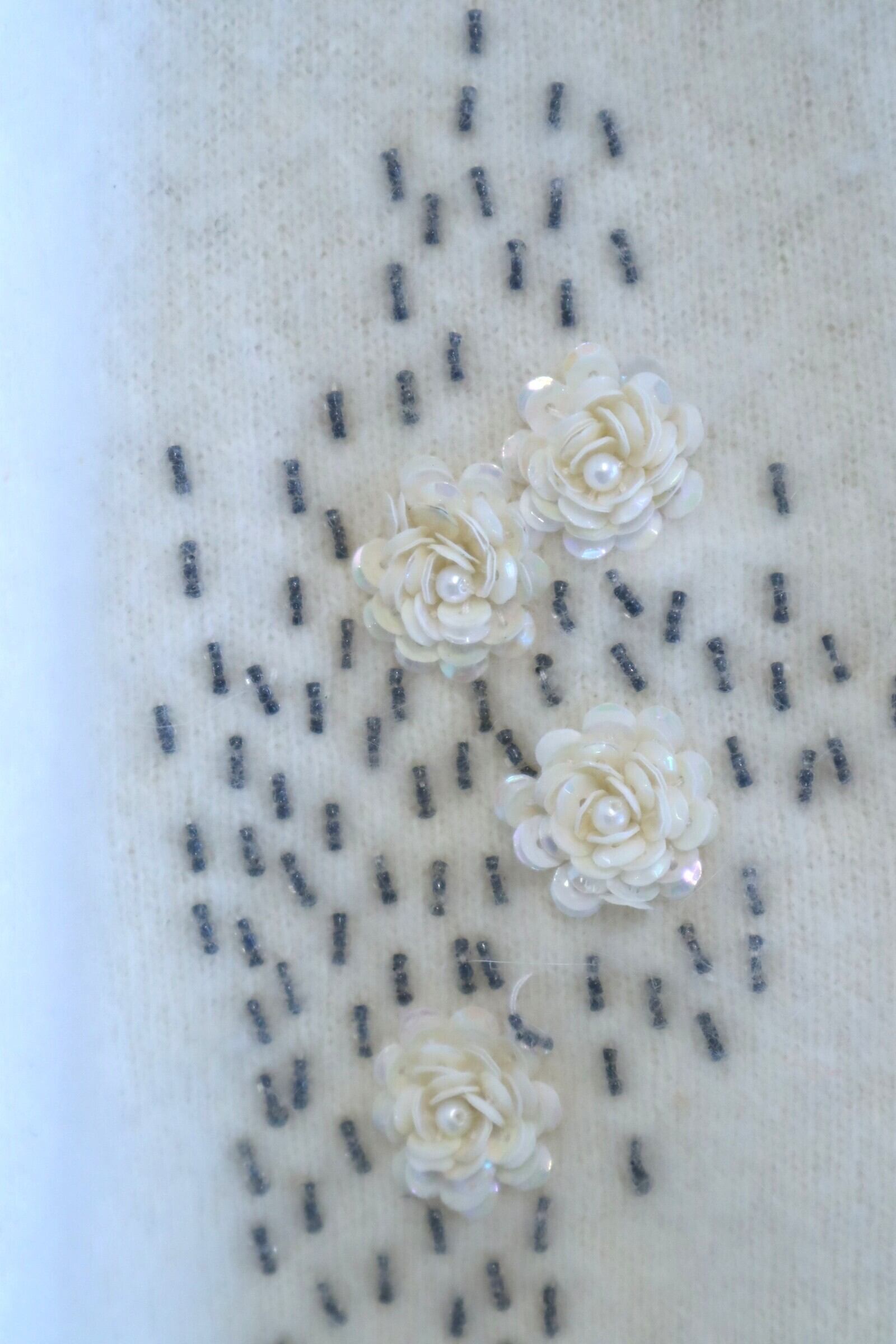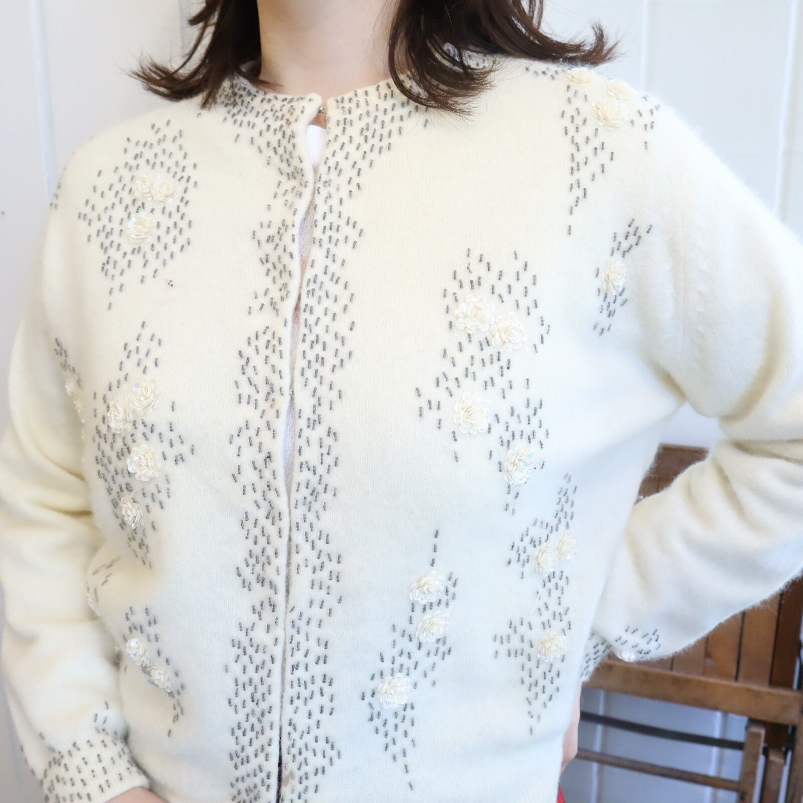 スパンコールで丁寧に作られたバラのお花が可愛いヴィンテージニットカーディガン。