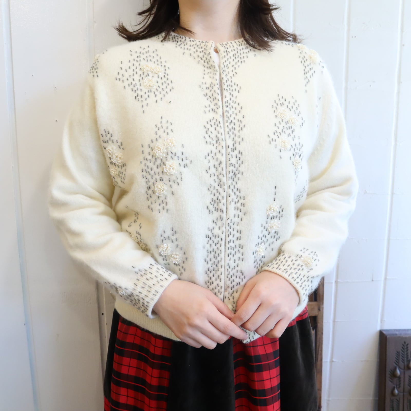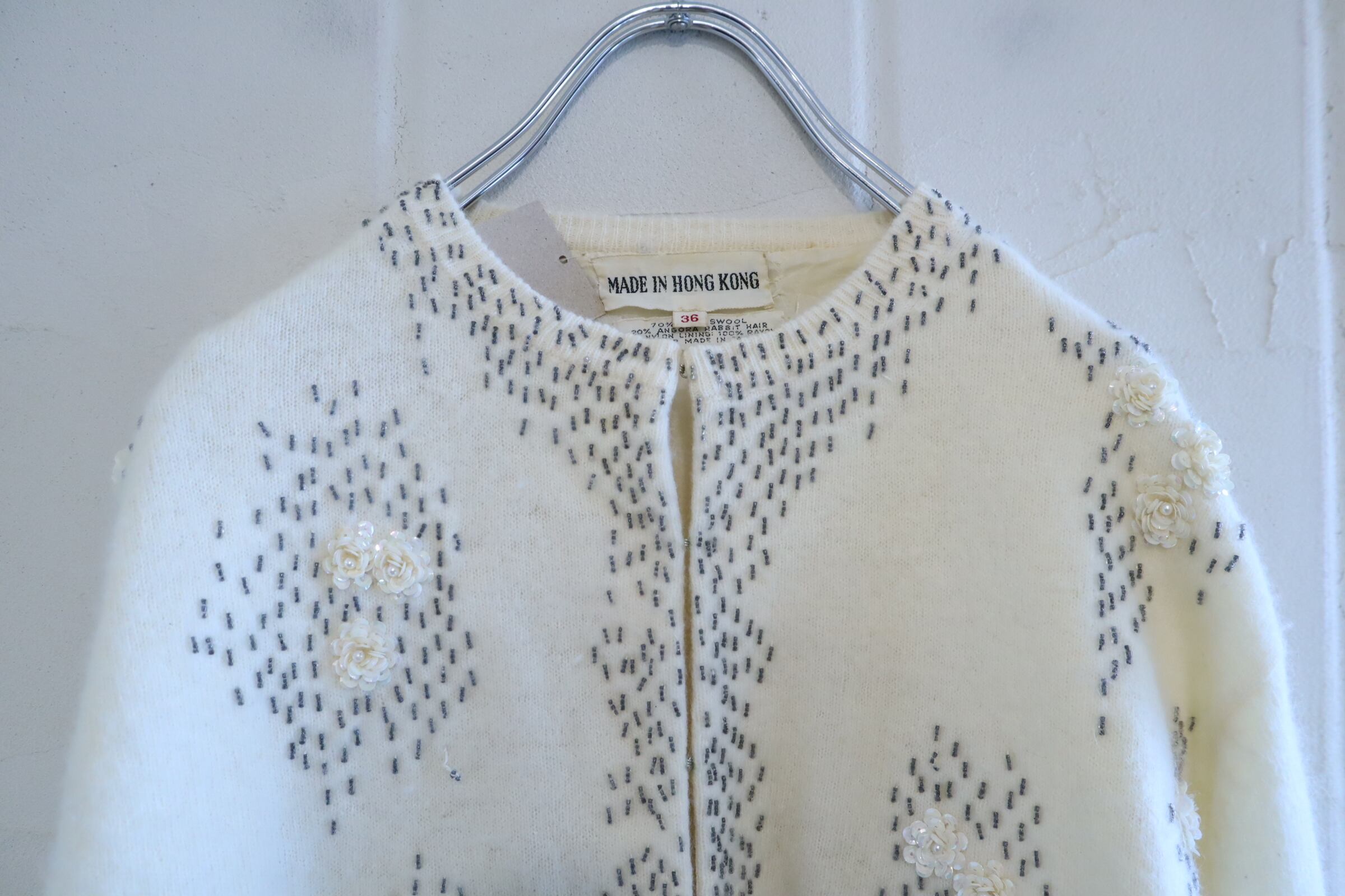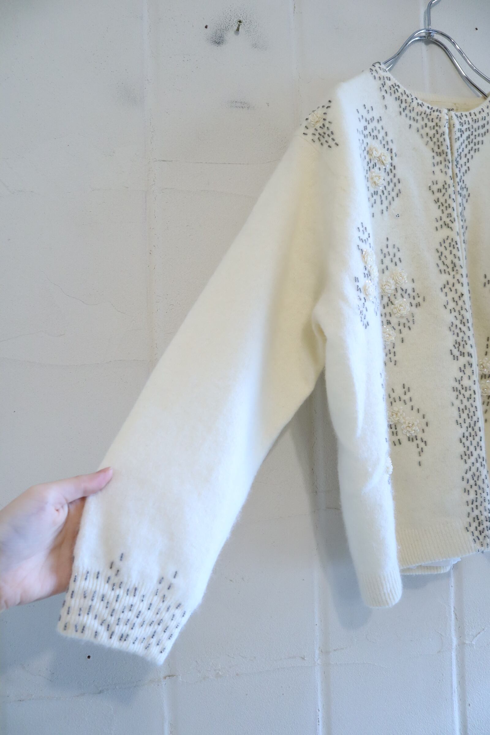 60s ivory×gray beads embroidery knit cardigan [l-4939]