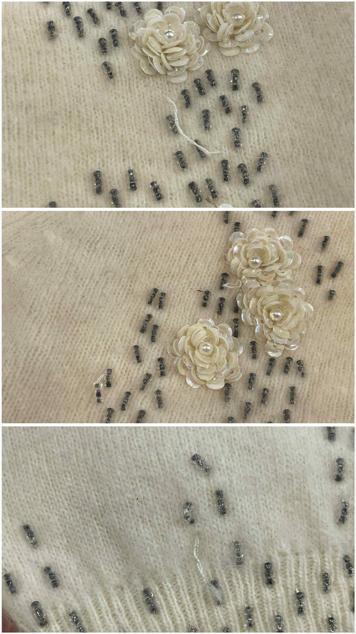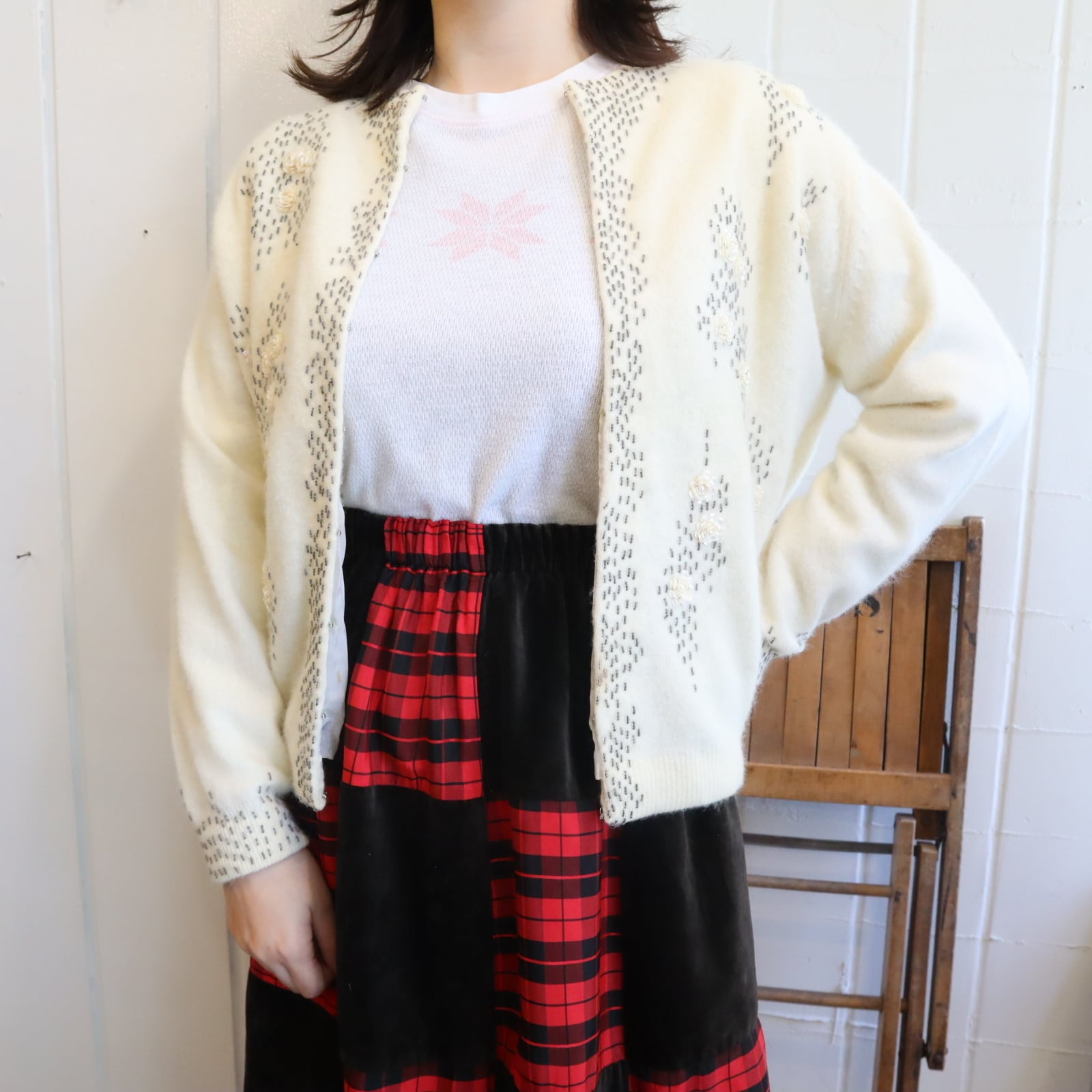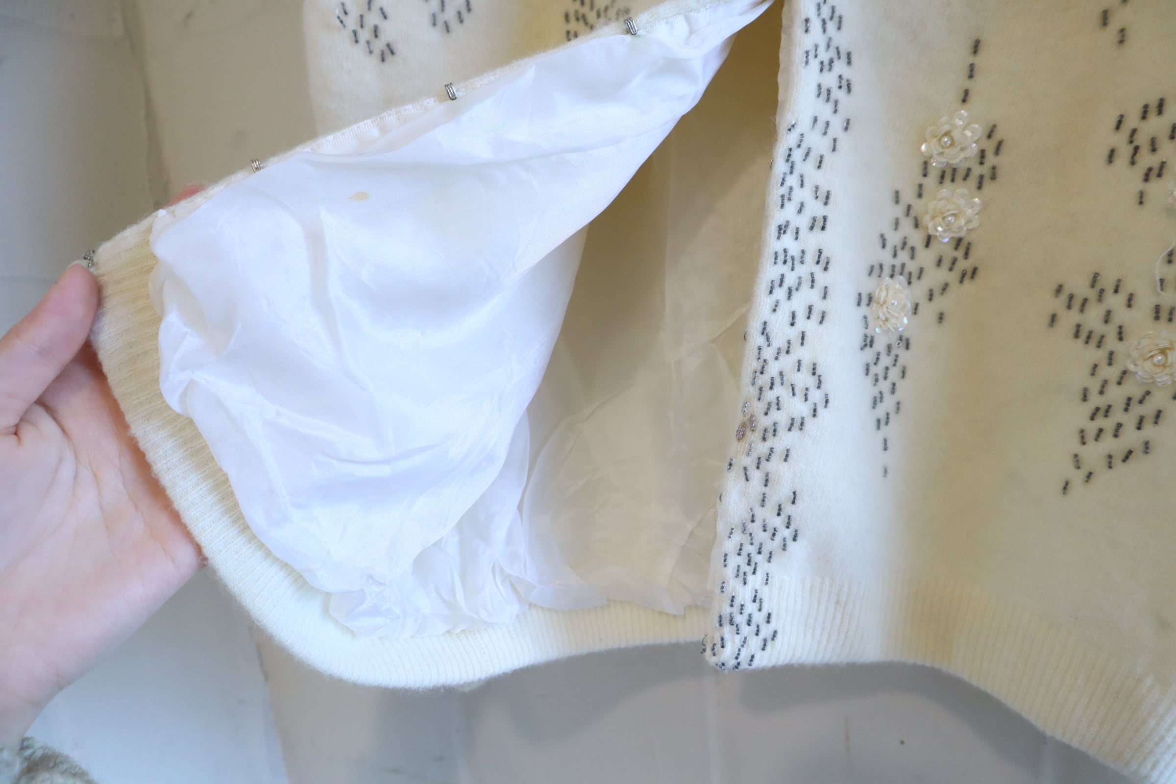 60s ivory×gray beads embroidery knit cardigan [l-4939]