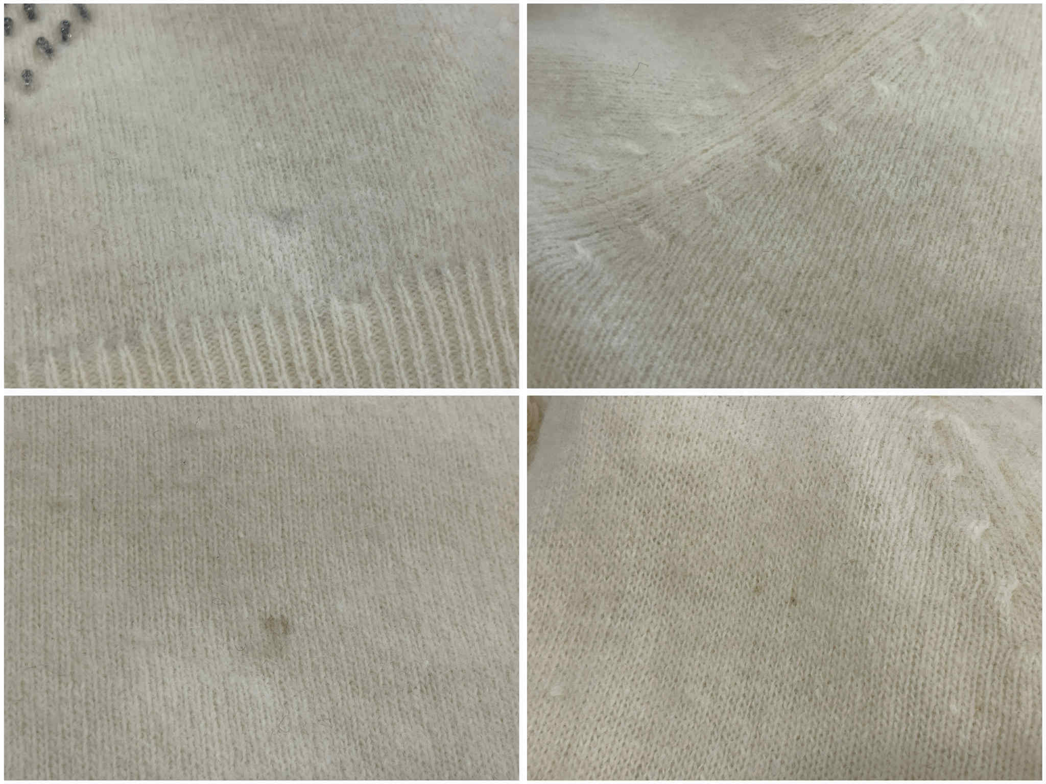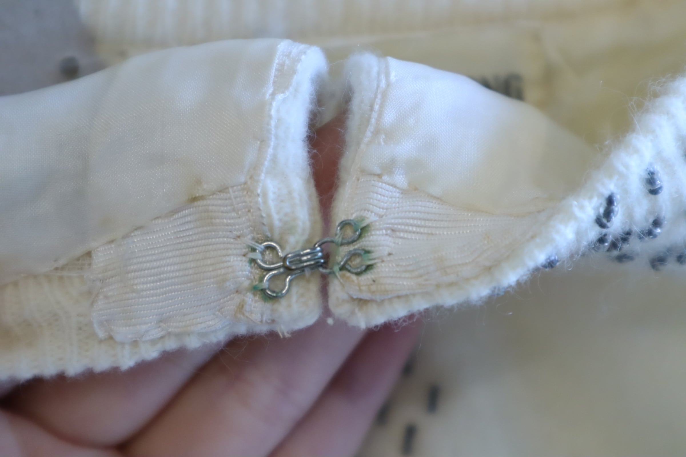 またボディに所々シミや汚れ、いくつかビーズ刺繍にホツレが見受けられますが、こちらもあまり気にならない程度かと思います。