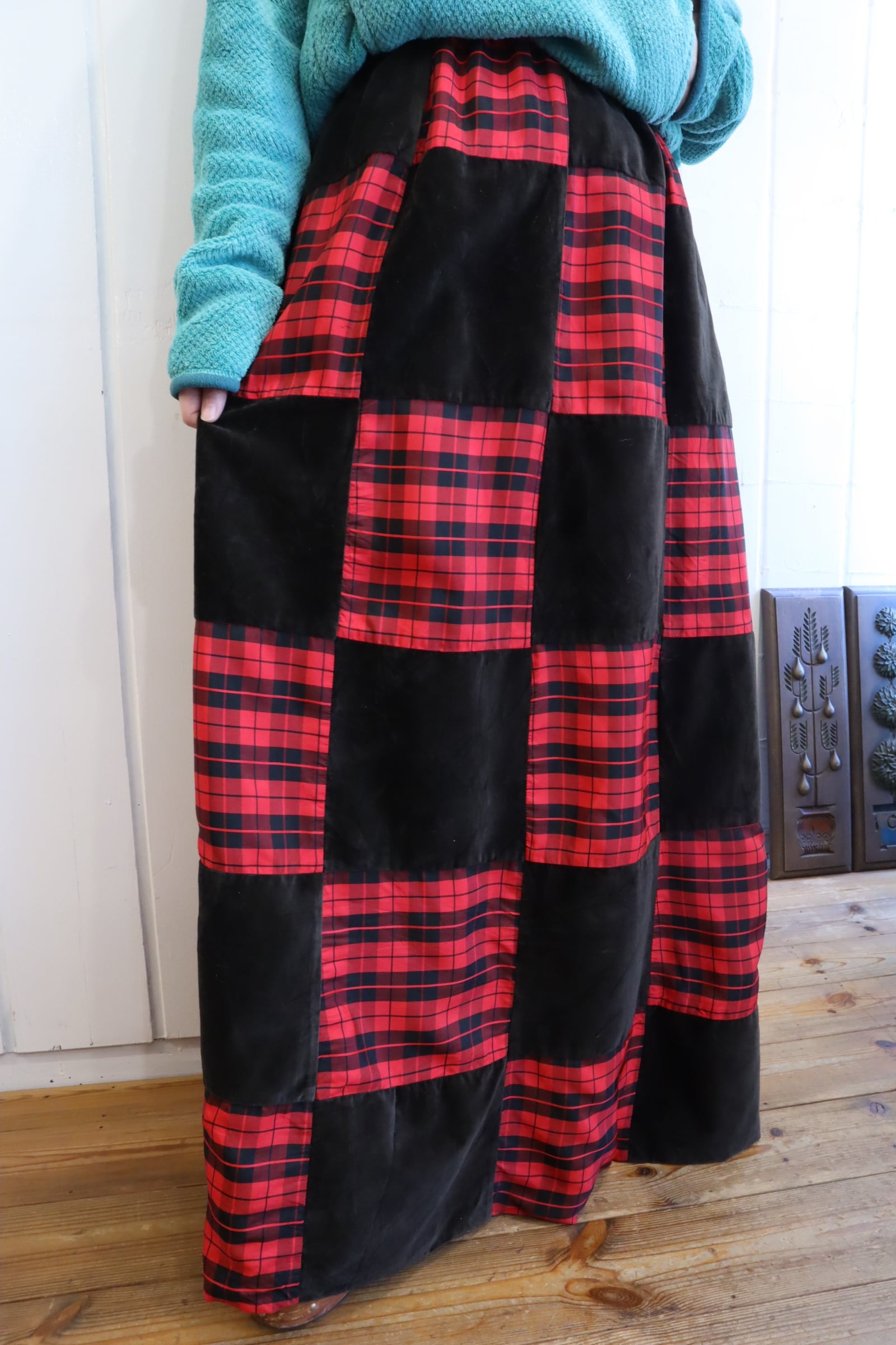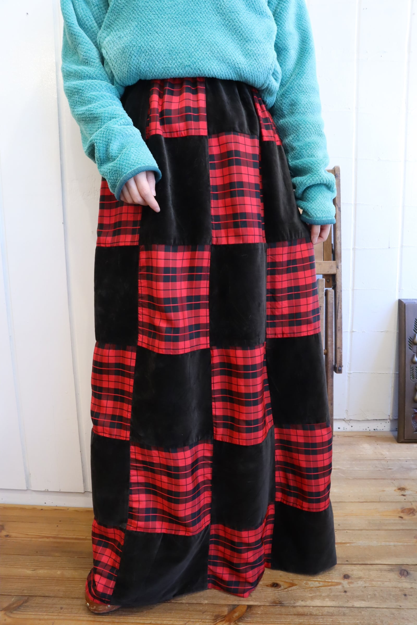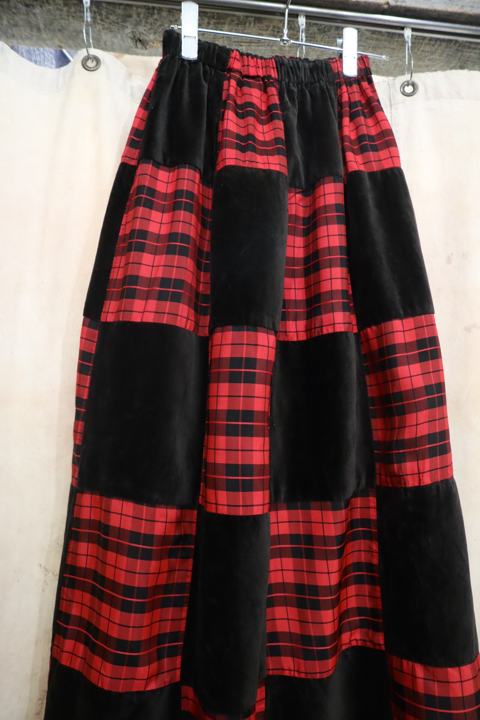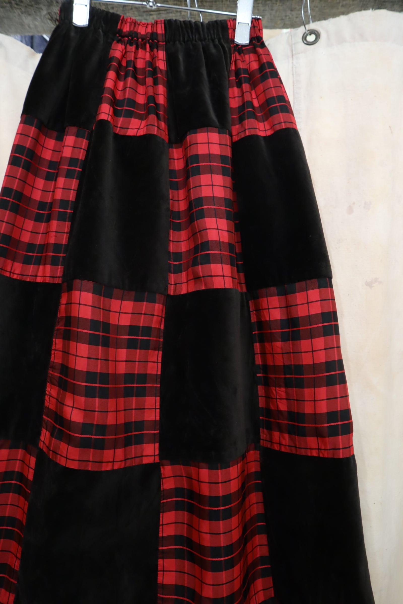 70s black×red plaid&velour patchwork skirt [l-4941]