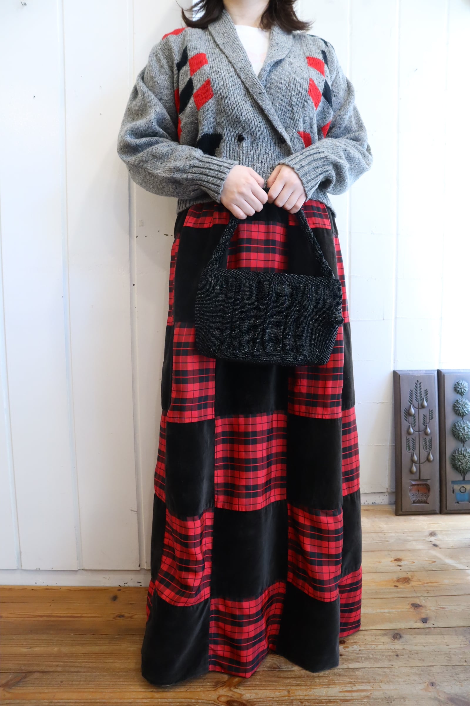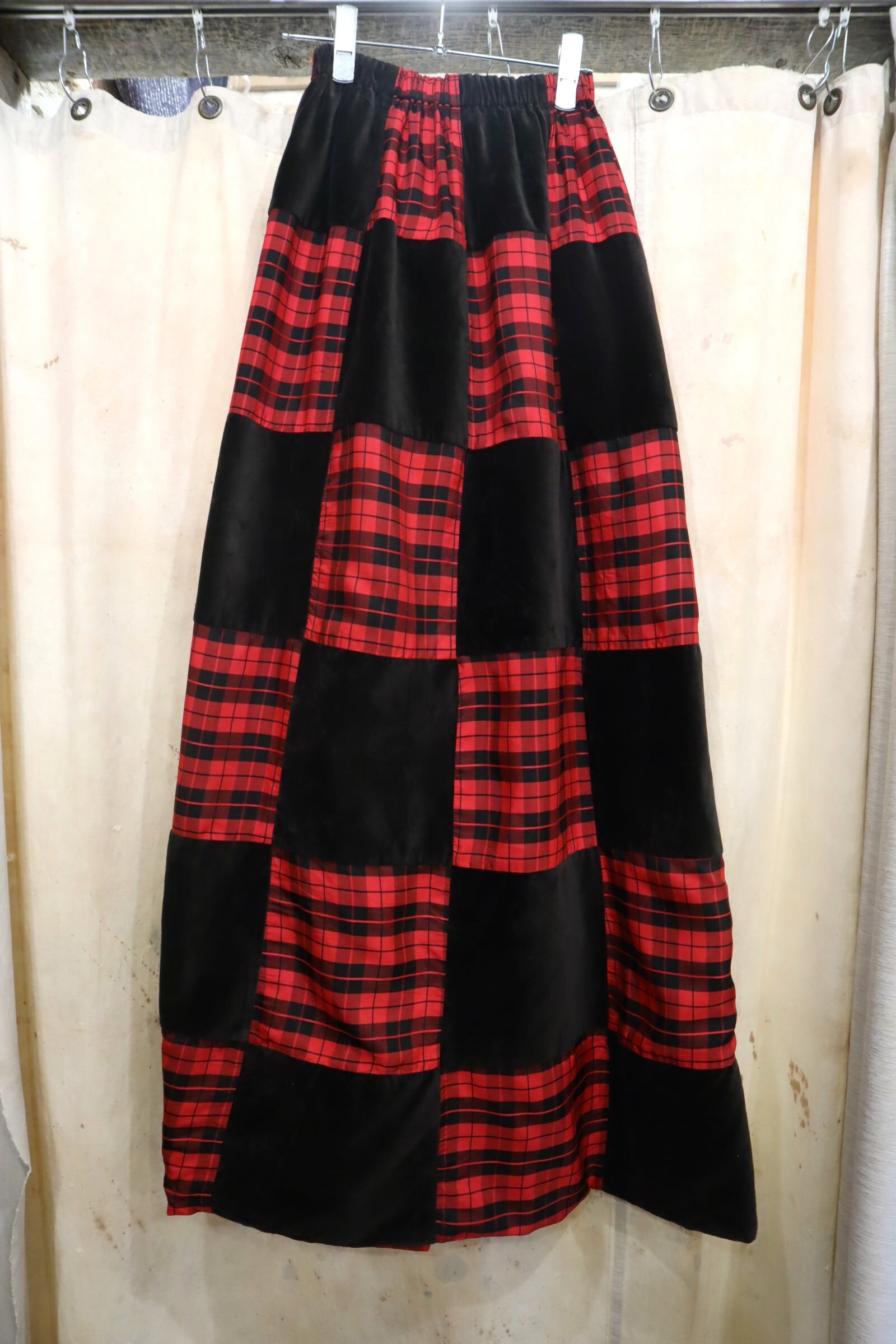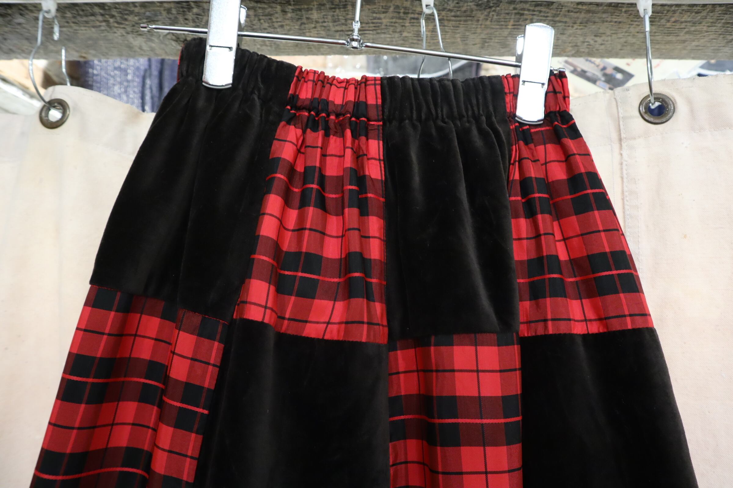 70s black×red plaid&velour patchwork skirt [l-4941]