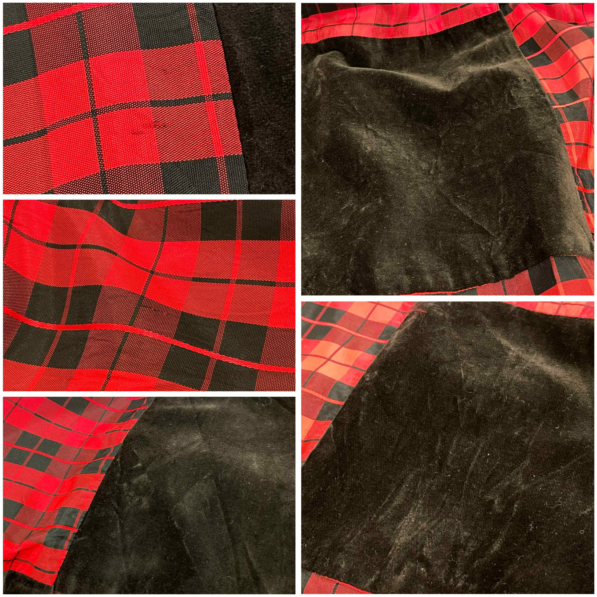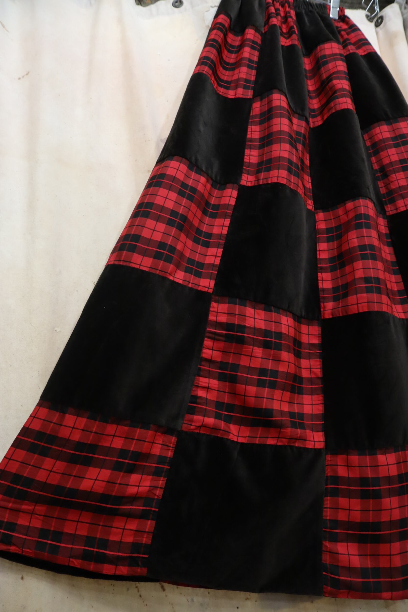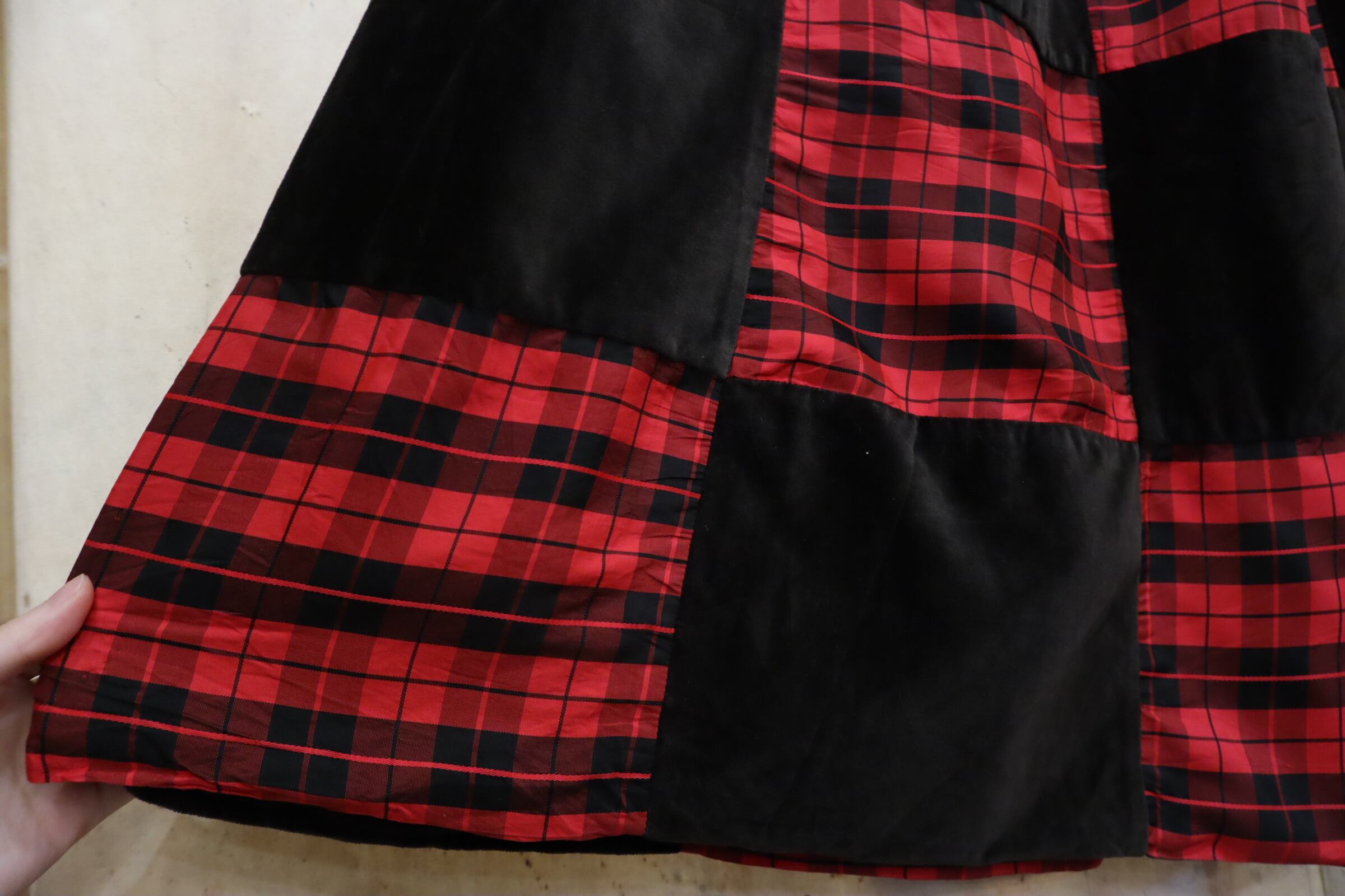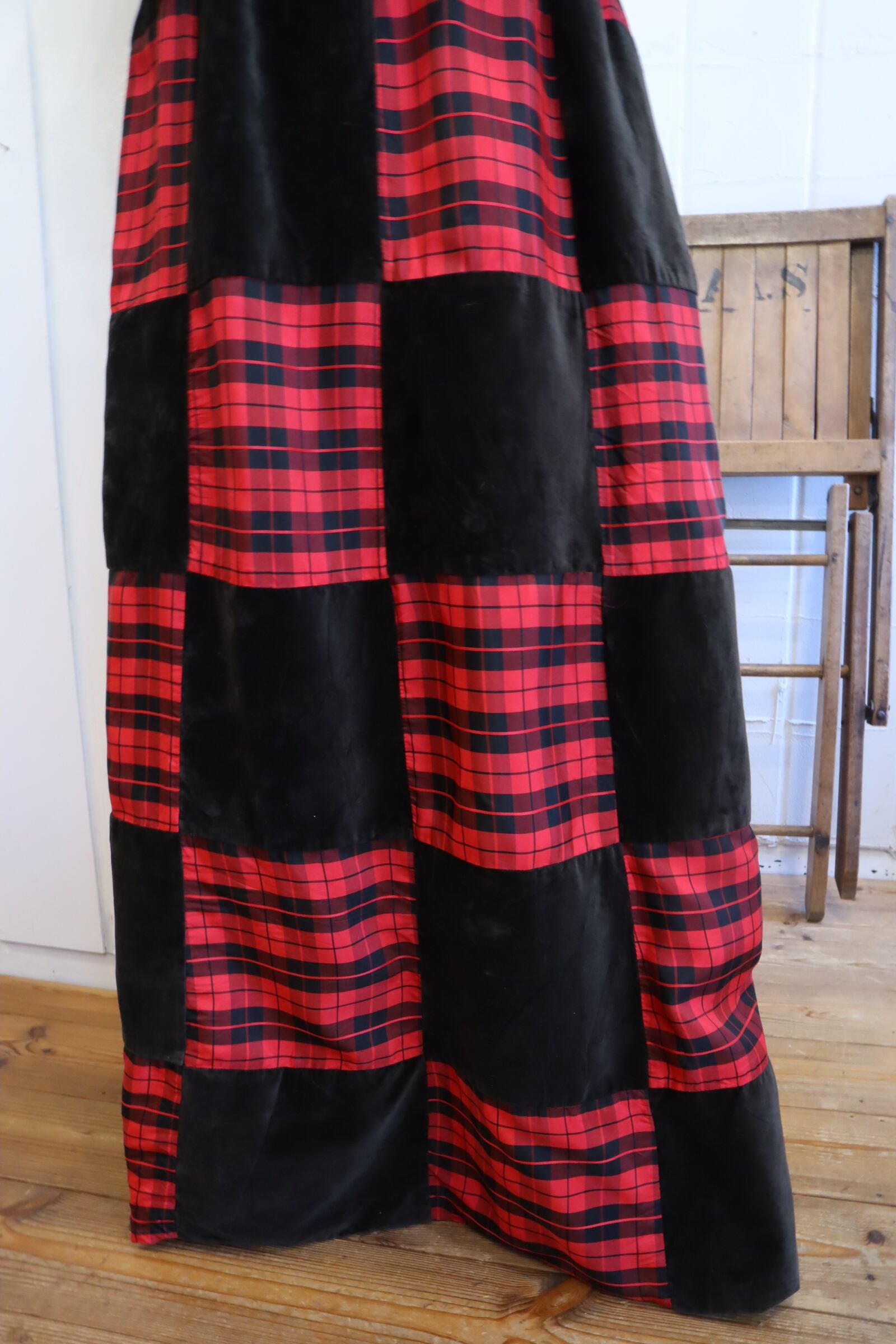 70s black×red plaid&velour patchwork skirt [l-4941]
