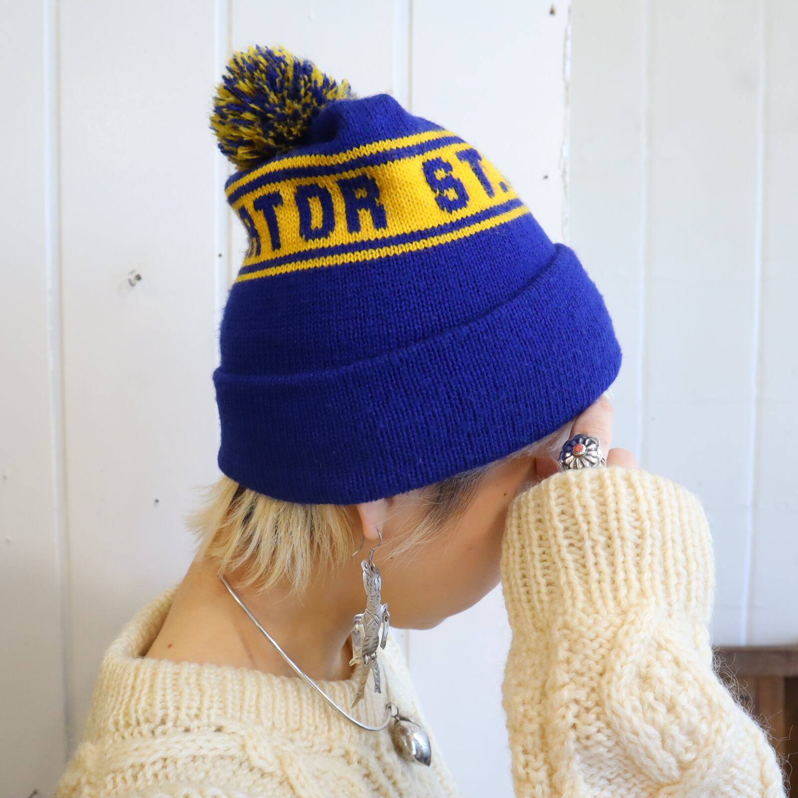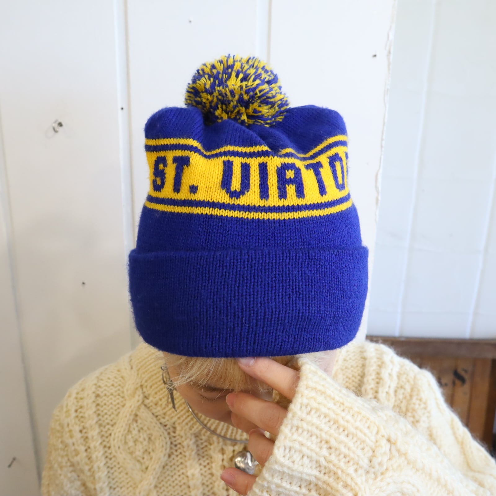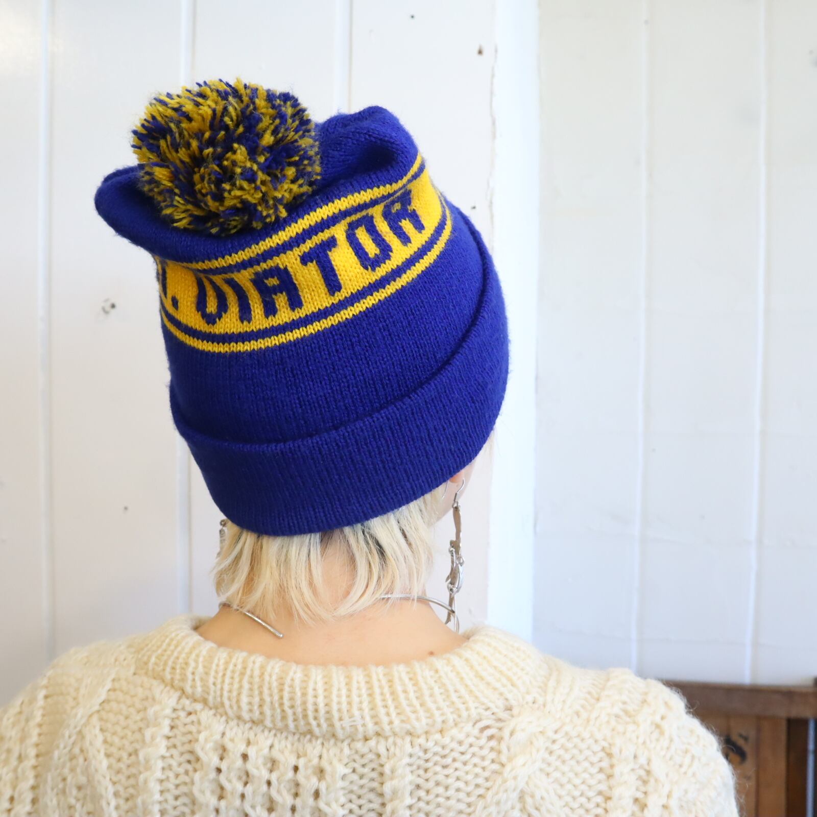 made in USA blue×yellow ponpon knit hat [l-4945]