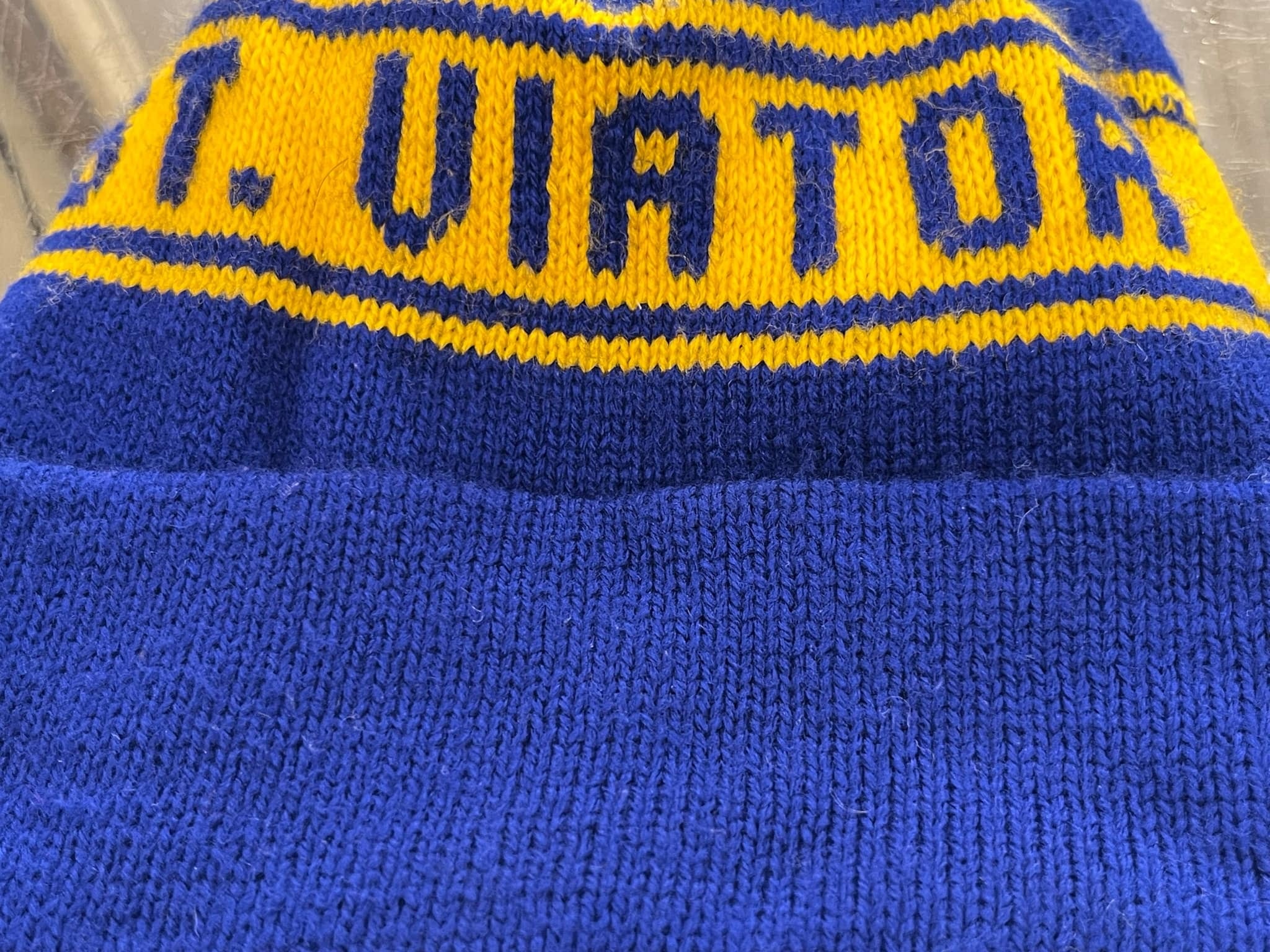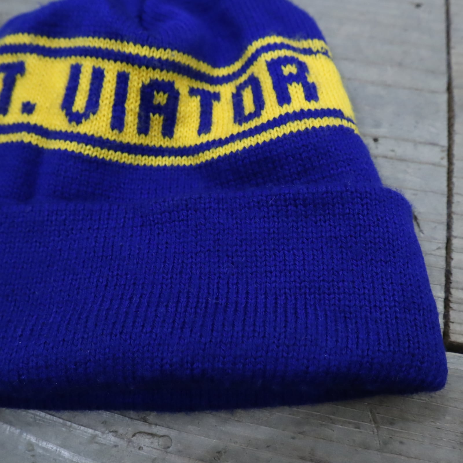 恐らくアメリカの高校名が模様となったニット帽。