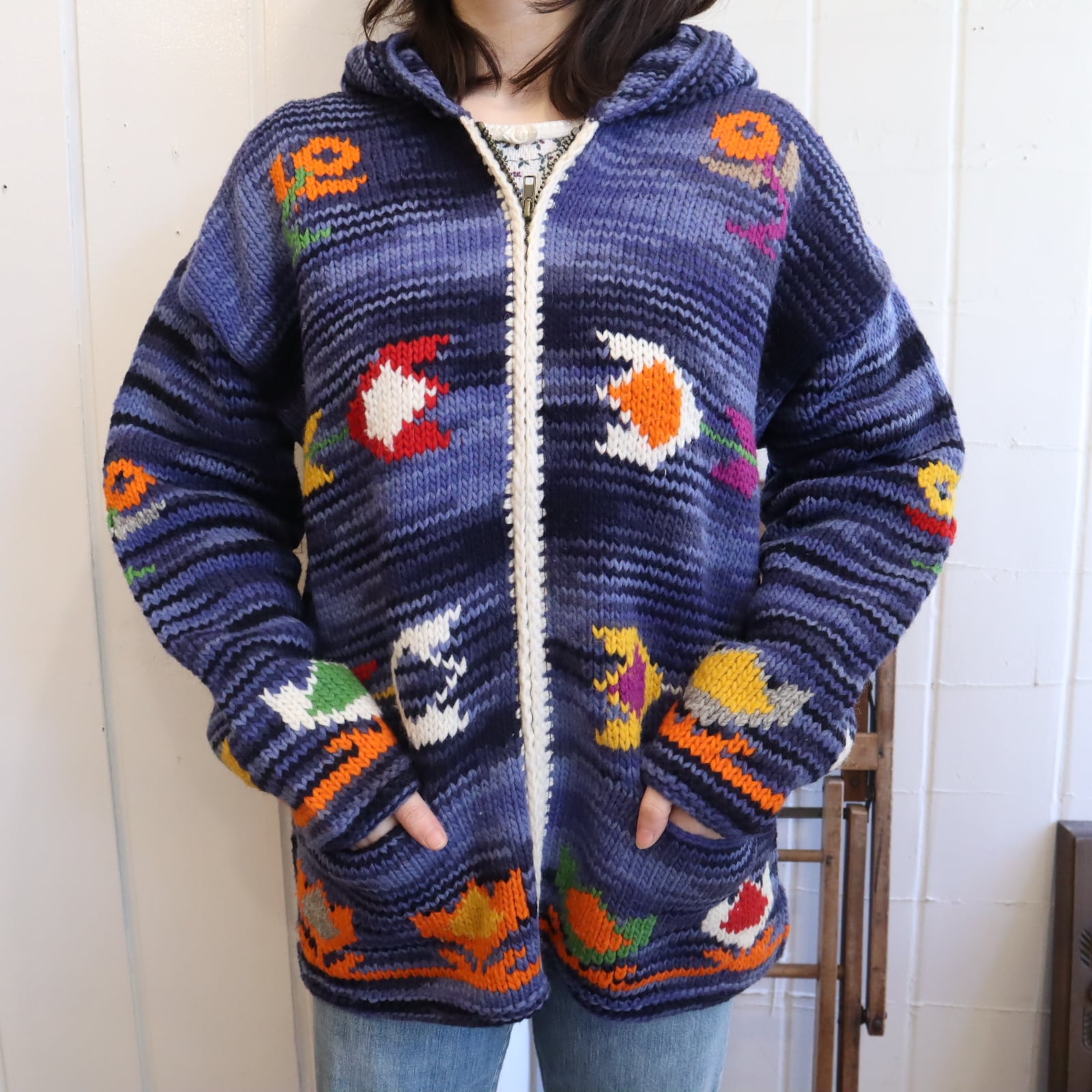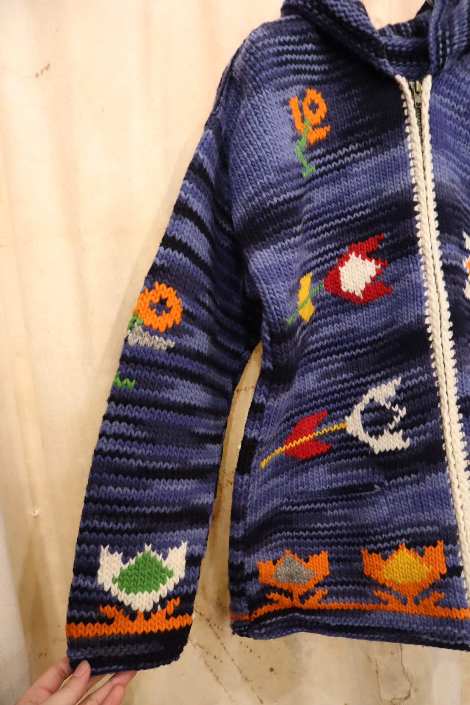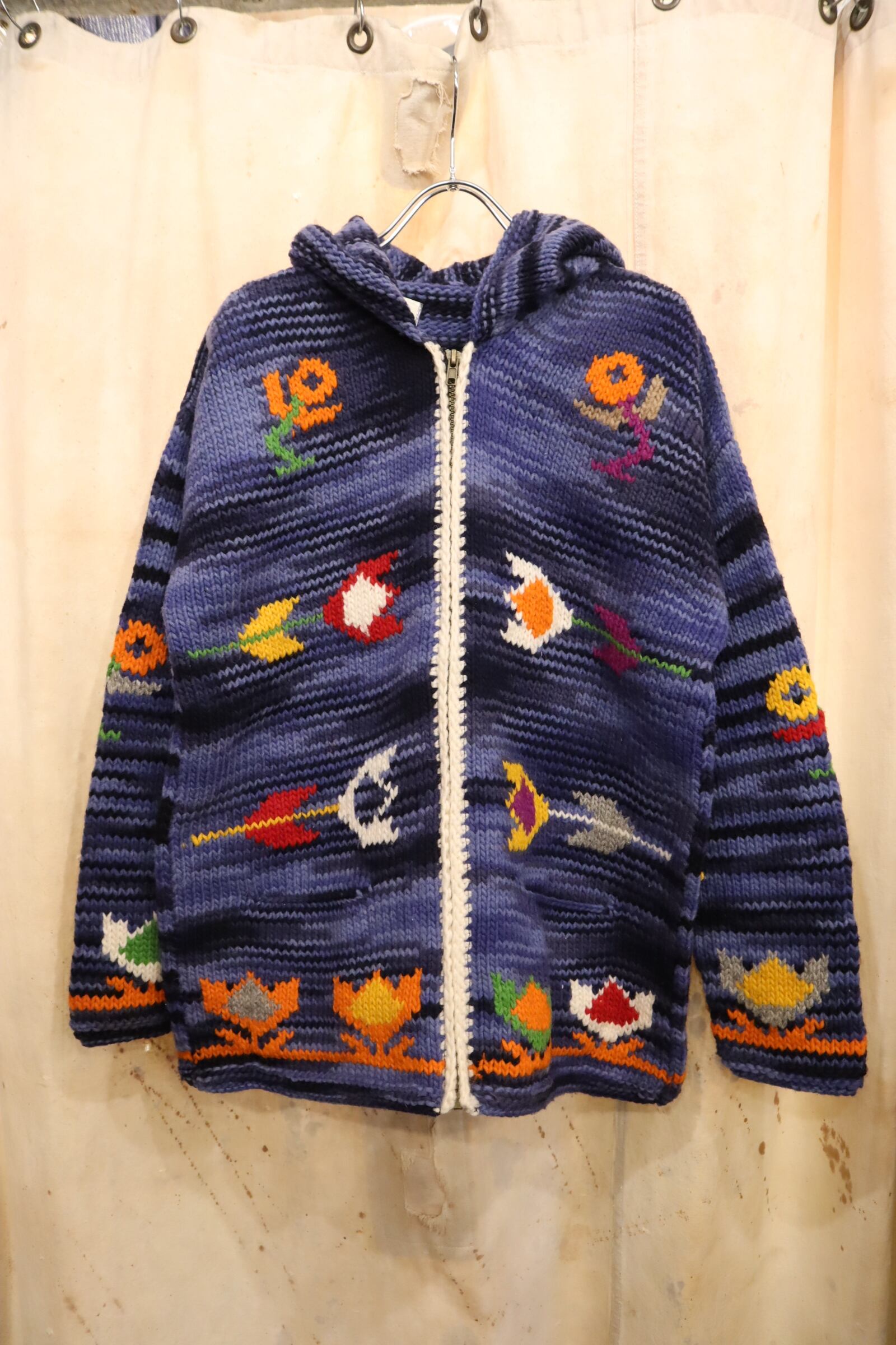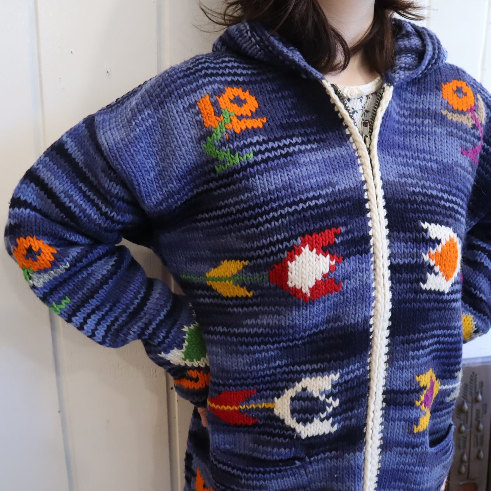 navy×blue×colorful flower fullzip Ecuador knit jacket [l-4950]