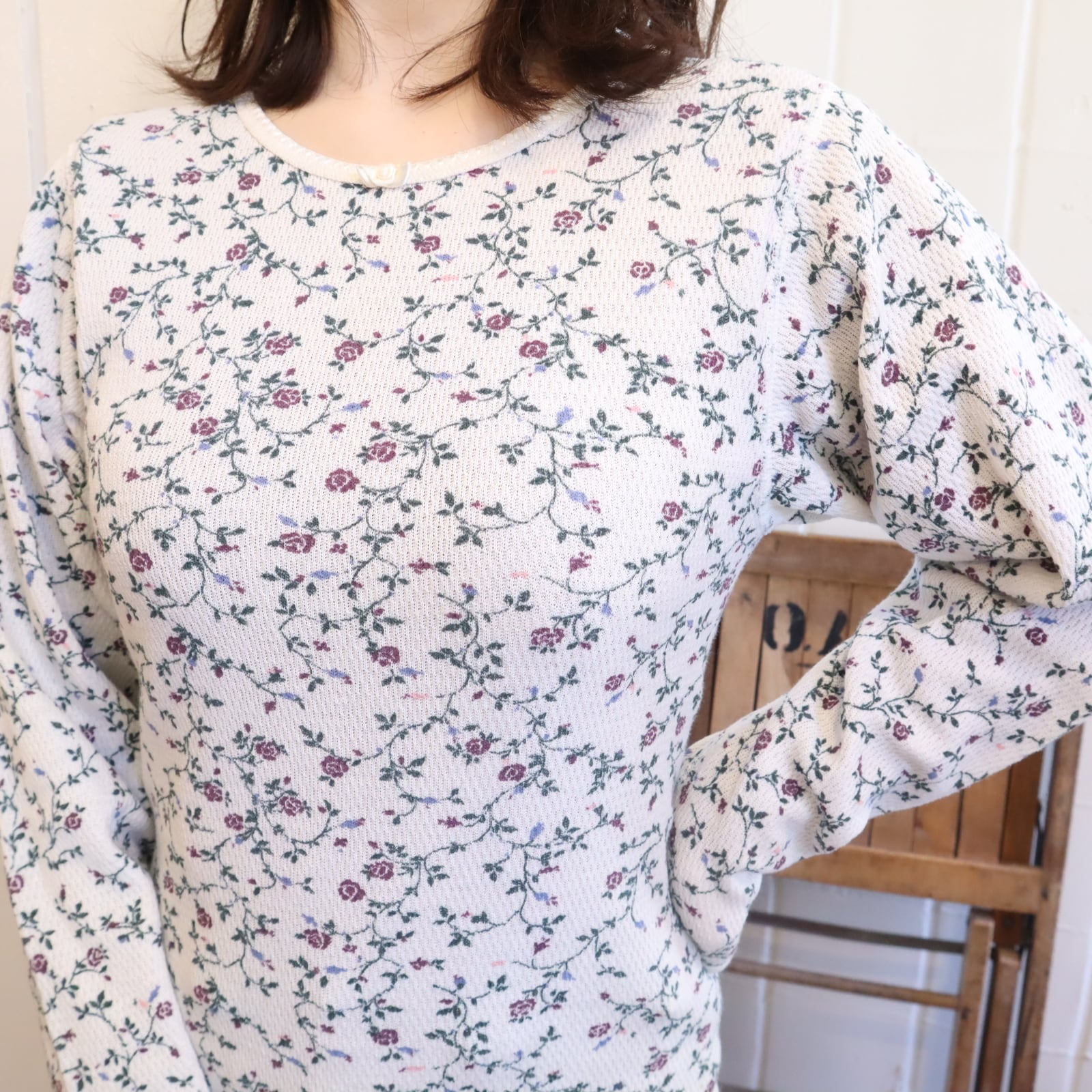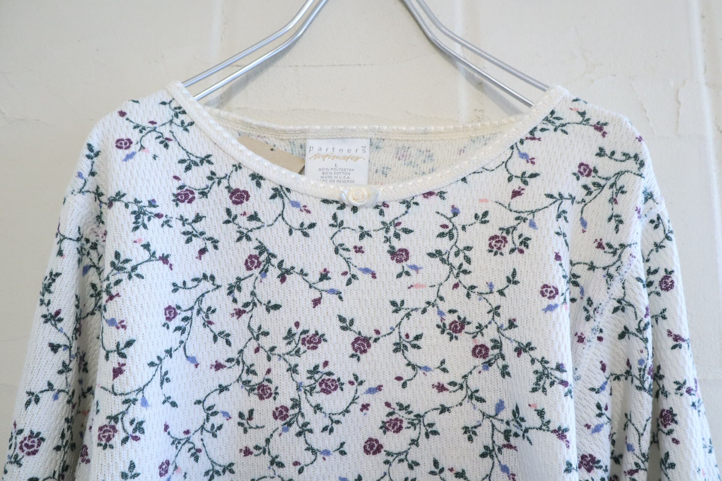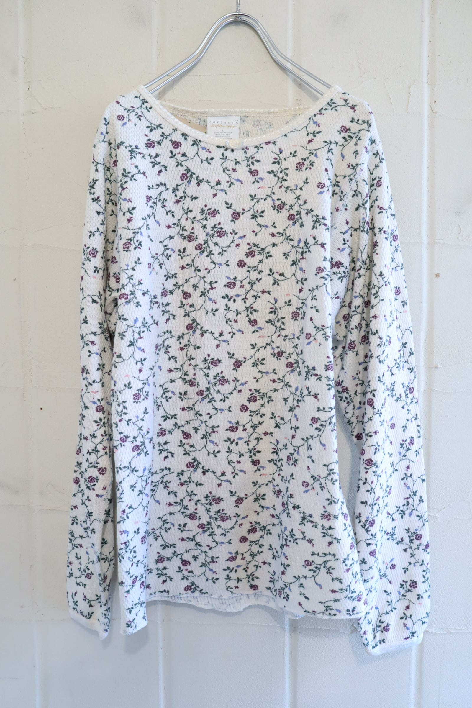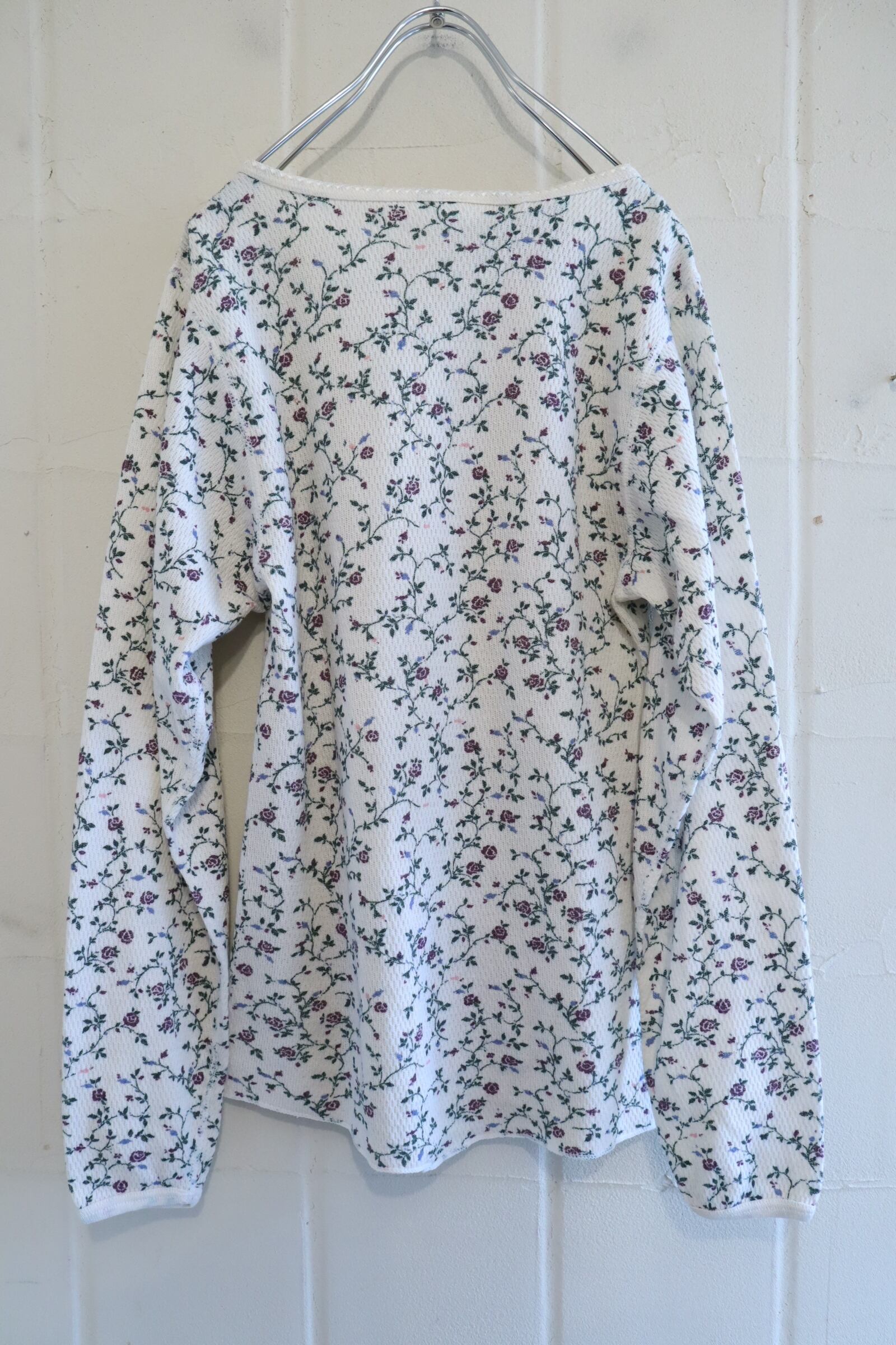 made in USA white×dullgreen rosepattern thermal tops [l-4953]
