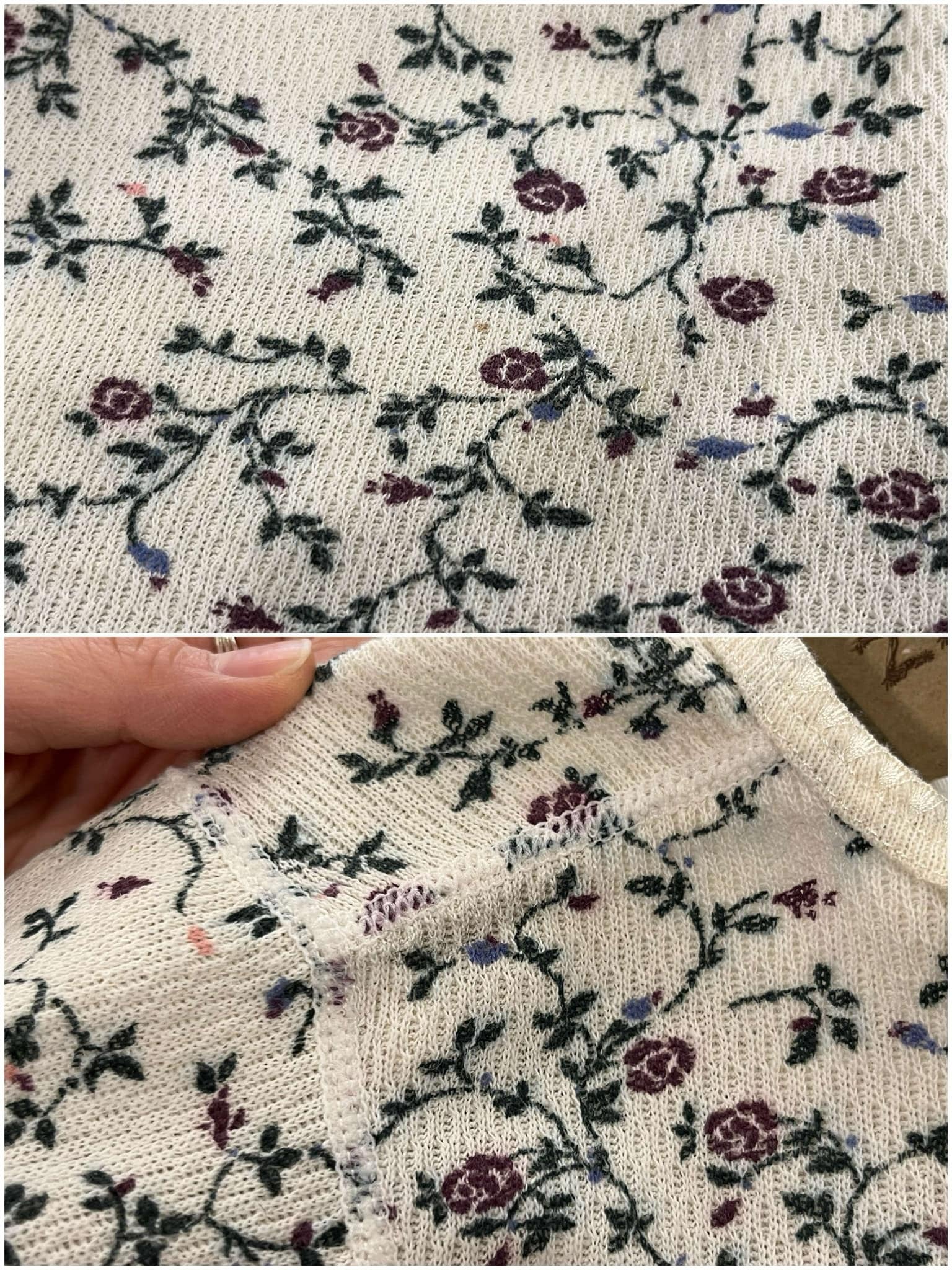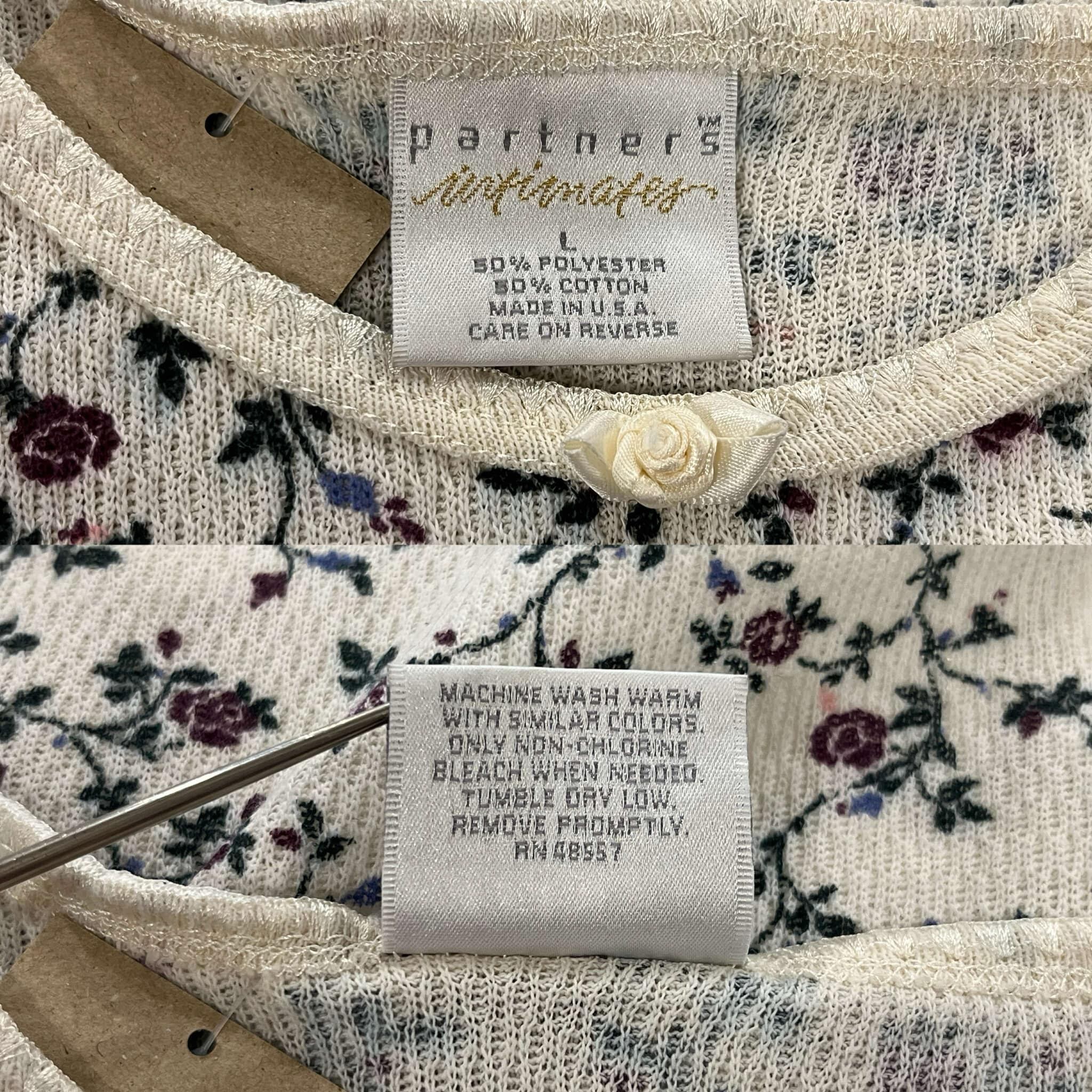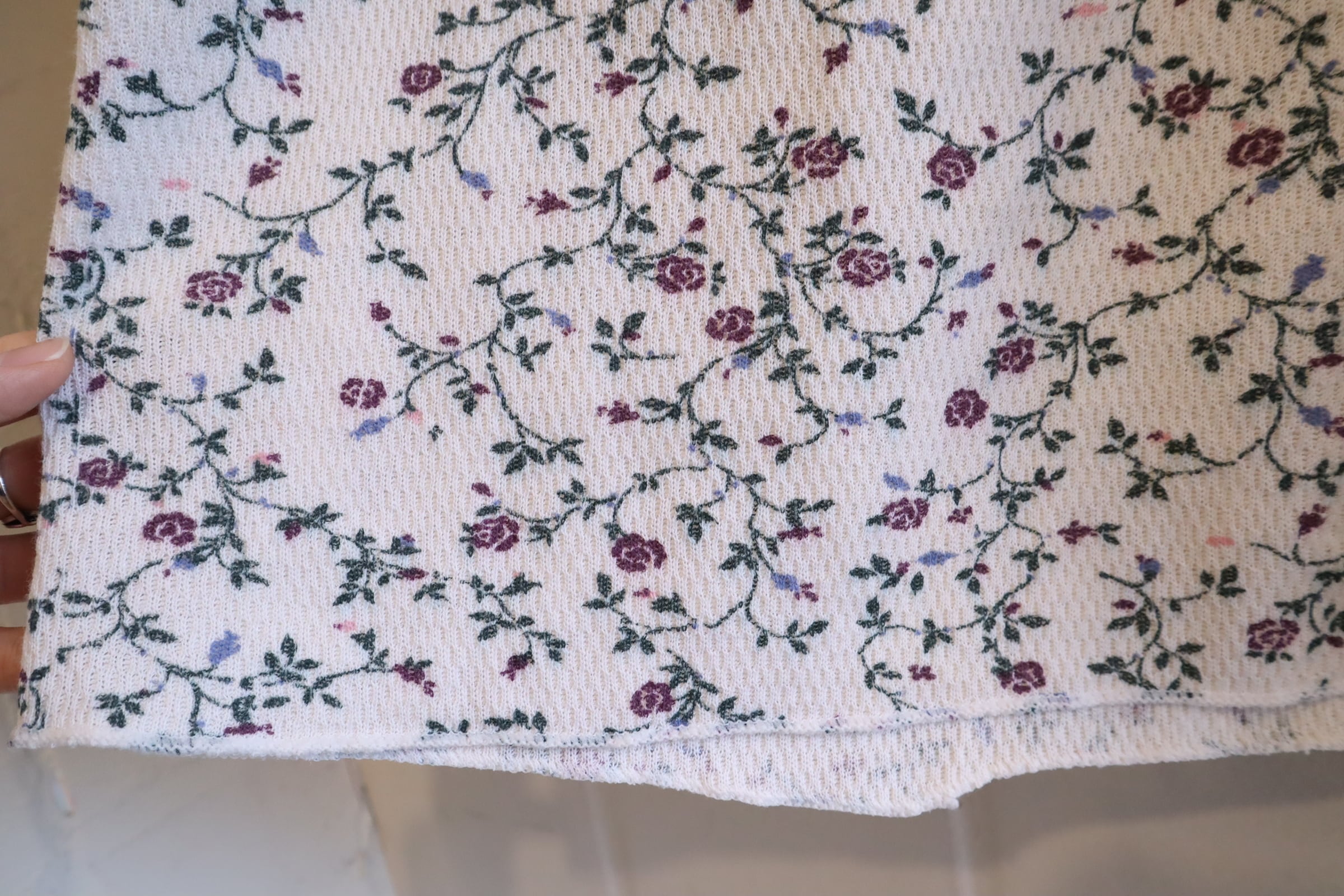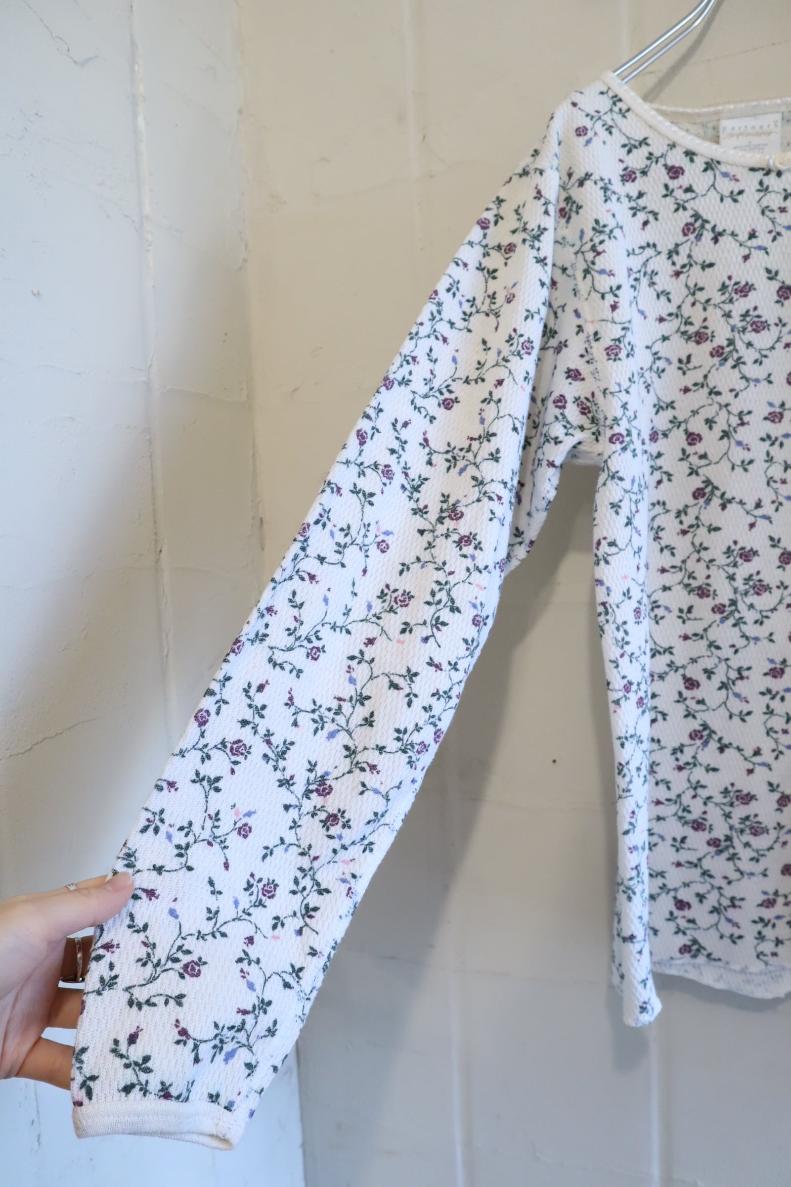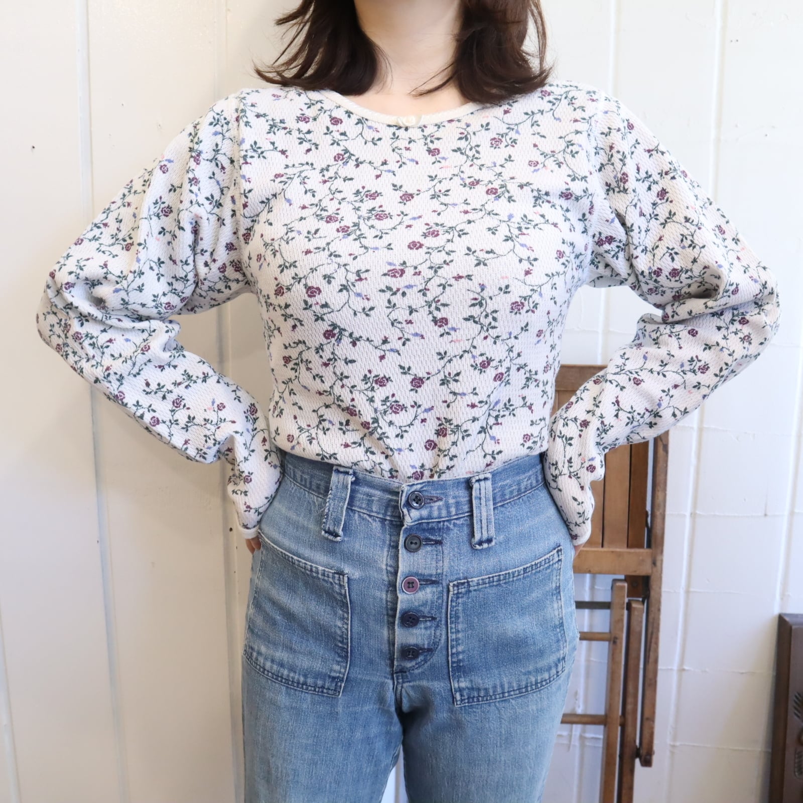 made in USA white×dullgreen rosepattern thermal tops [l-4953]
