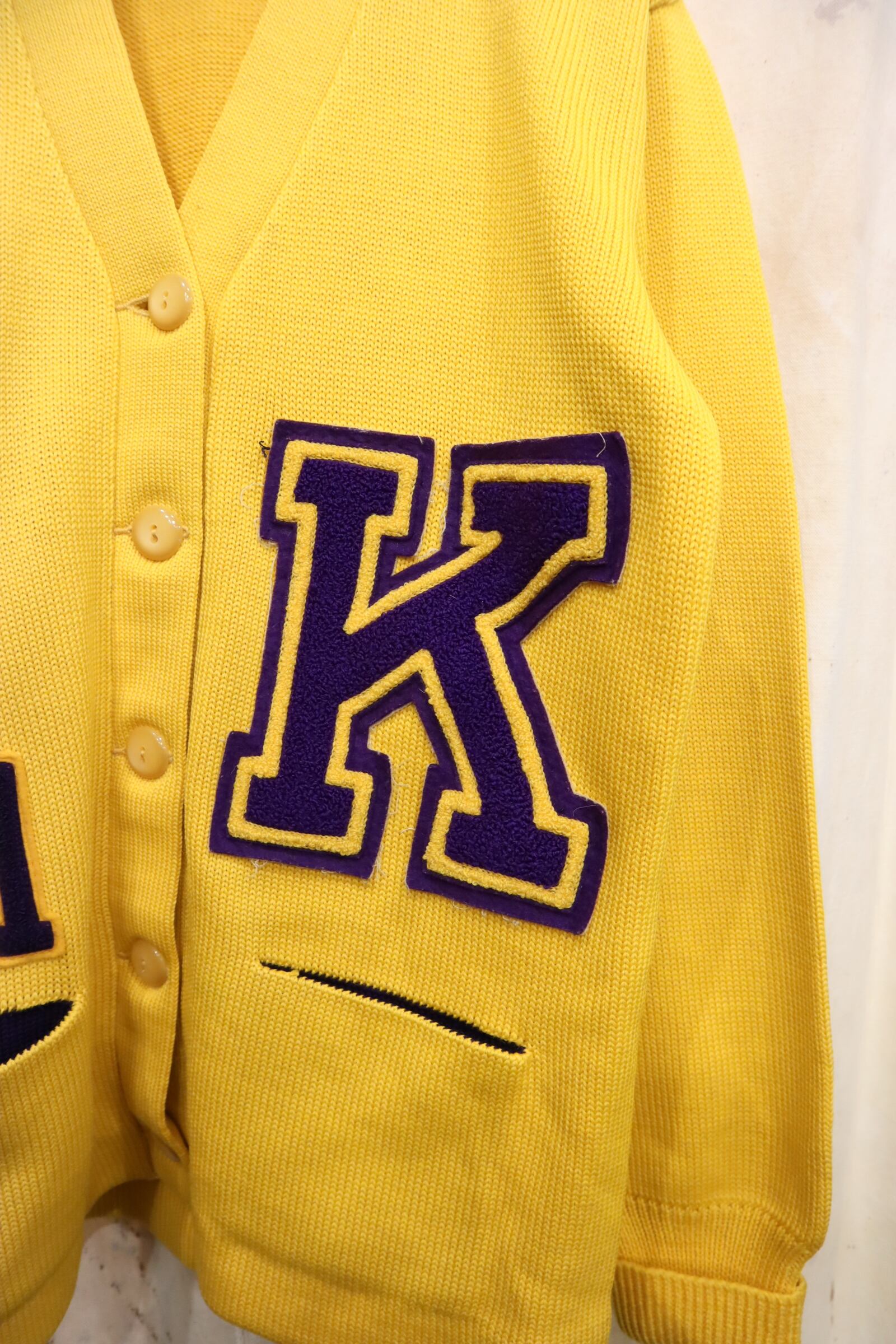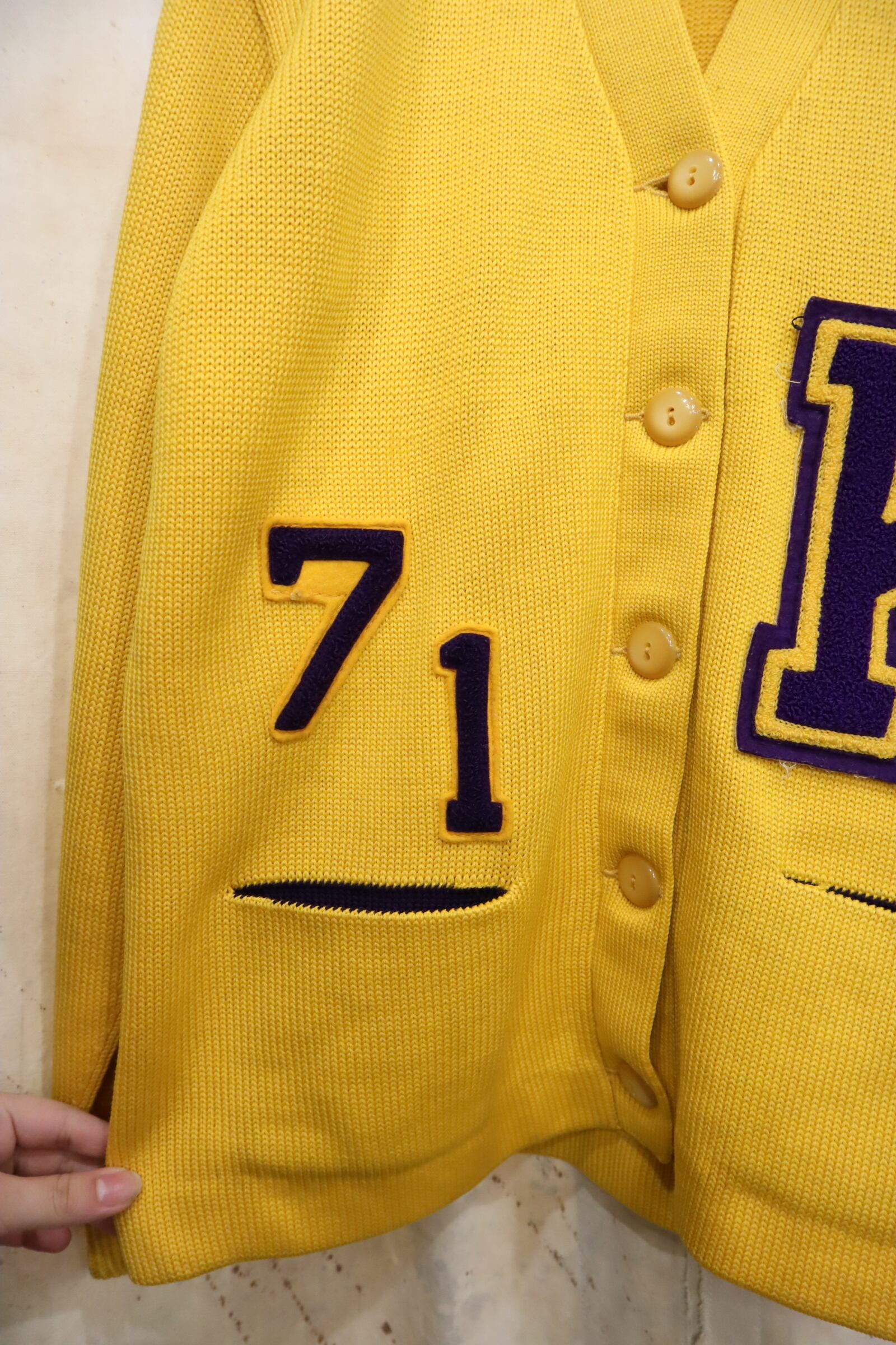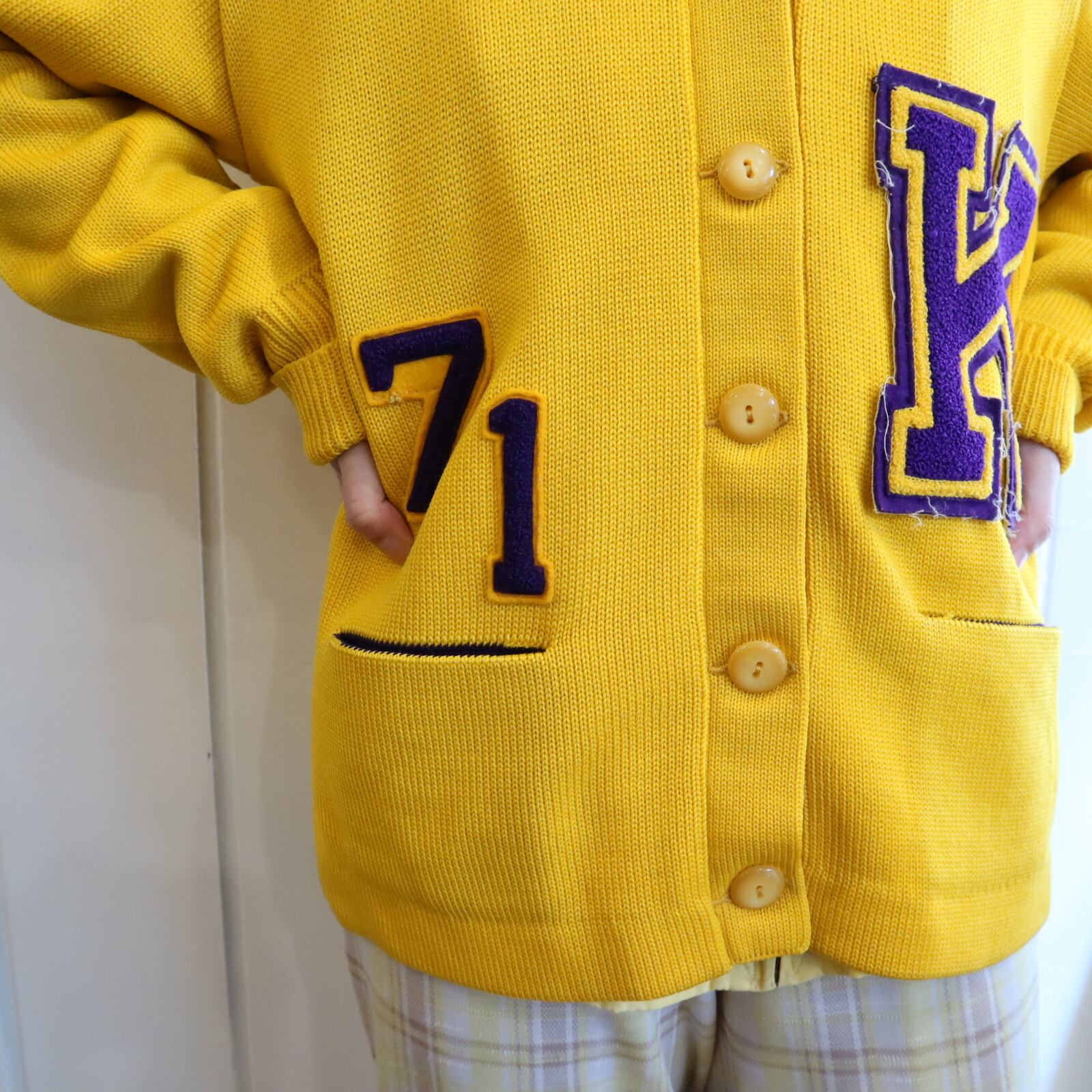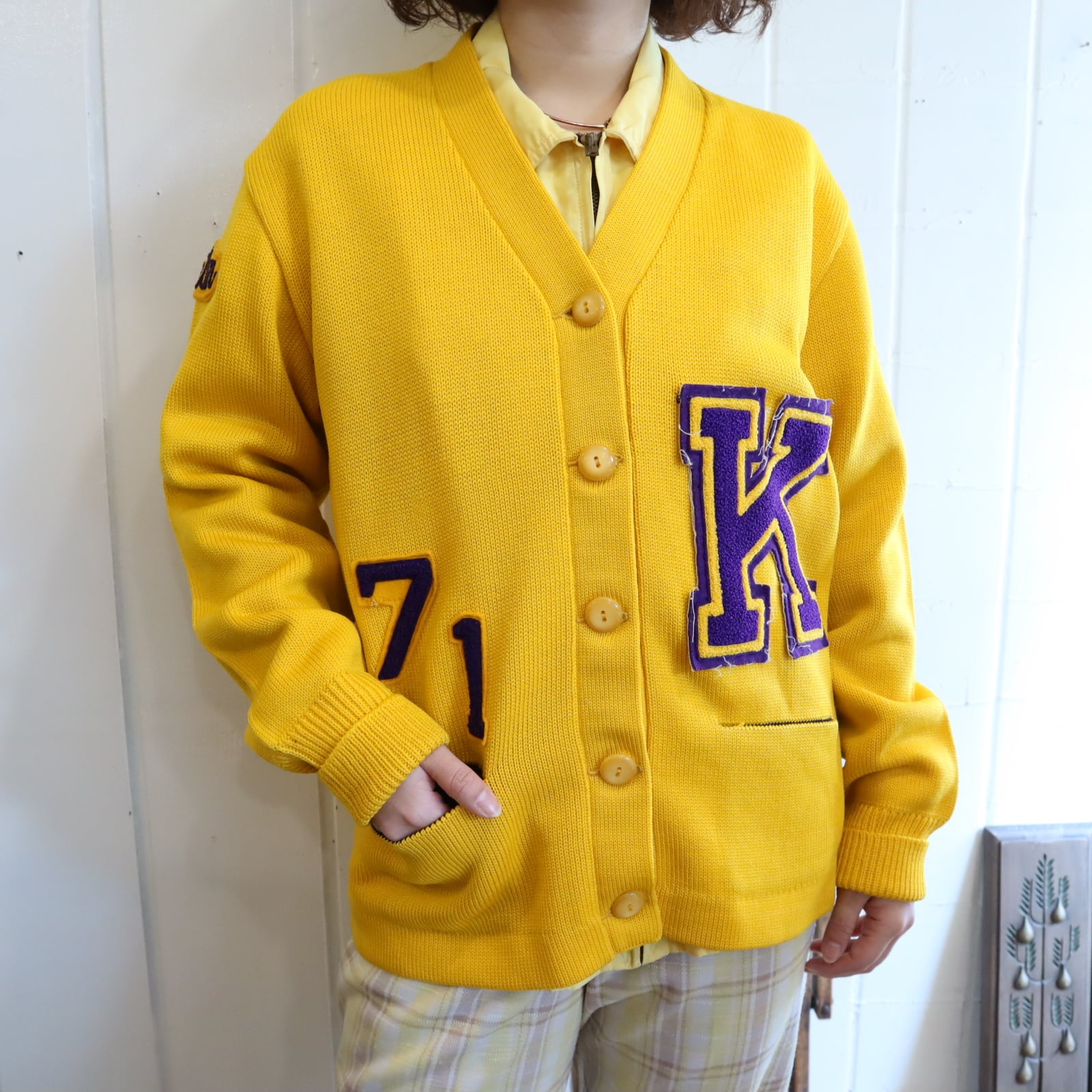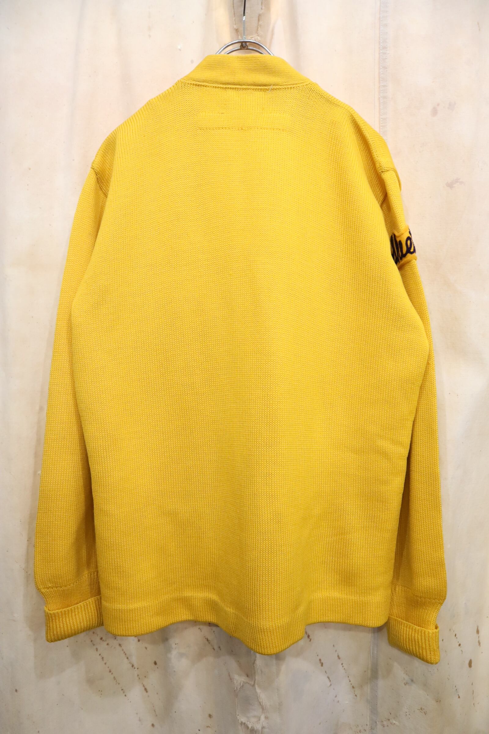 60s-70s yellow×purple lettered wappen knit cardigan [l-4969]