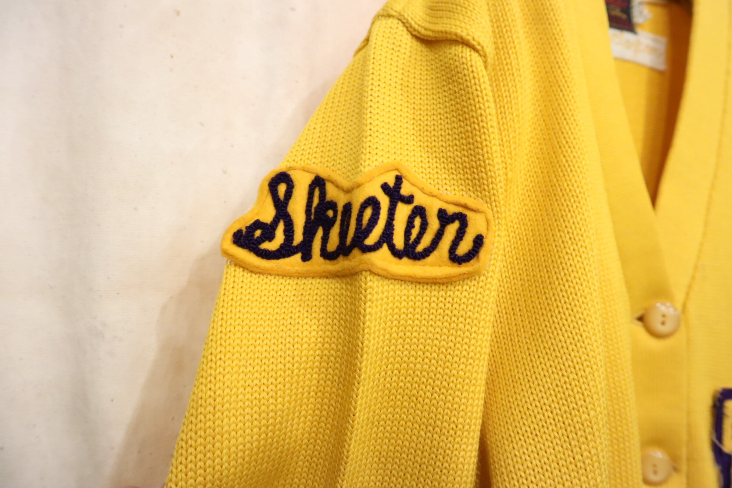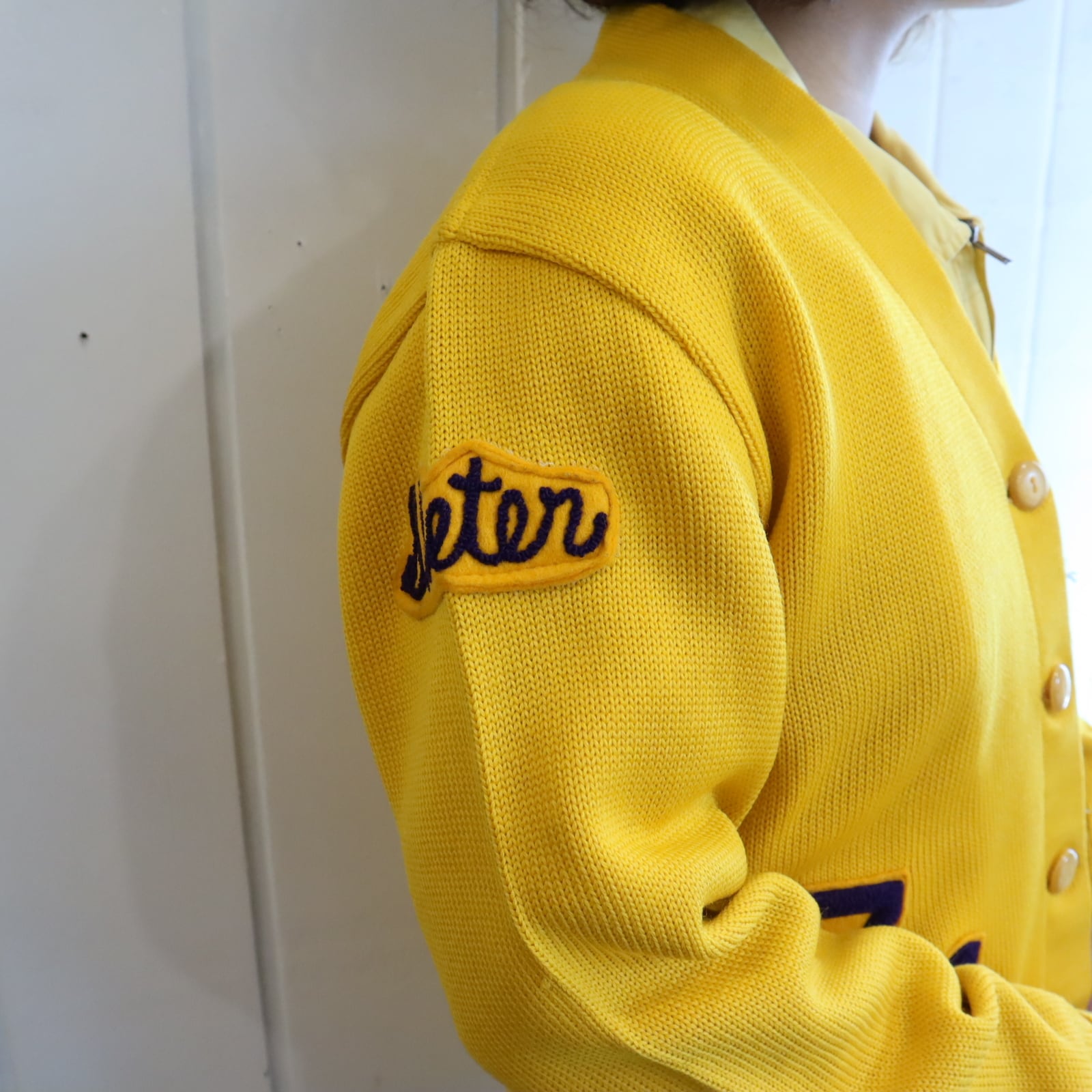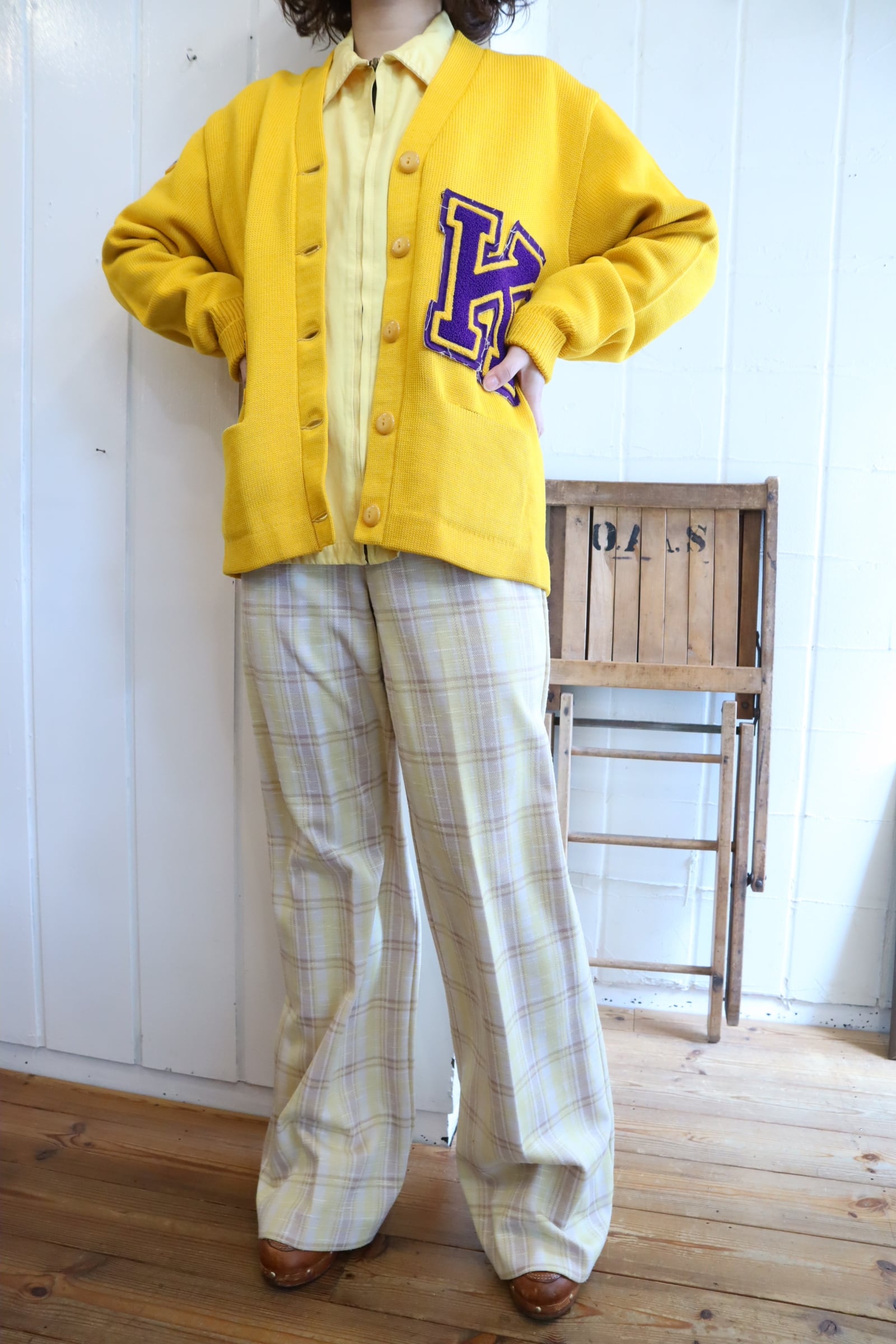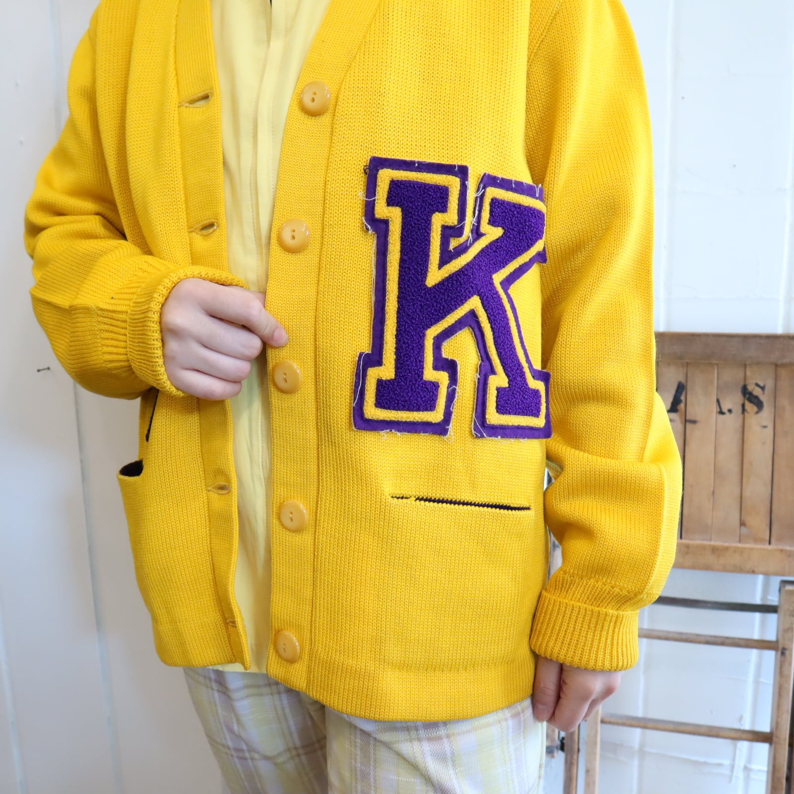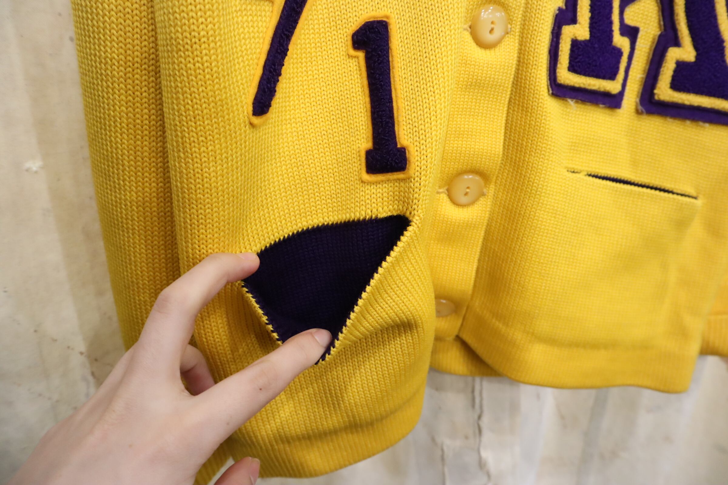 60s-70s yellow×purple lettered wappen knit cardigan [l-4969]