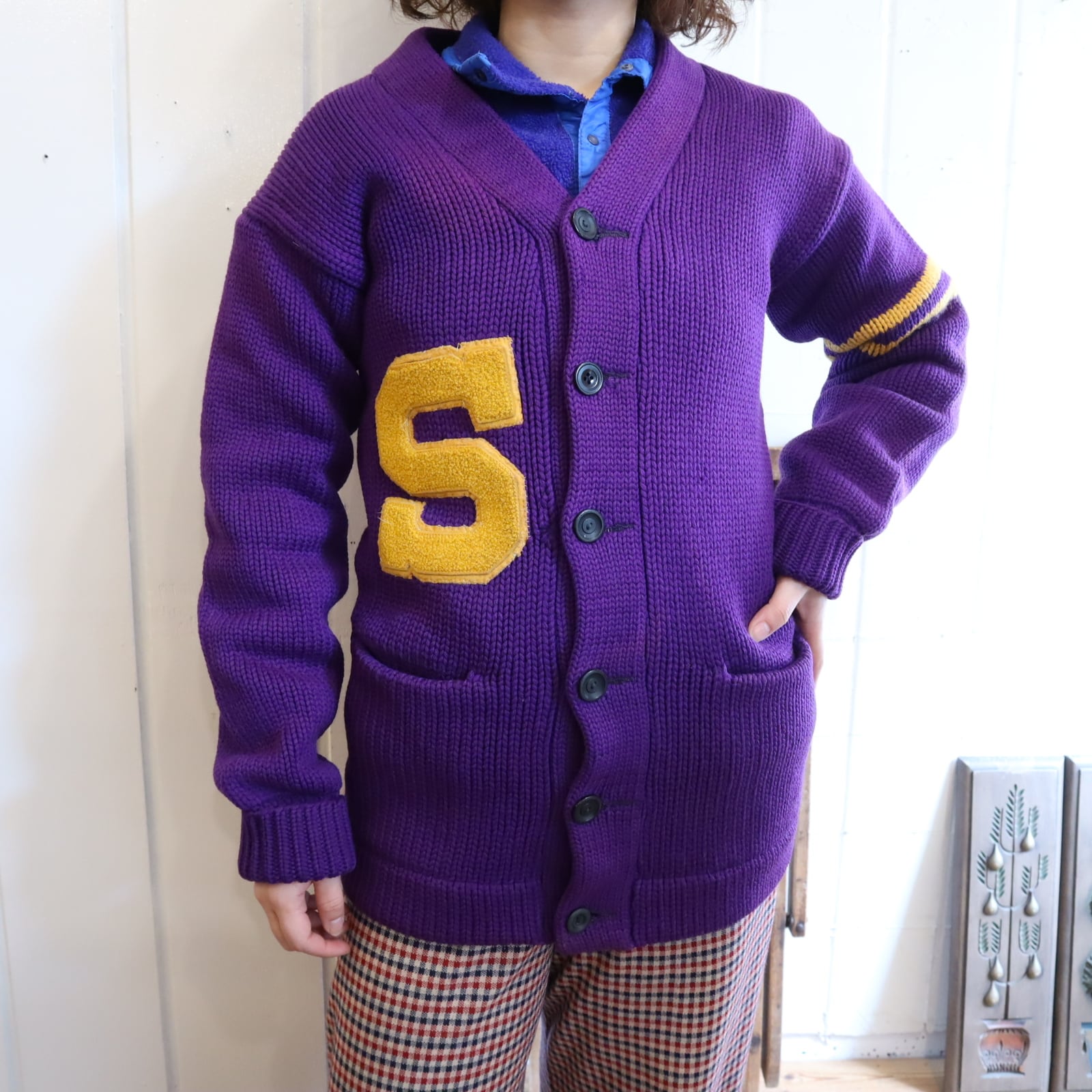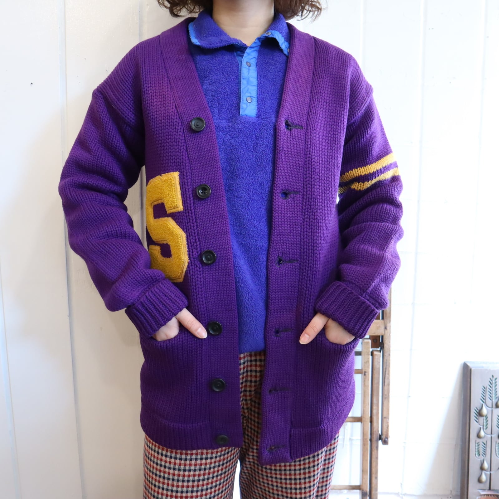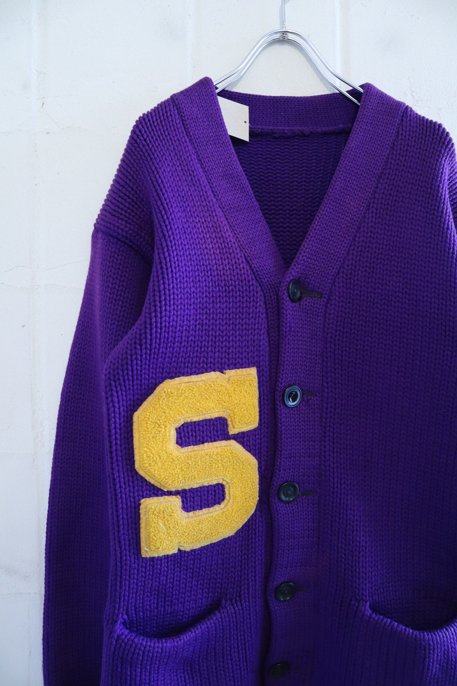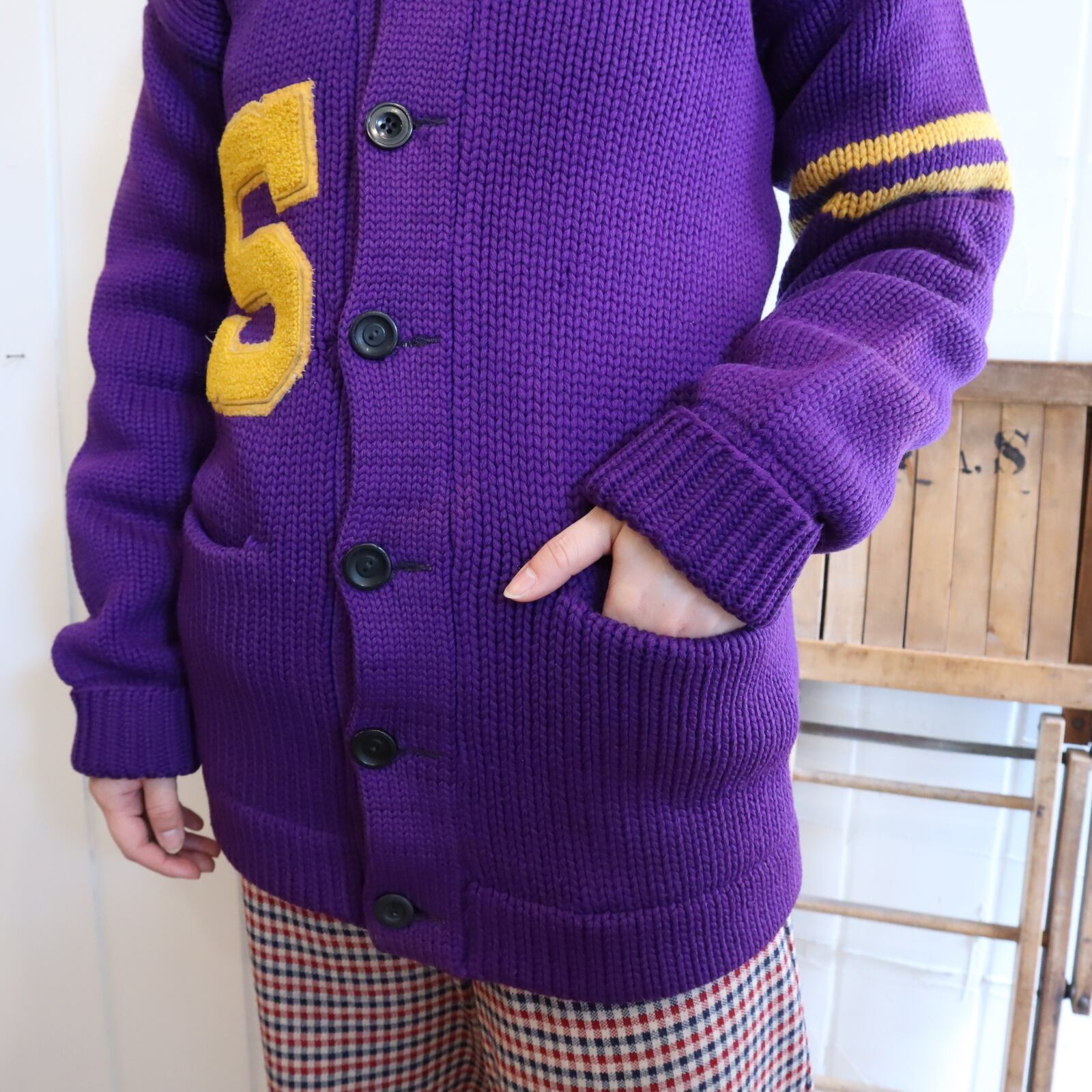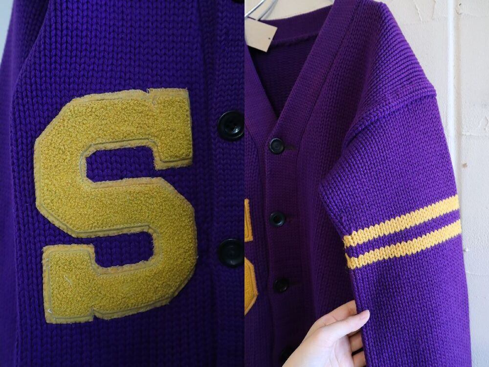 無地の割合が多いヴィンテージレタードニットカーディガン。