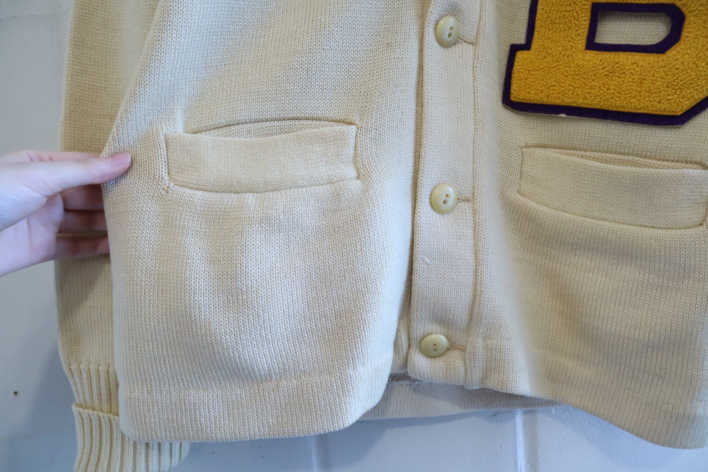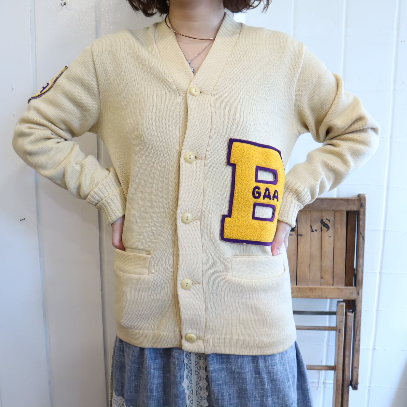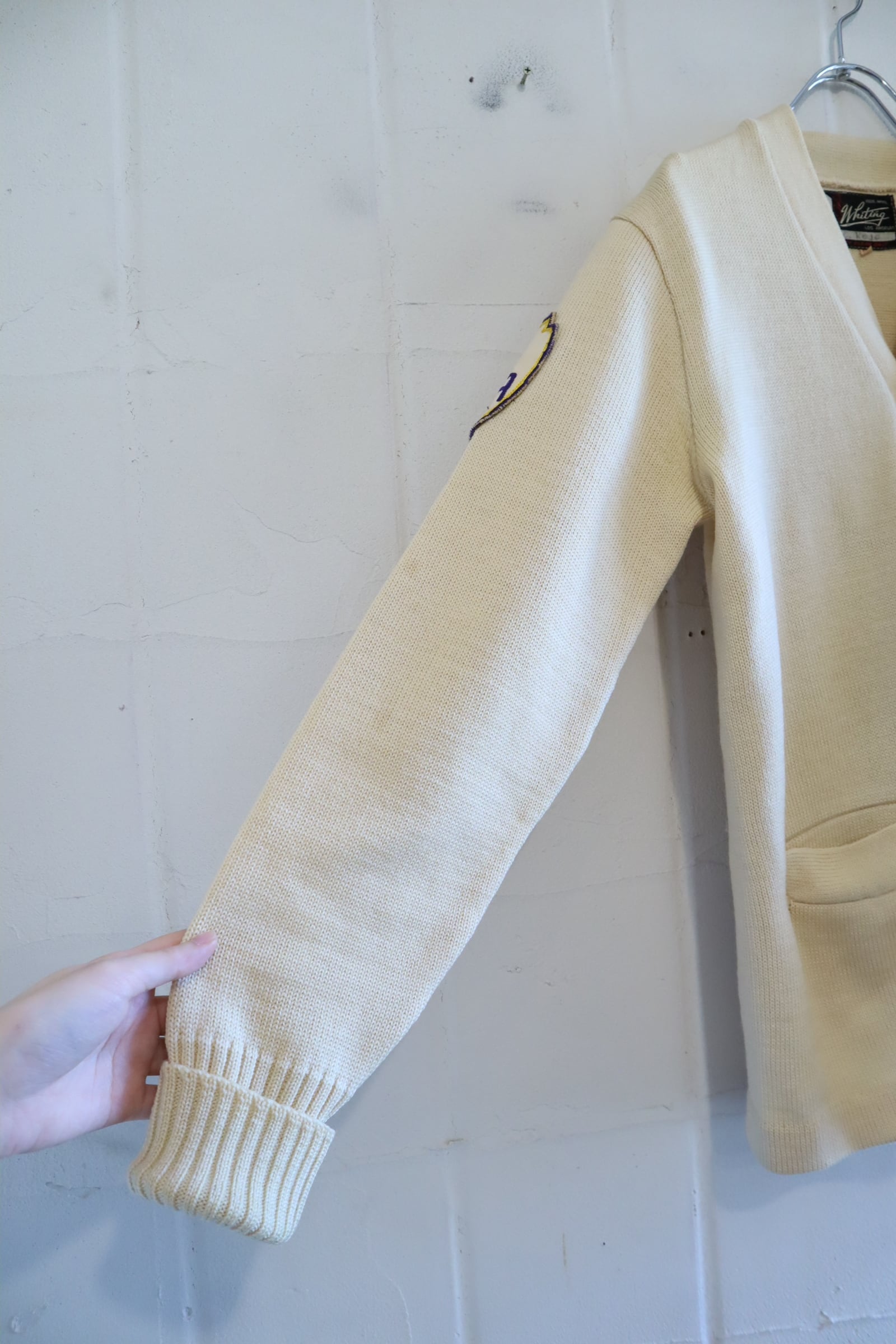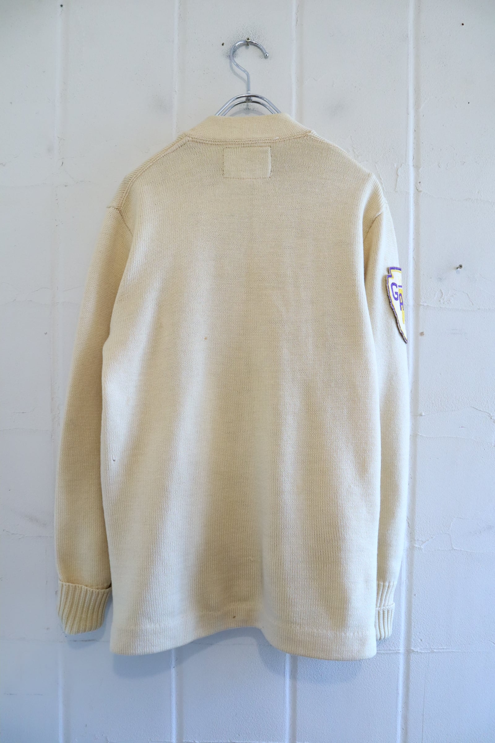 50s-60s offwhite×yellow lettered wappen knit cardigan [l-4975]