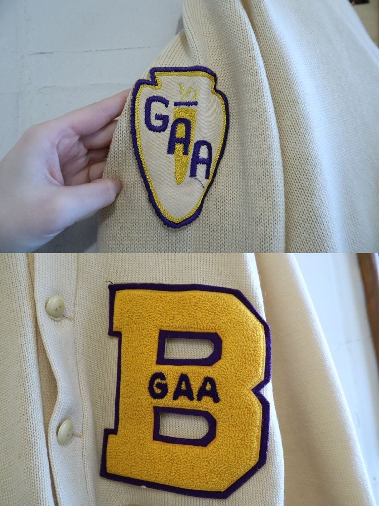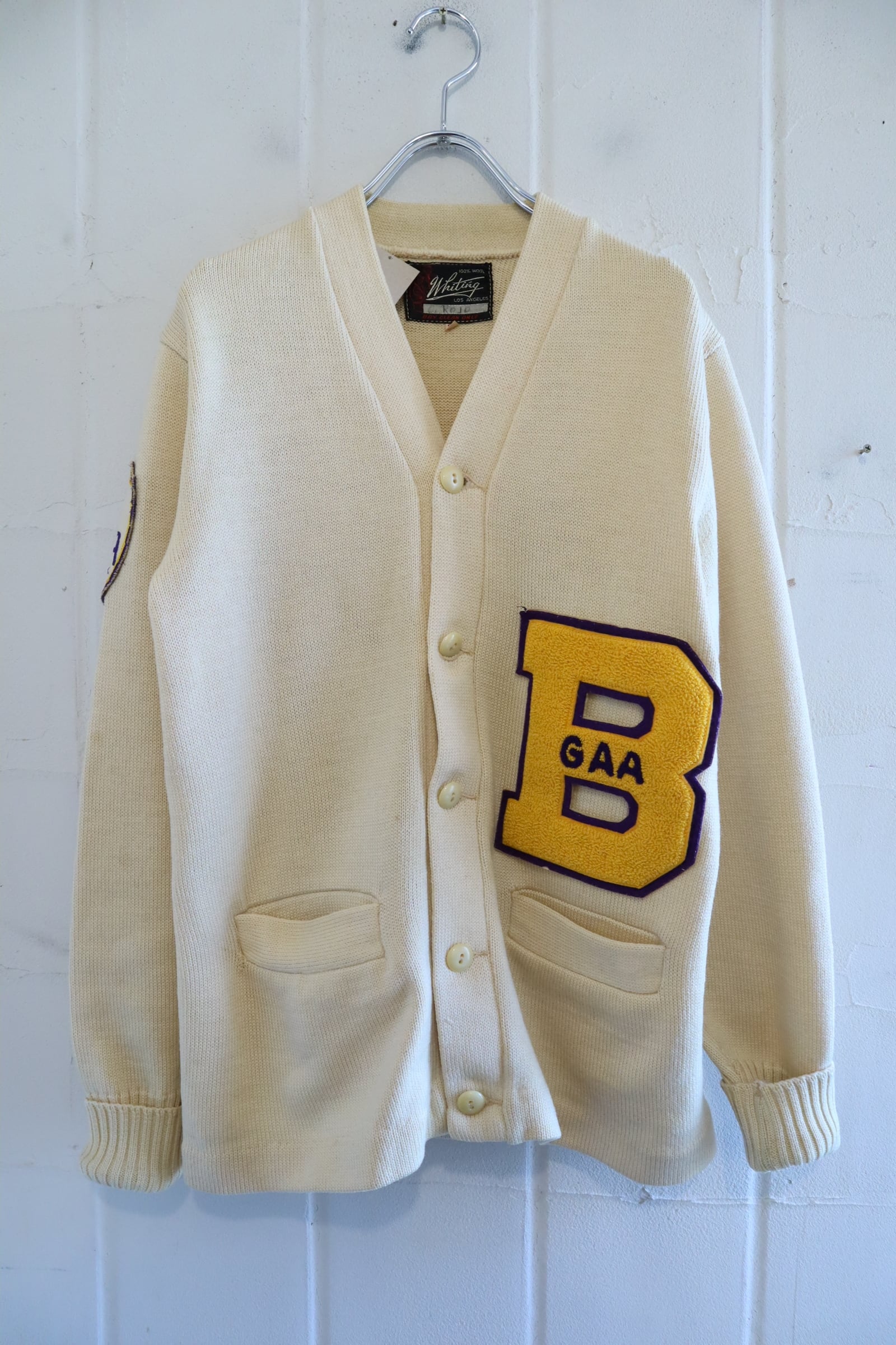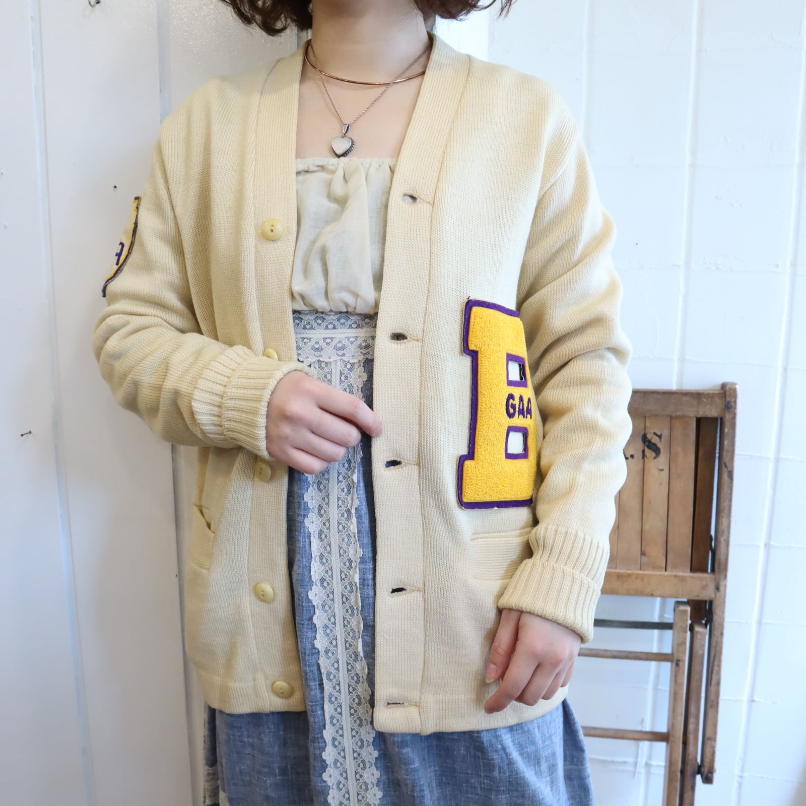 50s-60s offwhite×yellow lettered wappen knit cardigan [l-4975]
