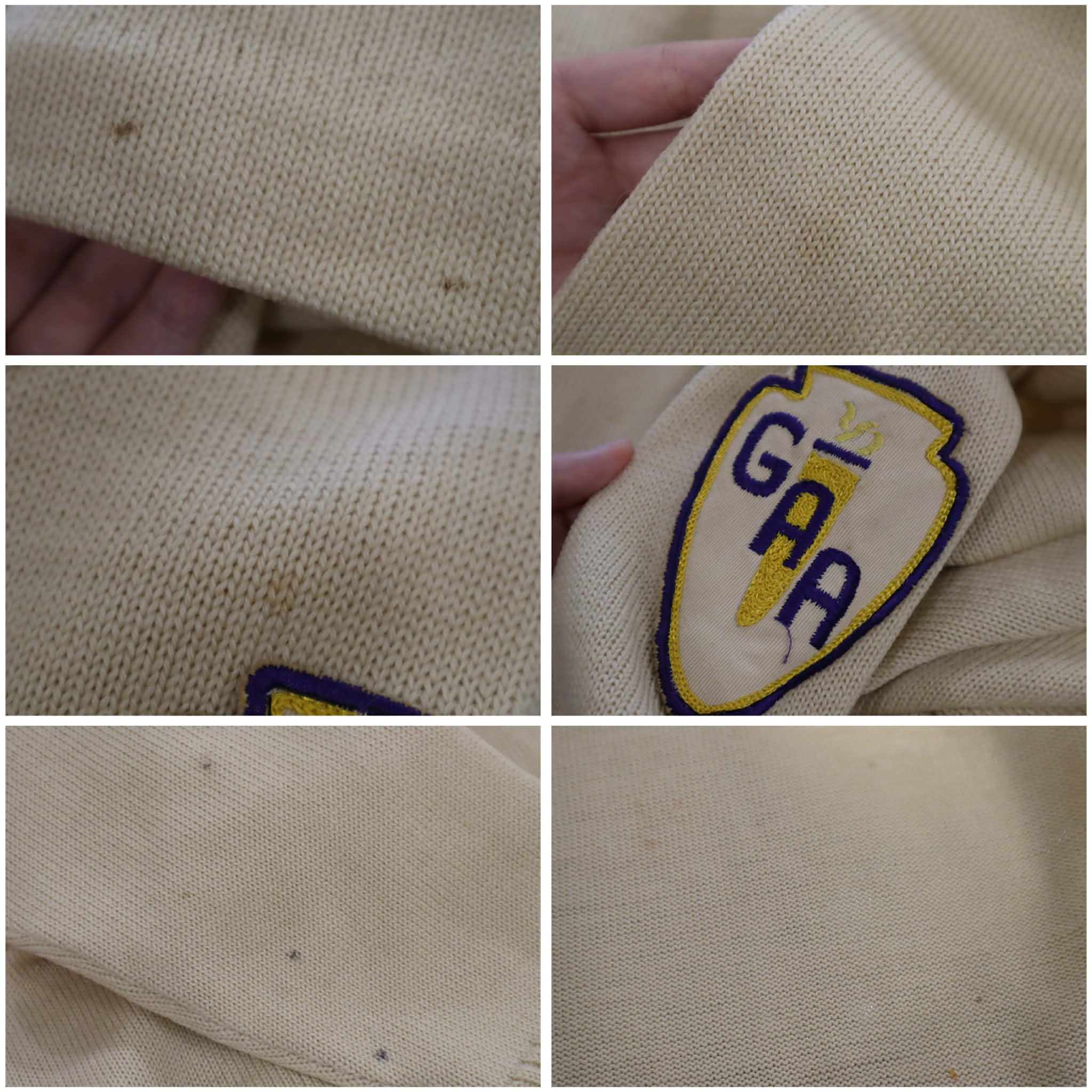 いくつかシミや汚れ、ワッペンにやや色移りと糸のホツレがございます。