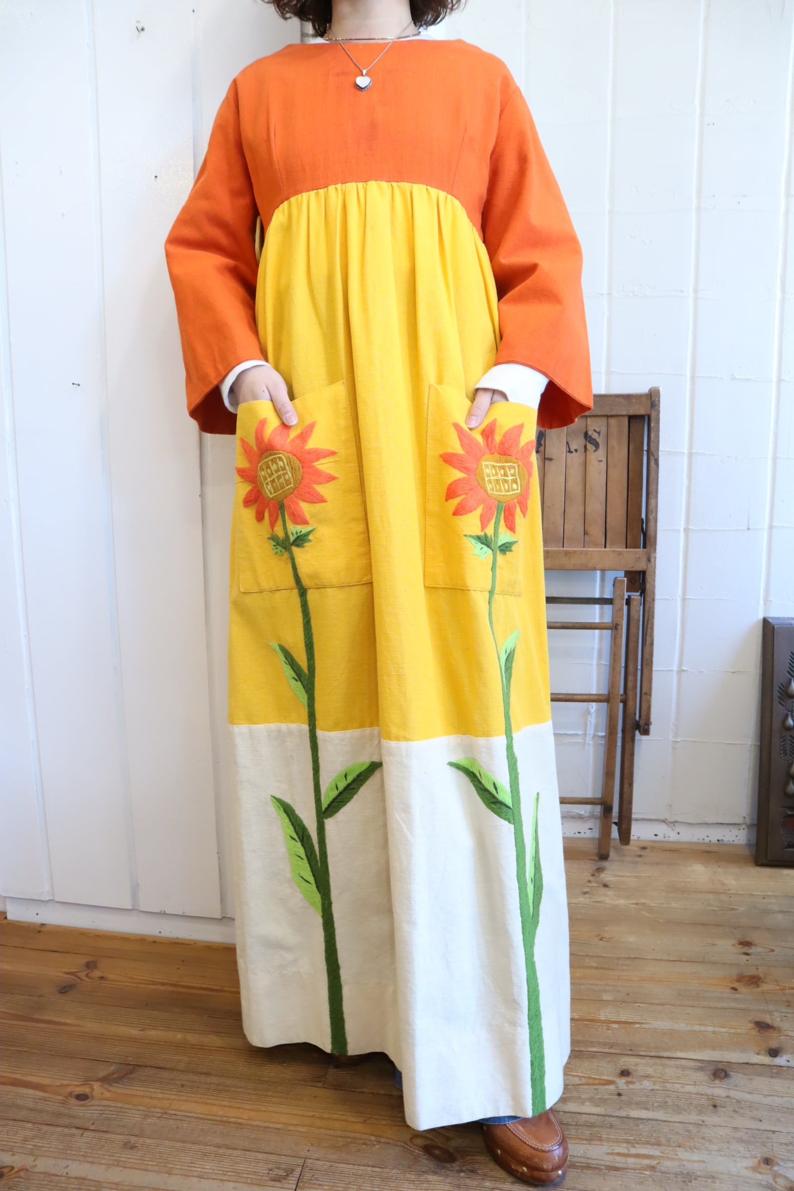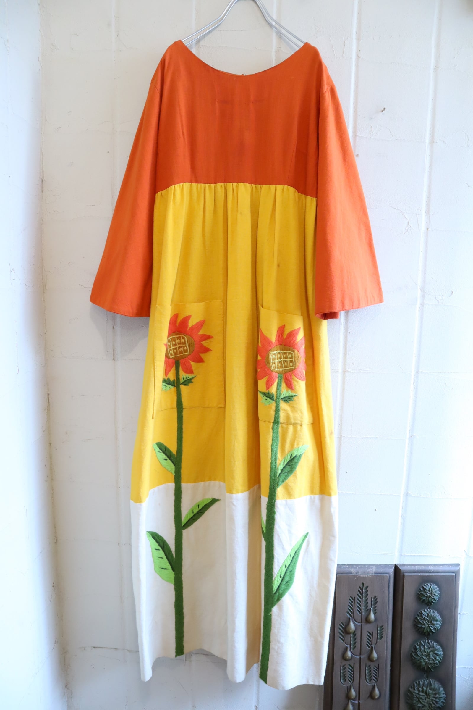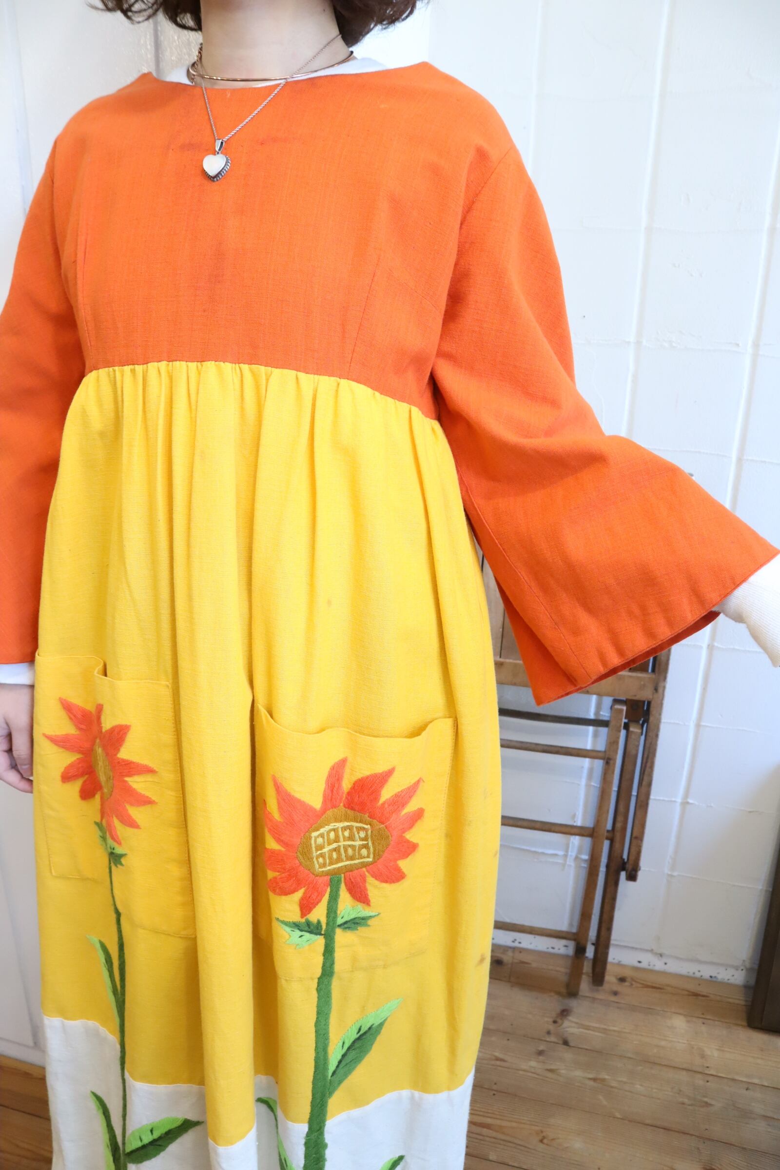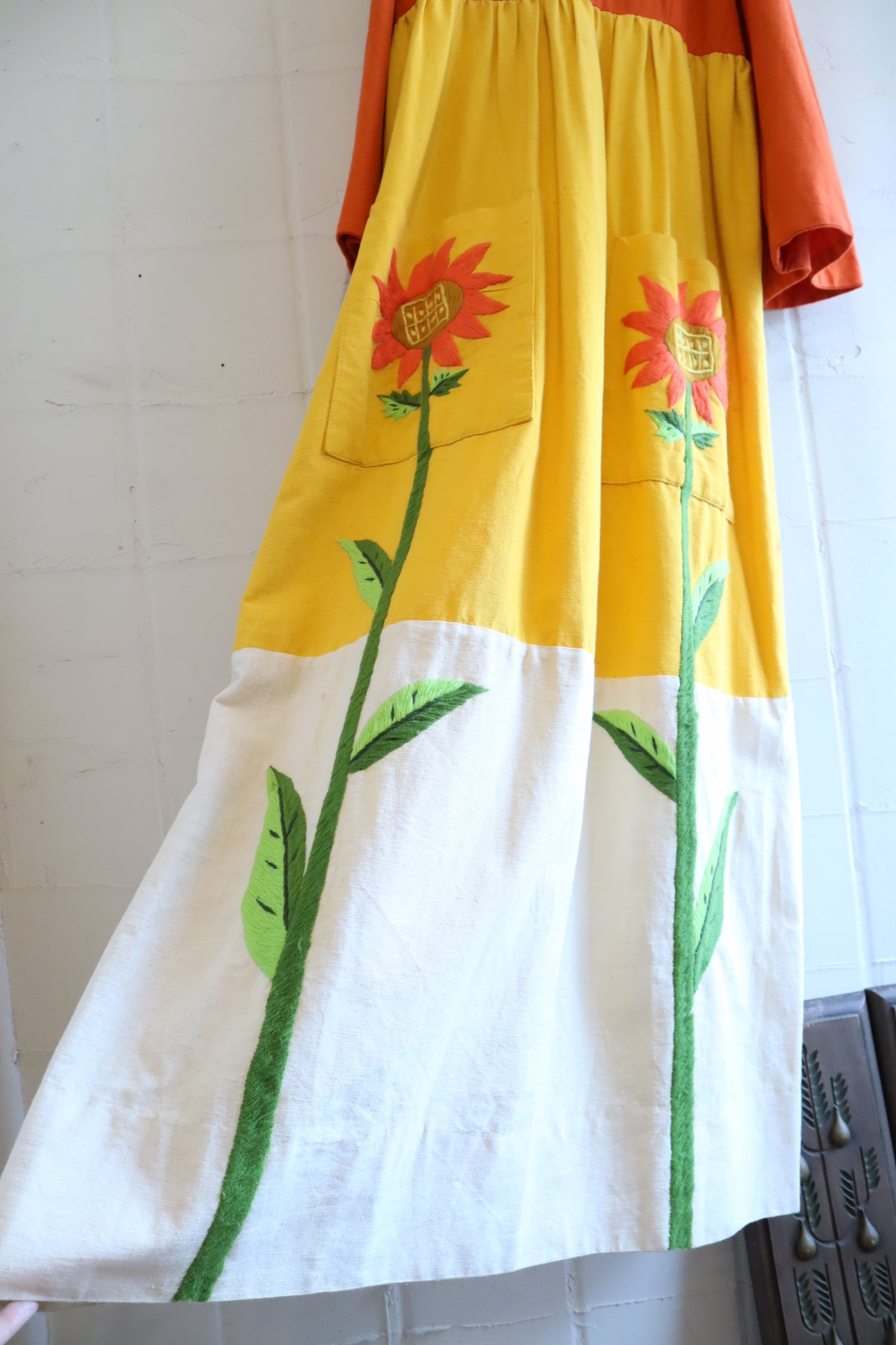 70s orange×yellow sunflower embroidery Mexican dress [l-4977]